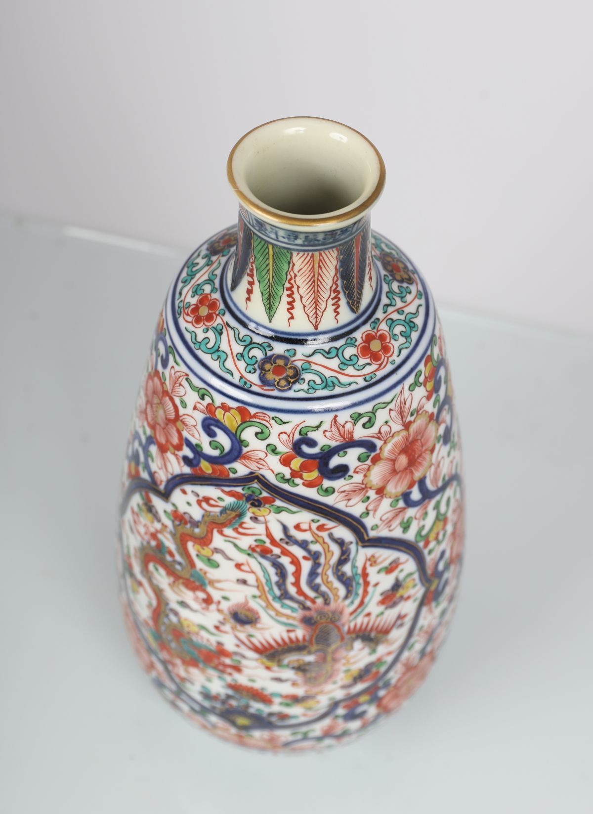 each of pear shape with all-over floral decoration, enclosing dragon, and phoenix panels.