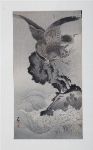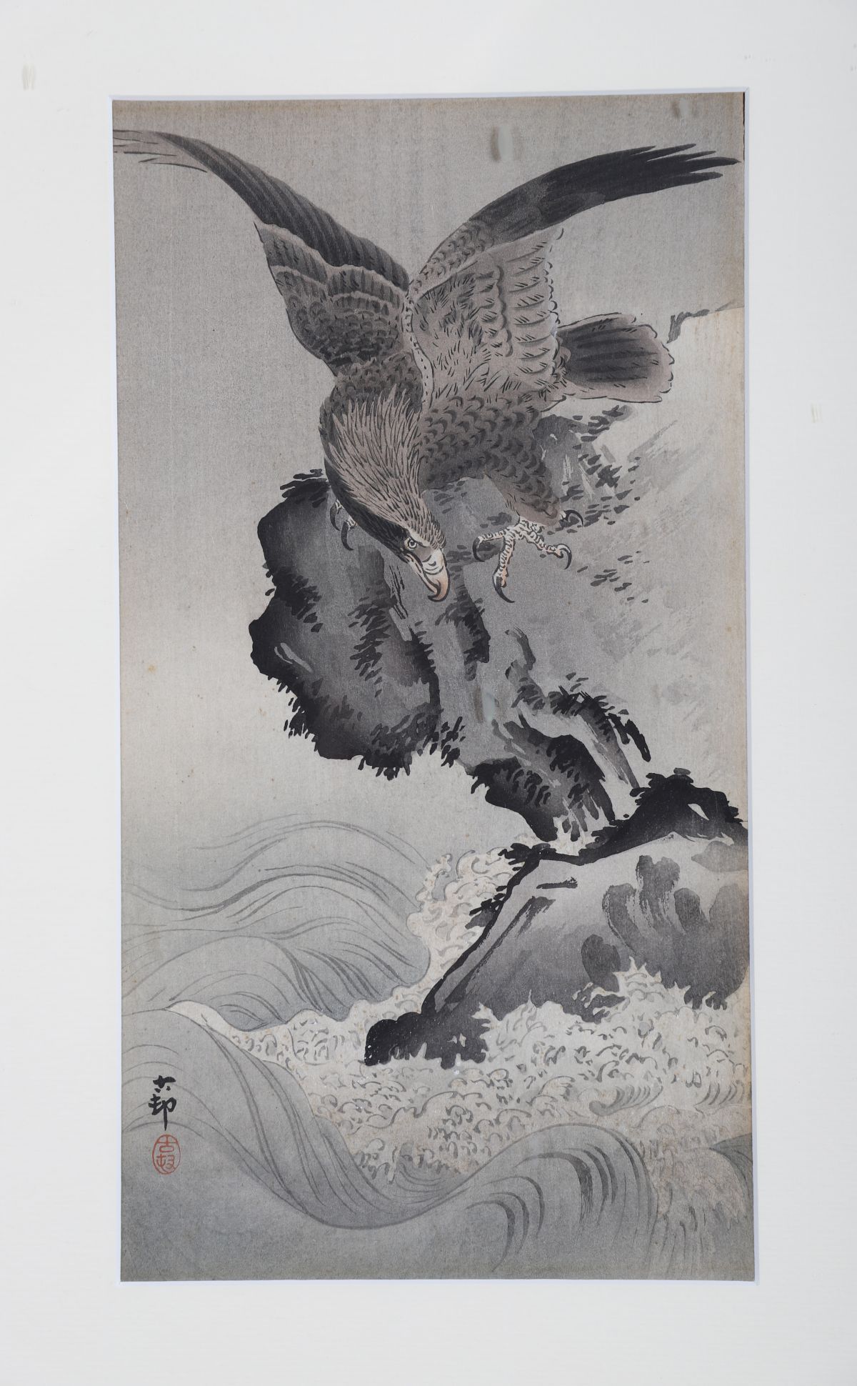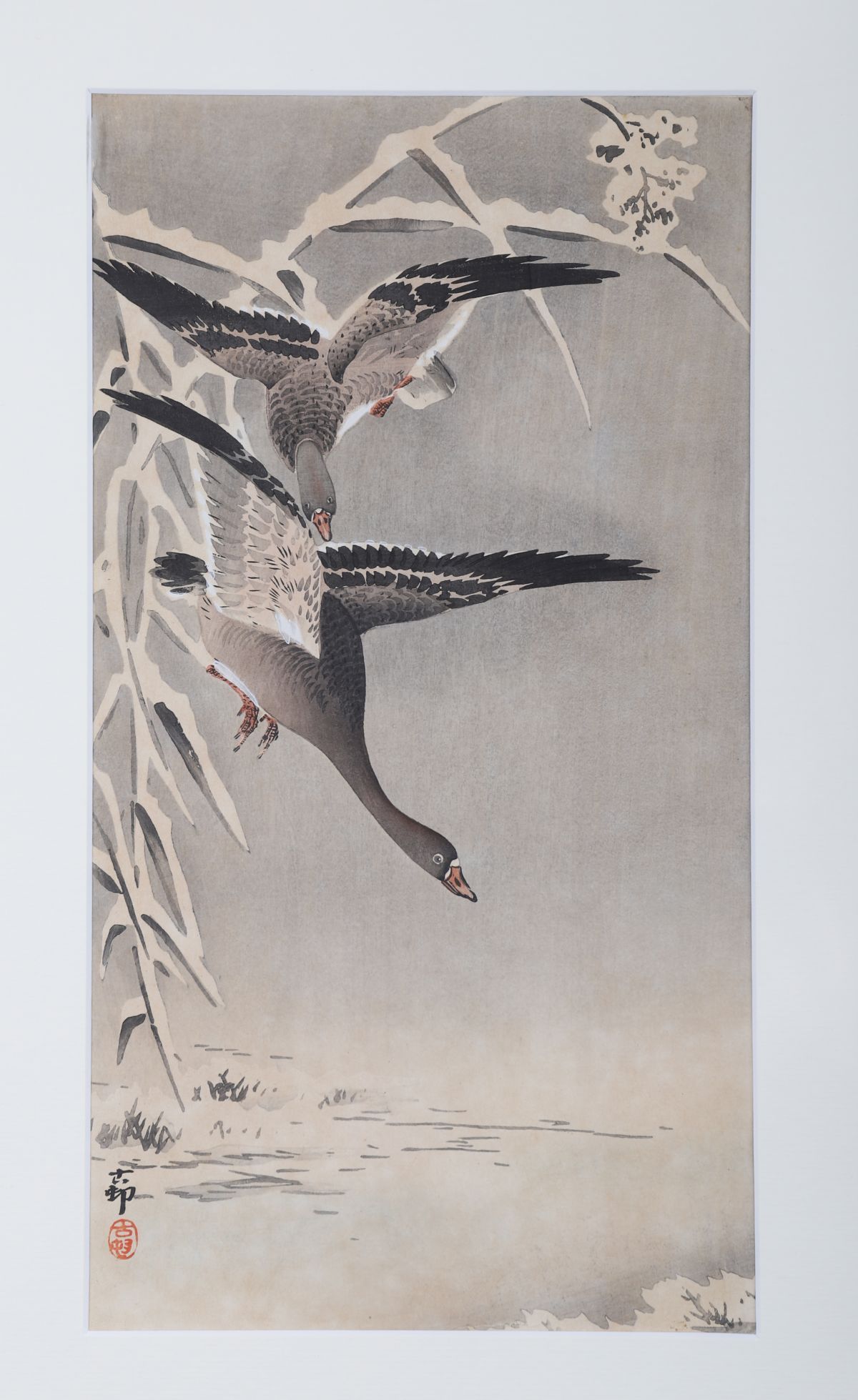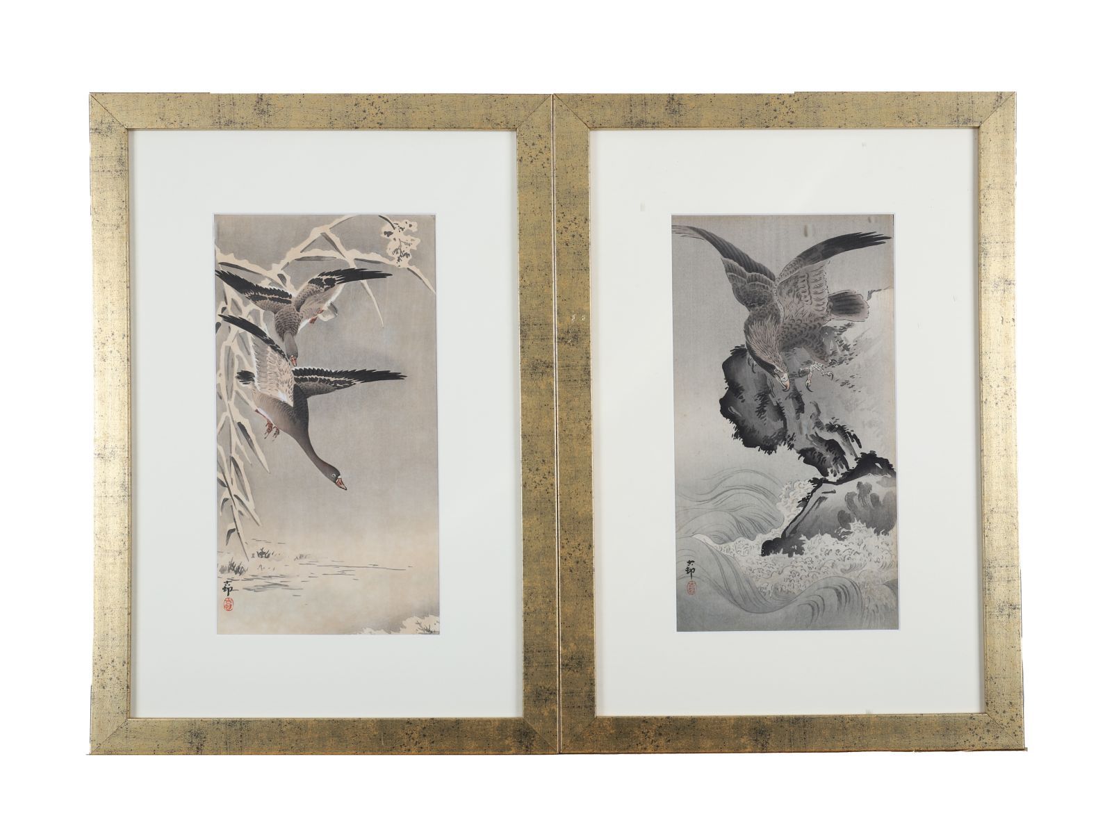 A pair of shin-hanga woodblock prints by Ohara Koson, depicting dynamic bird studies — one showing a hawk descending over stormy seas, the other a pair of geese in flight above reeds. Each signed and sealed by the artist. Both presented in matching gilt frames with cream mounts.
