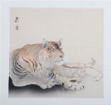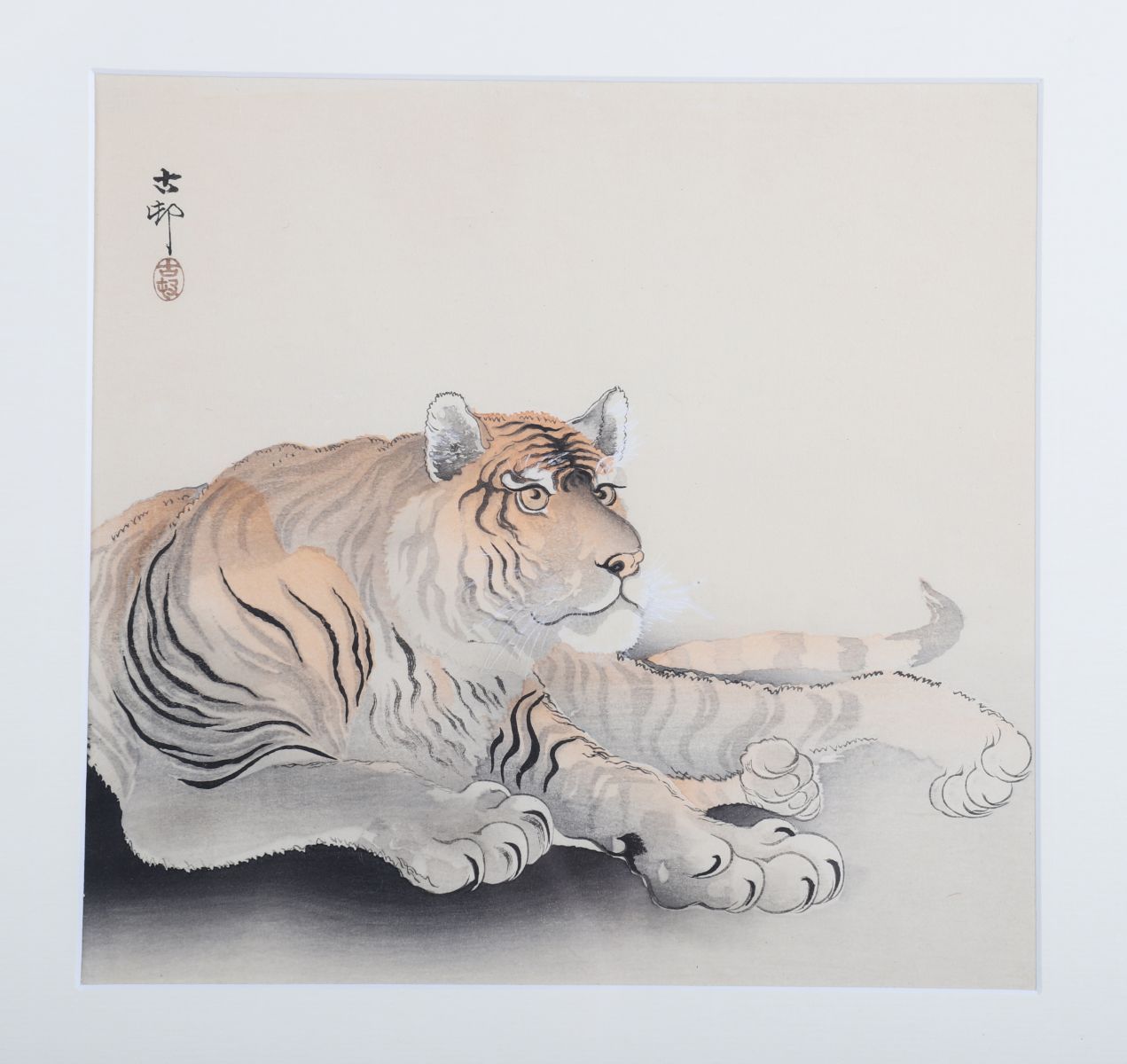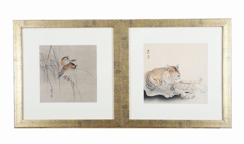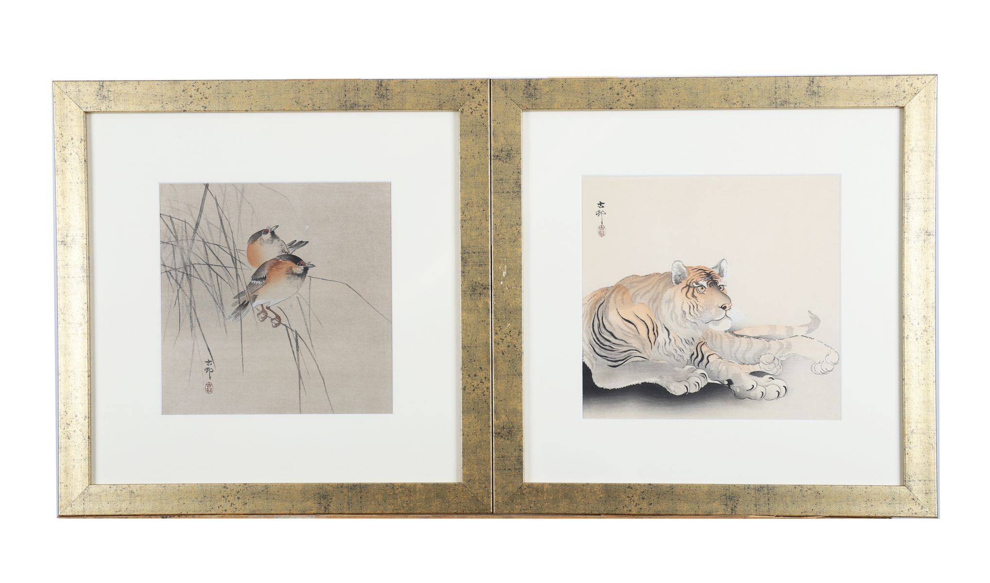 A pair of shin-hanga woodblock prints by Ohara Koson, comprising one depicting a seated tiger rendered with remarkable texture and presence, and the other showing two small birds perched among grasses. Each print signed and sealed by the artist. Both mounted and presented in gilt frames with cream mounts.