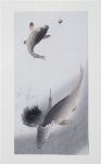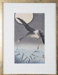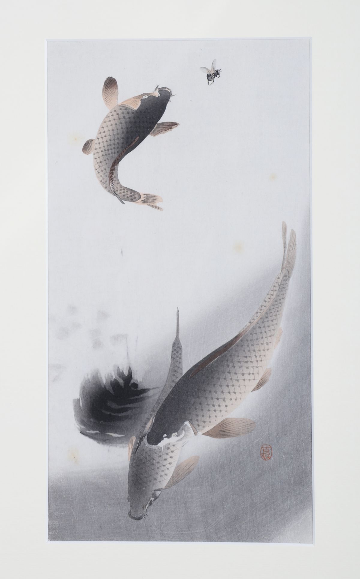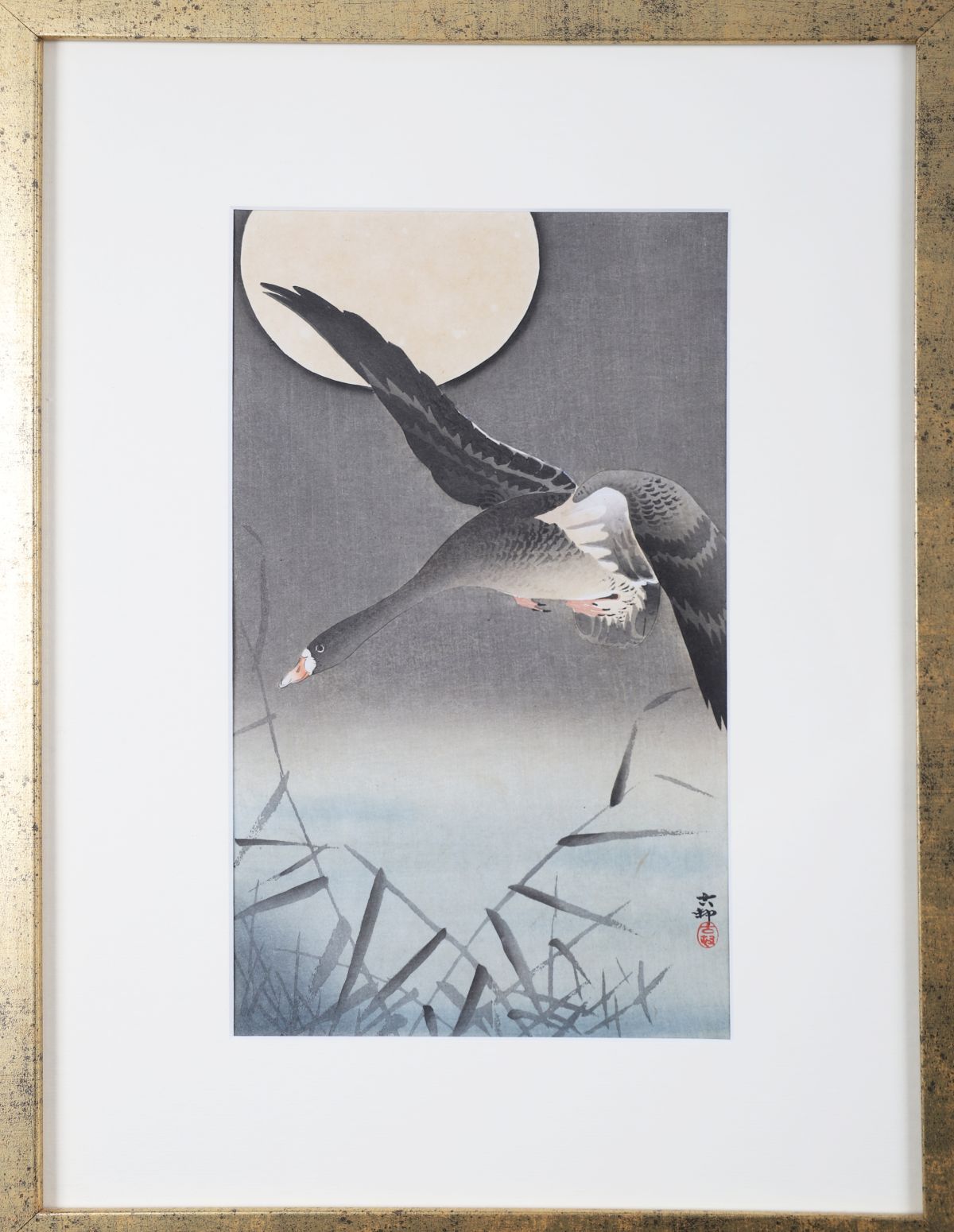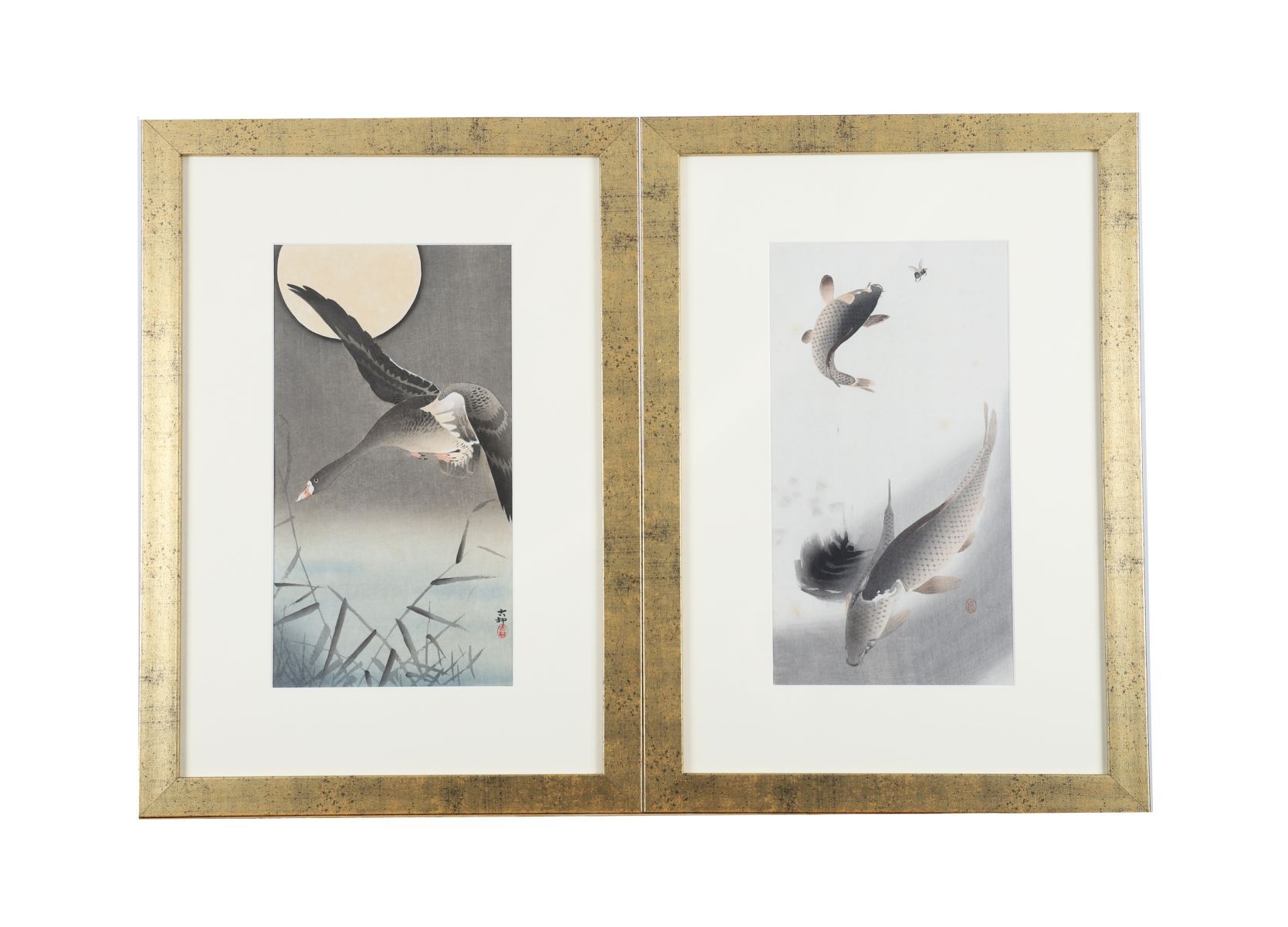 A pair of shin-hanga woodblock prints by Ohara Koson, one depicting two koi carp swimming gracefully beneath the water’s surface, the other showing a wild goose in flight before a full moon. Both prints bear the artist’s signature and red seal. Presented in matching gilt frames with cream mounts.
