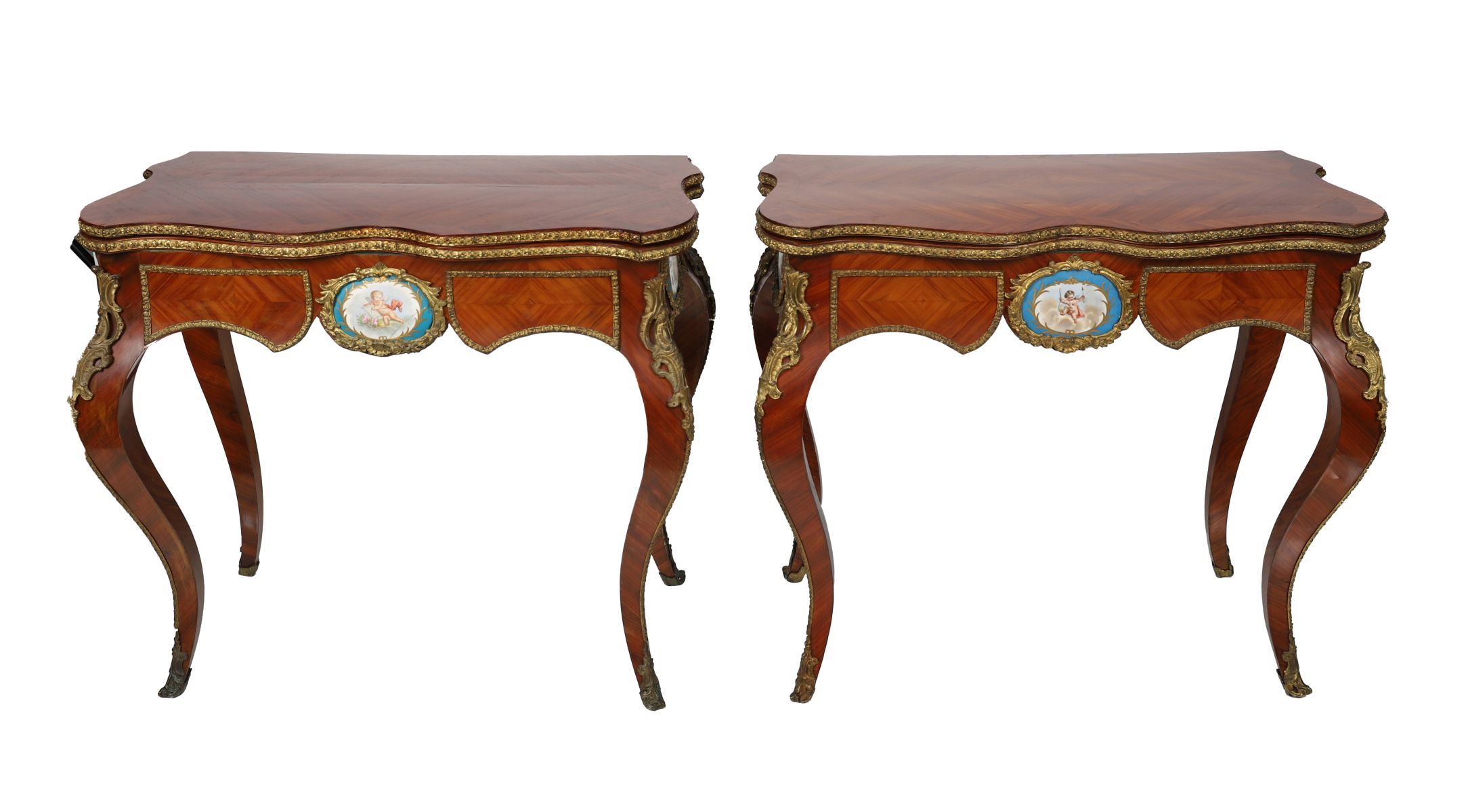 A fine pair of 19th-century kingwood and ormolu-mounted serpentine card tables, each inlaid with parquetry veneers and centred by a hand-painted Sèvres porcelain plaque depicting classical scenes, raised on cabriole legs with foliate mounts.