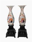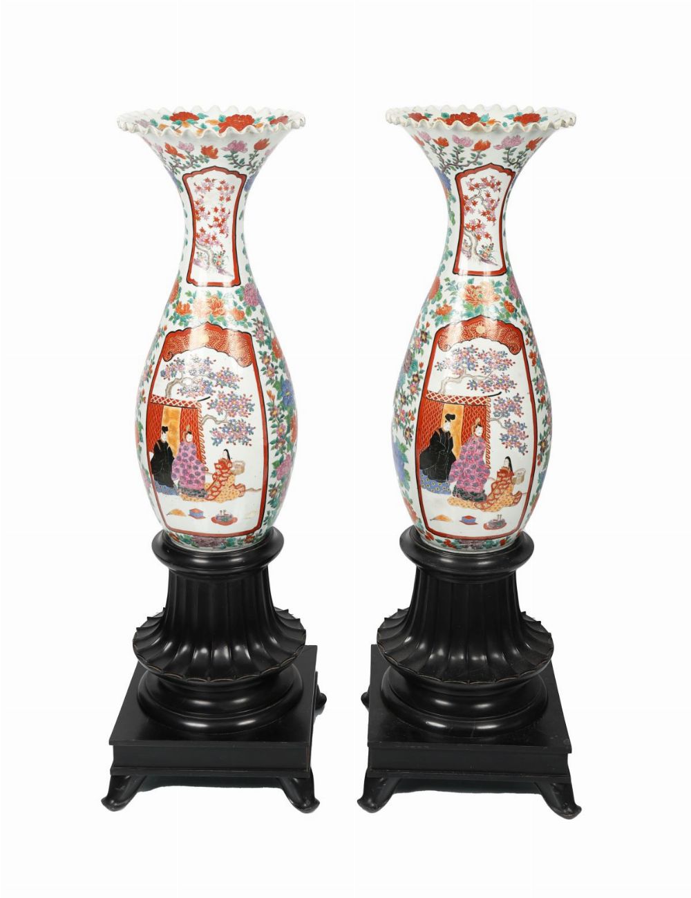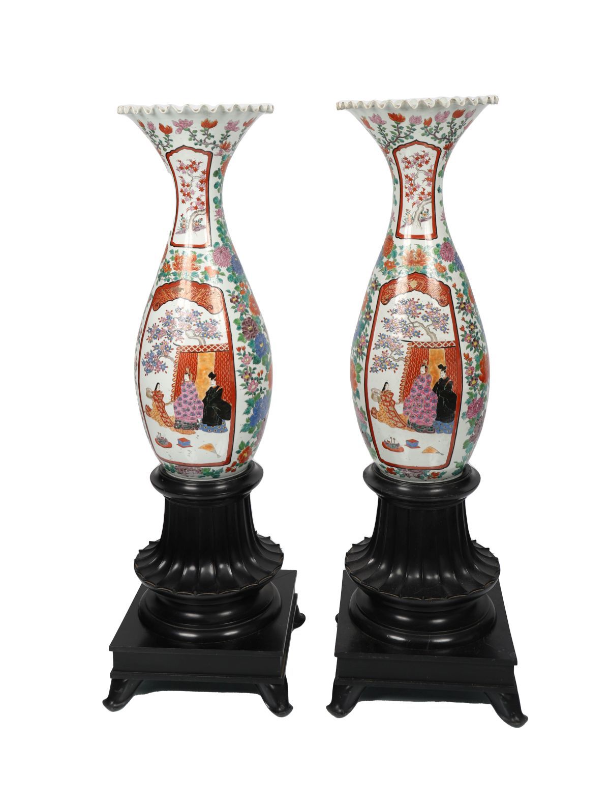 A striking pair of large Japanese Imari porcelain vases, each of baluster form with flared, serrated rims, profusely decorated in the traditional palette of iron red, cobalt blue and gilt with panels of figures, birds and flowering branches. Mounted on carved ebonised wood plinths.
