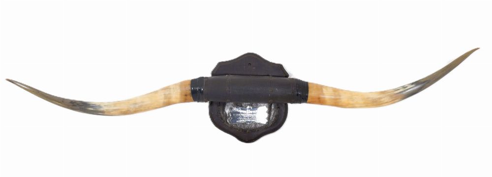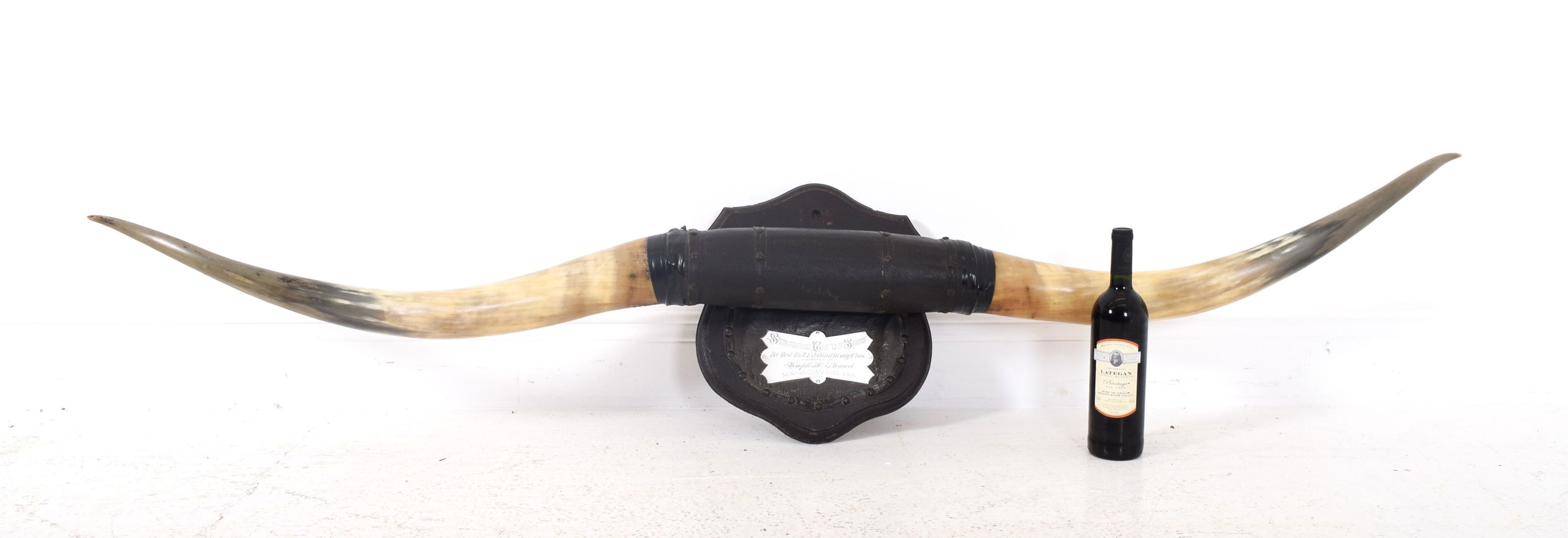 Lot 301 PAIR OF LARGE COW HORNS MOUNTED ON A WALL PLAQUE