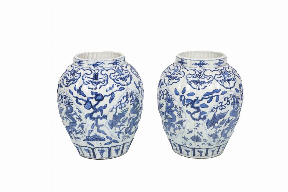 A pair of monumental early 20th-century Chinese blue and white porcelain urns, each of ovoid form decorated in rich cobalt blue with phoenix and foliate scrolls within ruyi borders, beneath a flared rim.