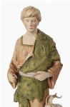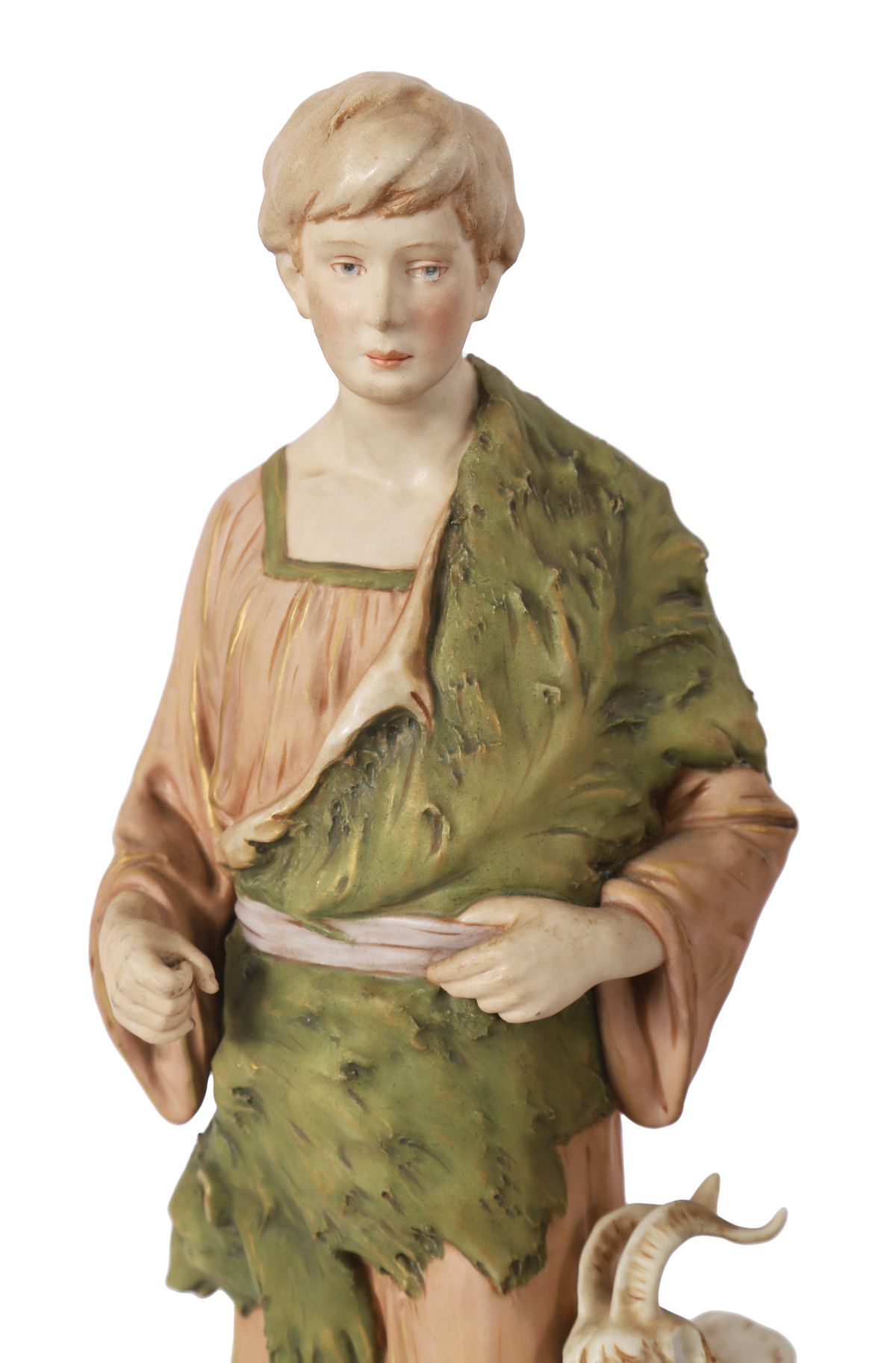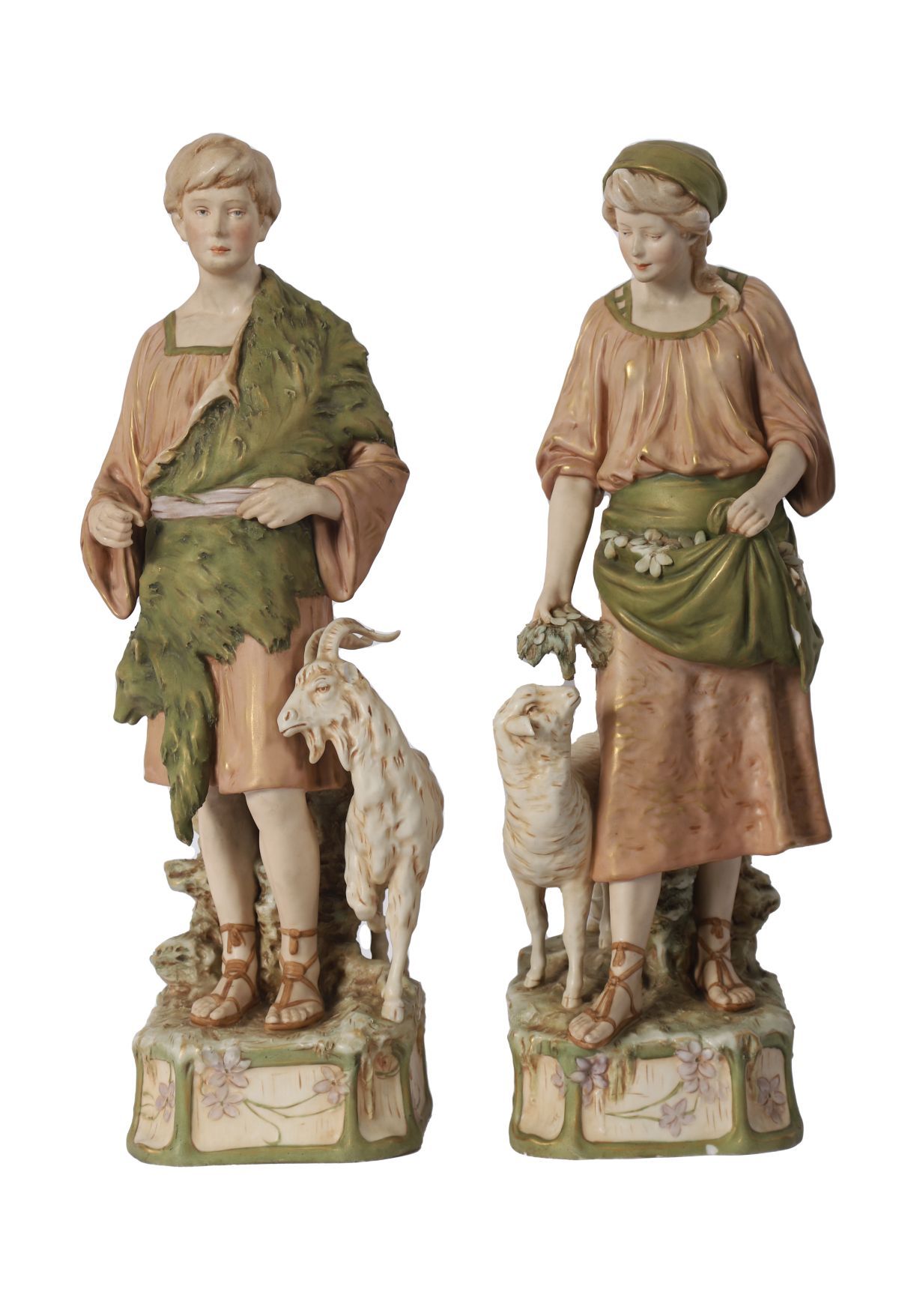A large pair of Royal Dux porcelain figures modelled as pastoral youths, each standing barefoot on naturalistic bases and accompanied by livestock, the figures richly modelled and decorated in soft polychrome tones with characteristic flowing drapery and naturalistic detailing.