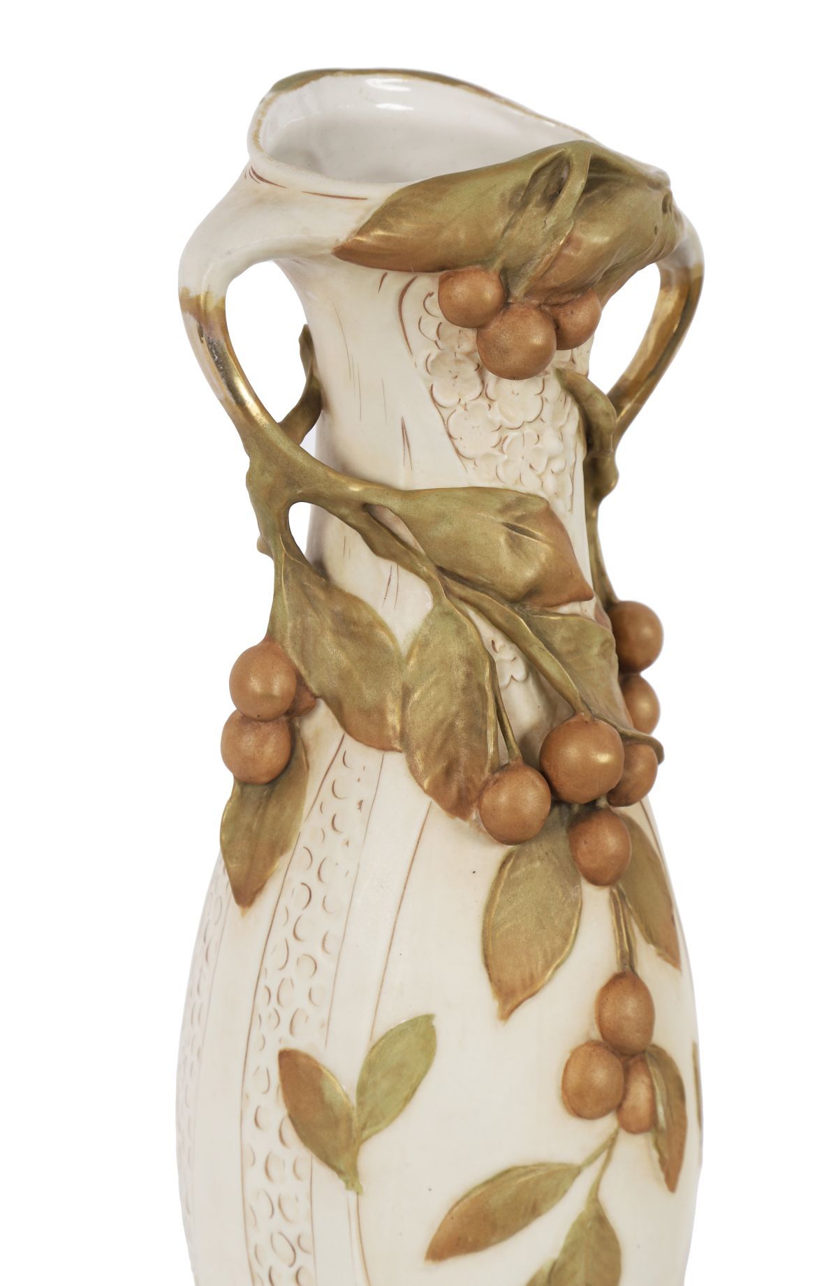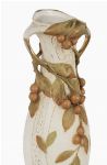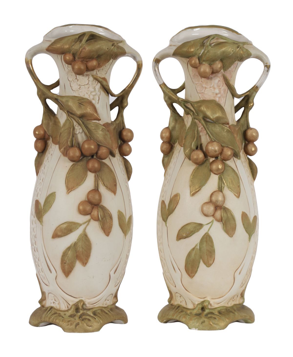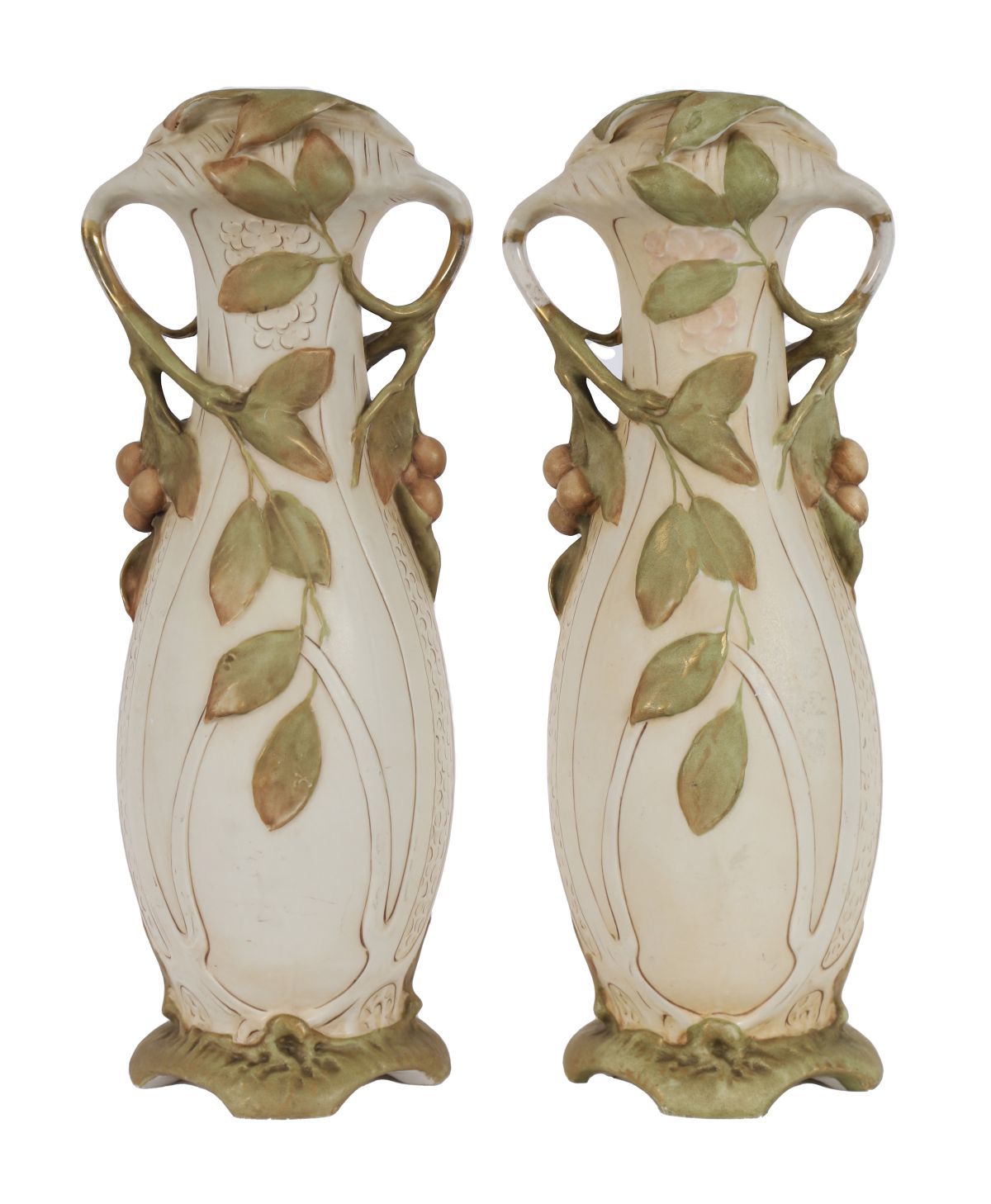 A large pair of Royal Dux porcelain vases of organic Art Nouveau form, each decorated with applied vine handles, leaves and fruit, raised on moulded bases.