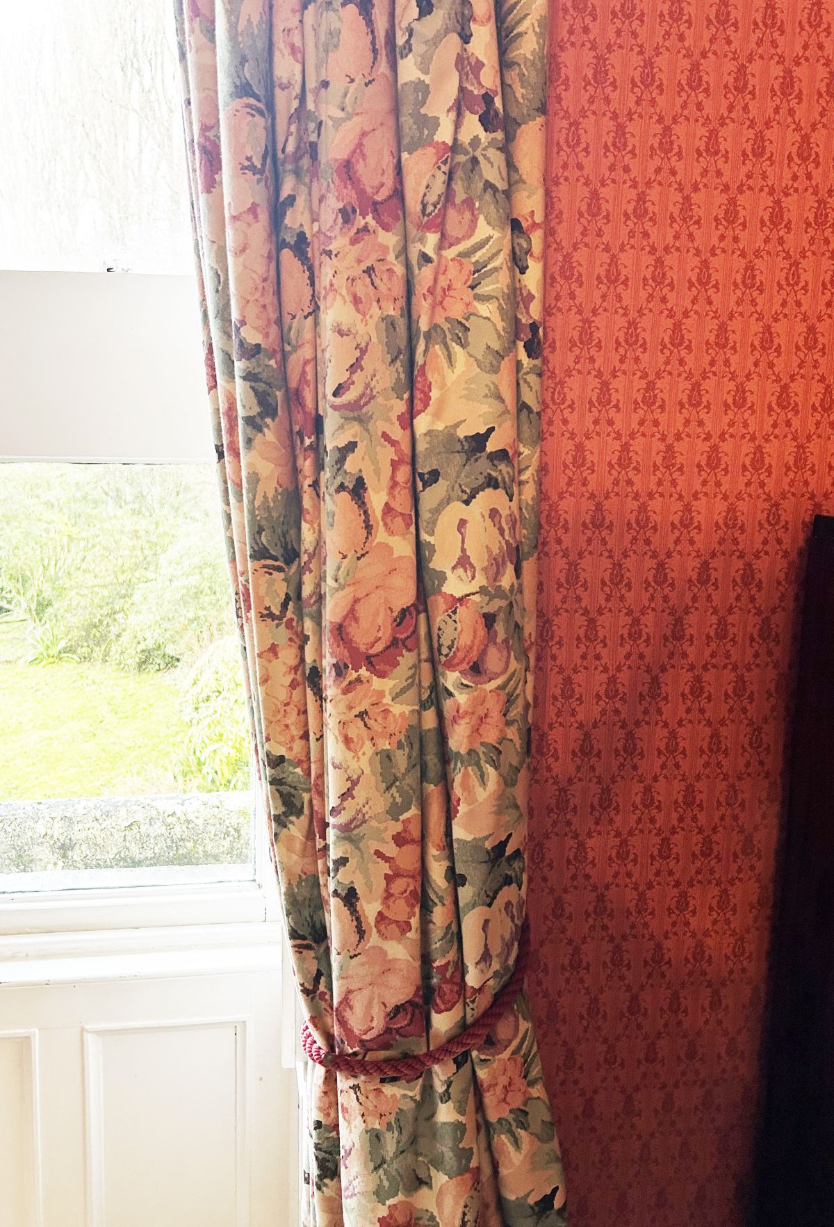 A pair of lined and interlined curtains in floral fabric, complete with tiebacks.