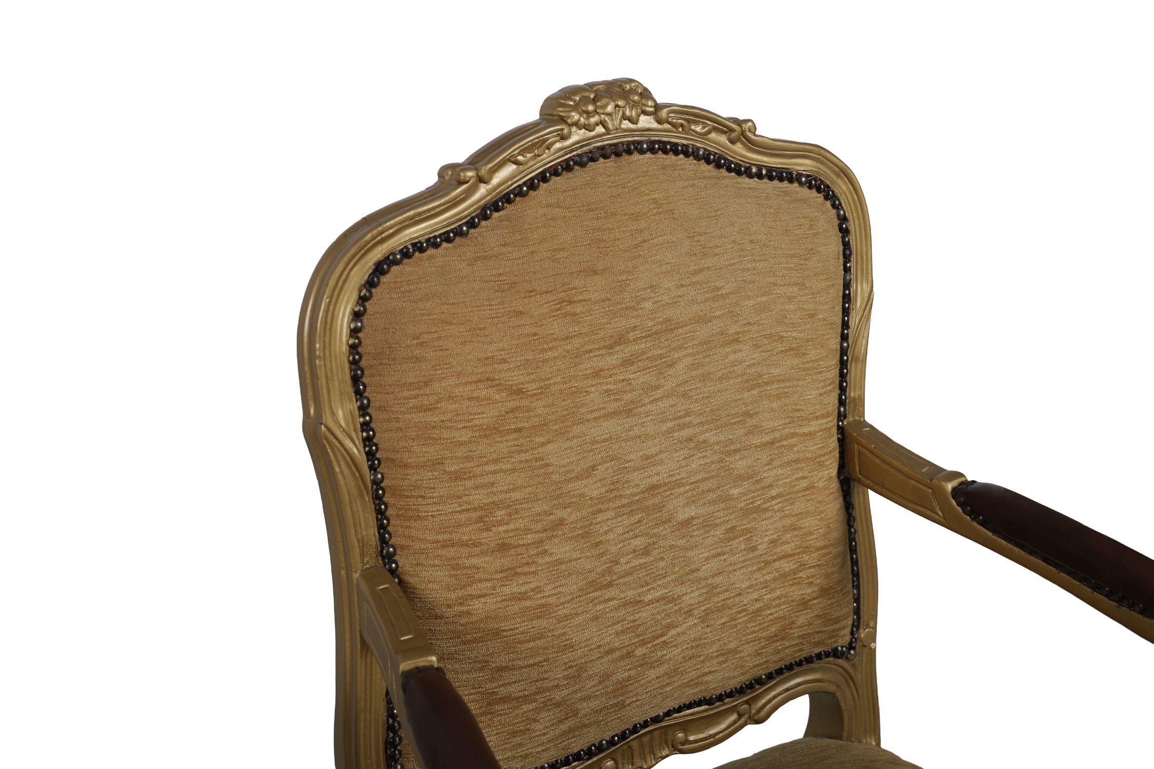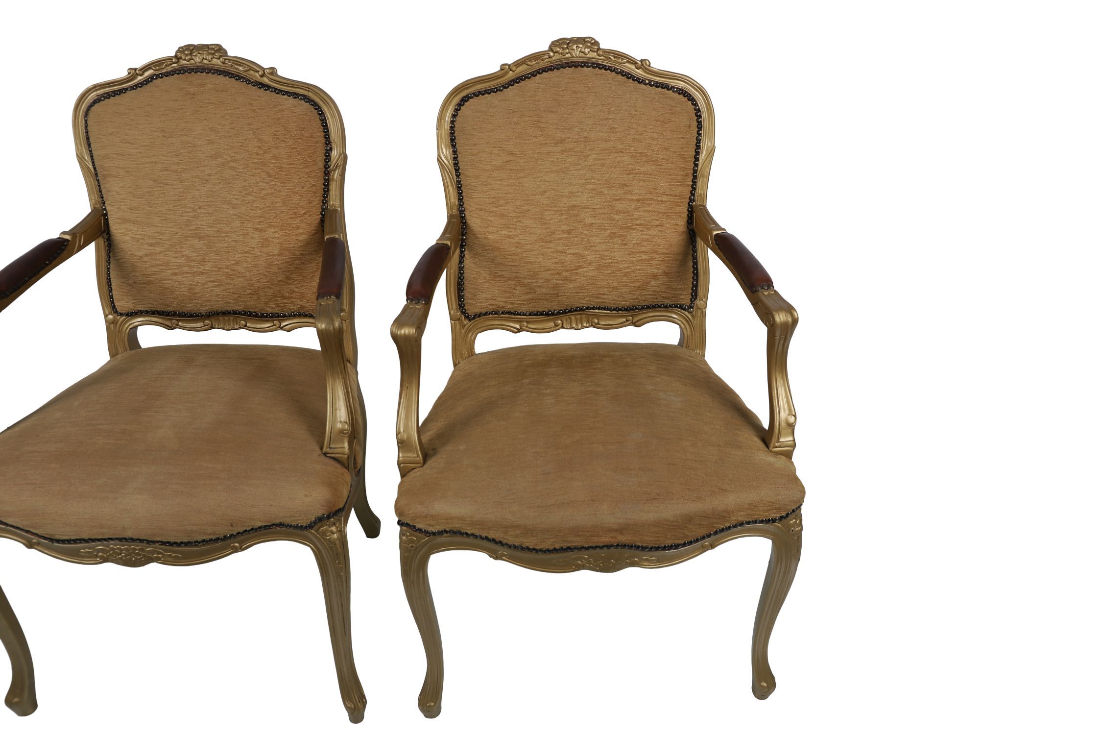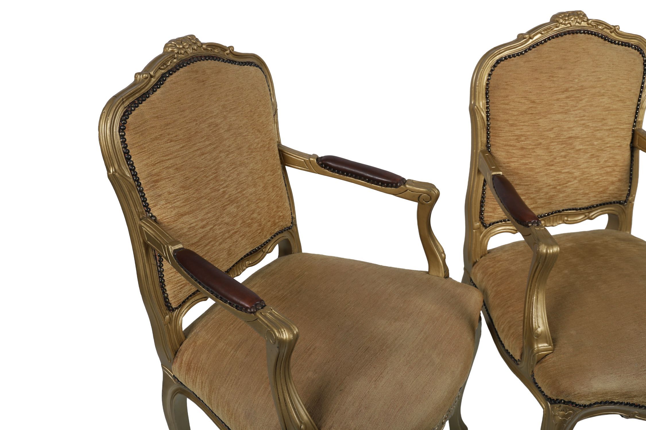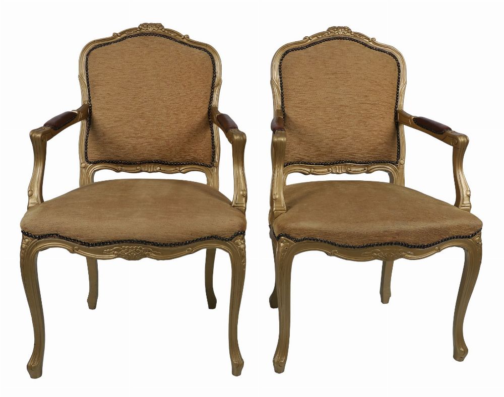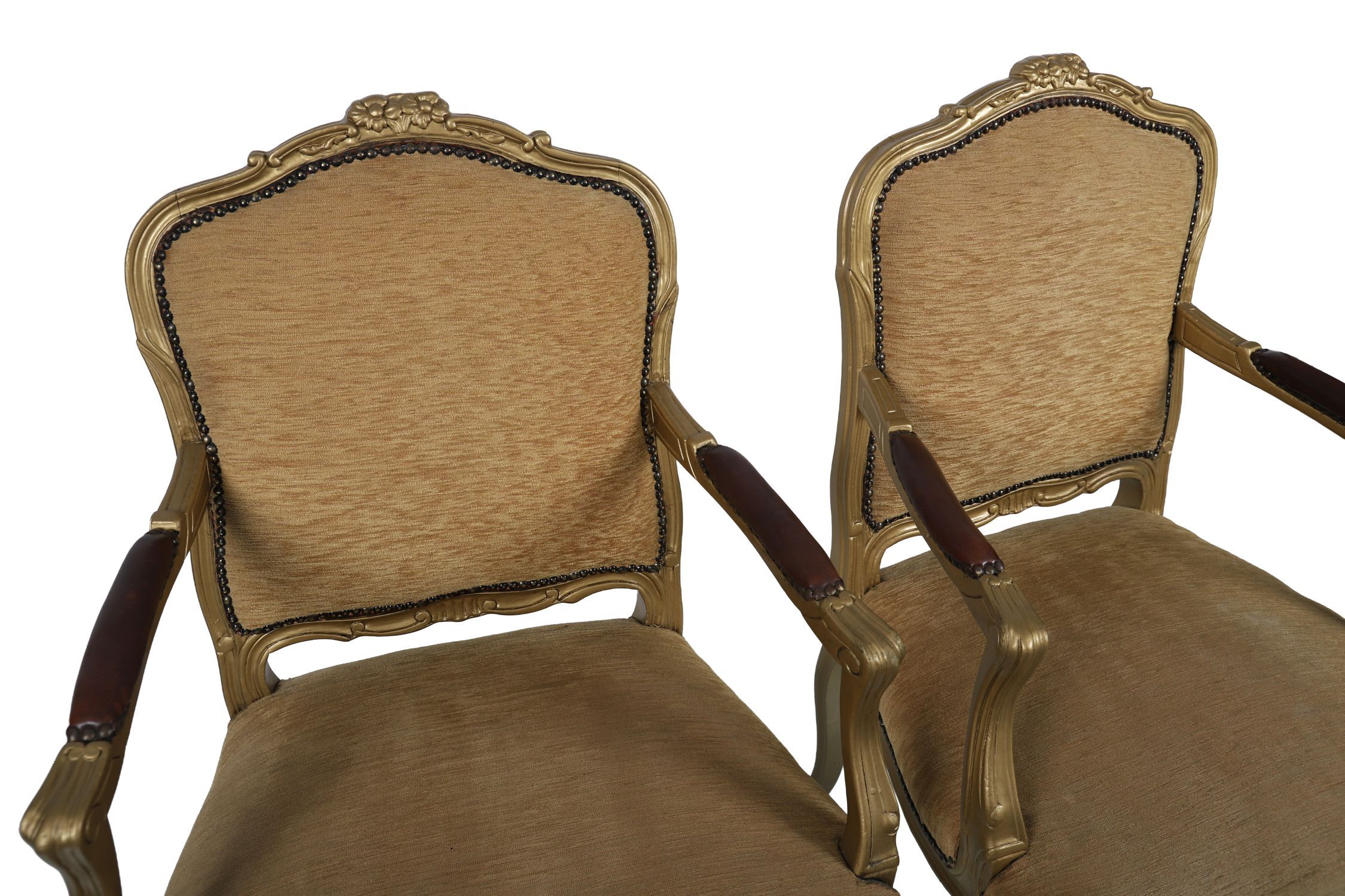 A pair of fauteuil armchairs in the Louis XV style, each with giltwood frame, floral-carved cresting, padded back and seat, and upholstered in a soft gold fabric, the armrests with leather grips.