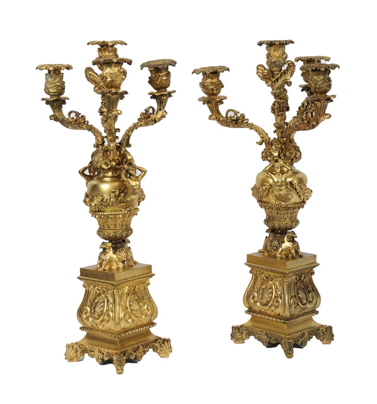 A pair of Louis XVI-style gilt bronze three branch candelabra, each with ornate scrolling arms issuing from an urn-shaped stem adorned with griffin masks and acanthus ornament, on a square plinth base.