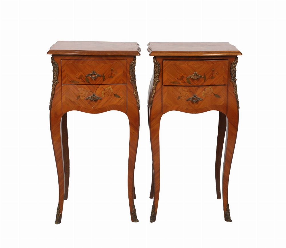 A pair of Louis XV-style kingwood and marquetry bedside cabinets, each with serpentine top and two drawers decorated with floral marquetry and gilt-bronze mounts.
