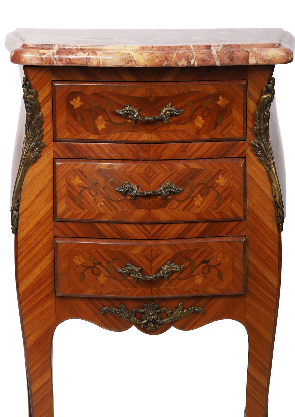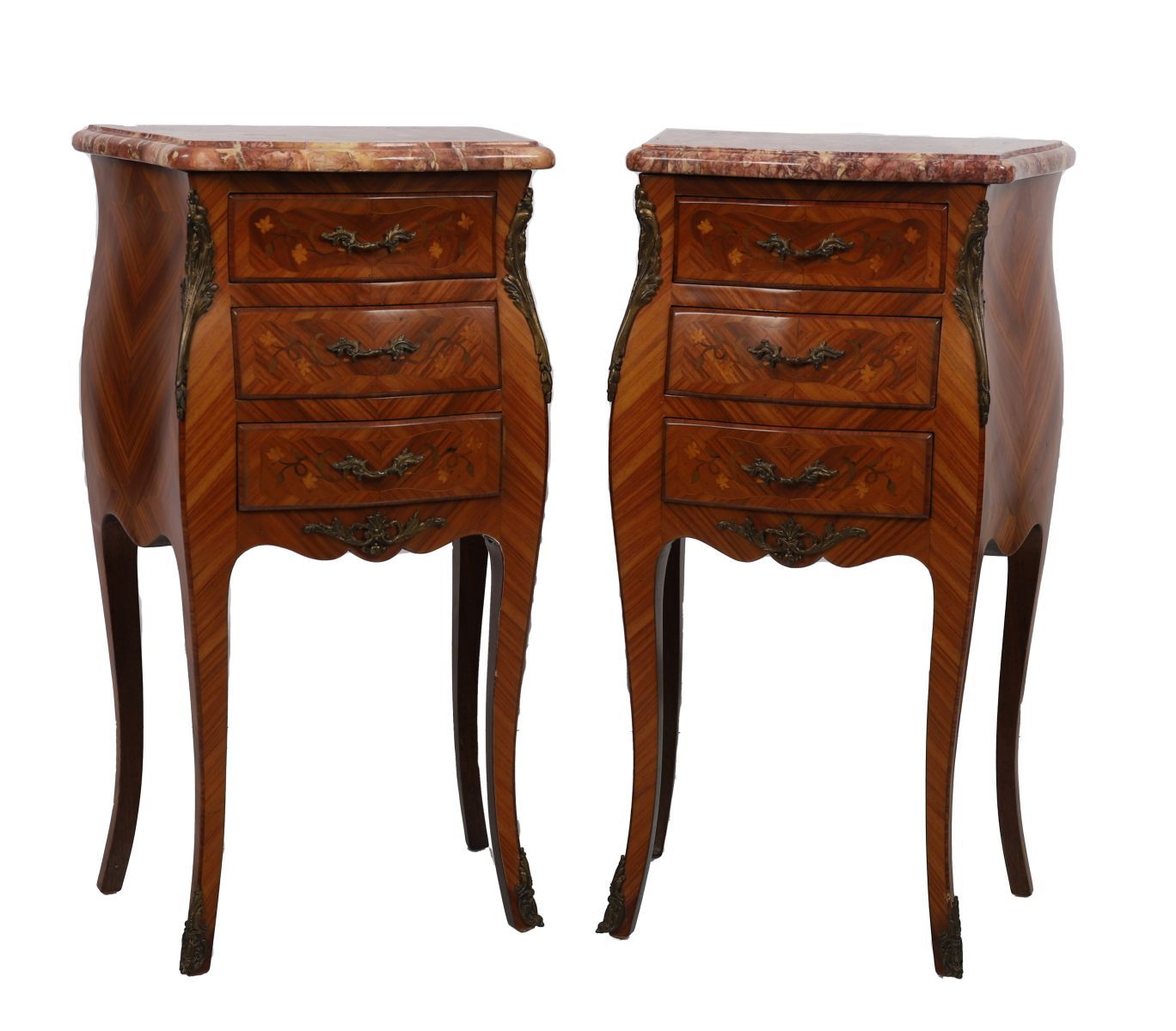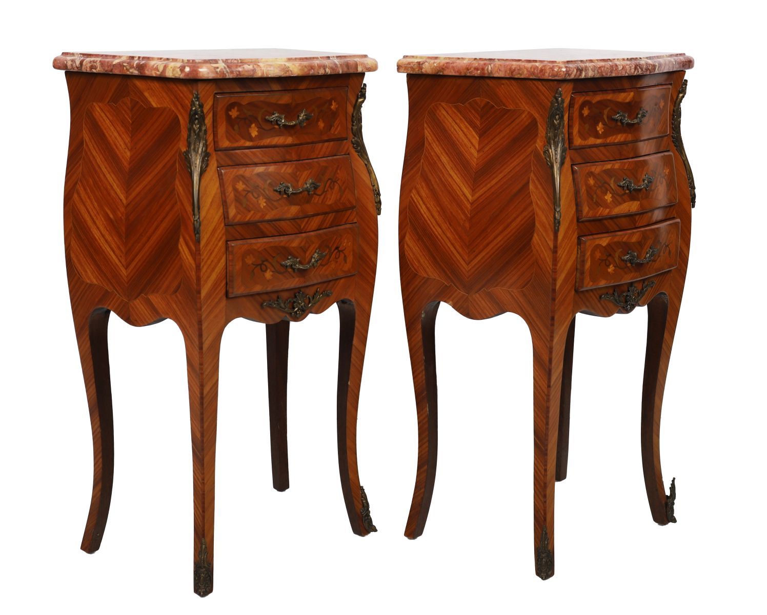 A pair of Louis XV style kingwood bedside tables, each of bombe form with floral marquetry panels, fitted drawers with cast gilt metal handles, raised on cabriole legs with gilt mounts and inset marble tops.