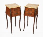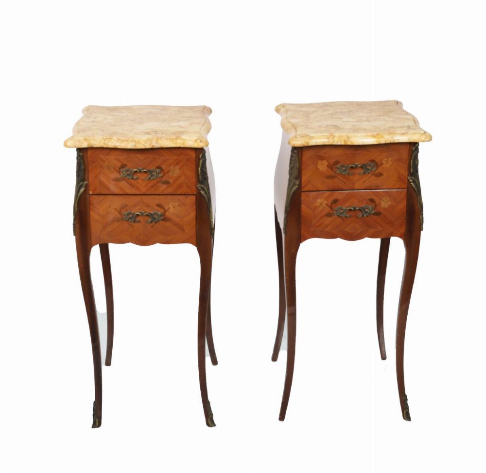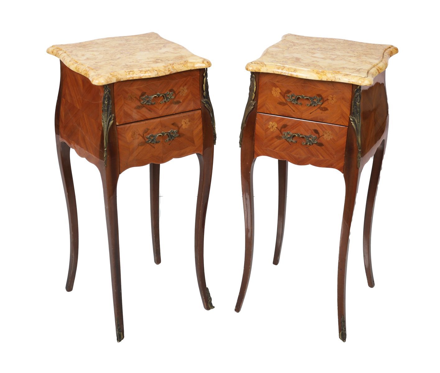 A pair of Louis XV-style kingwood bedside cabinets, each with serpentine marble top above two drawers with gilt-bronze mounts and parquetry veneered panels.