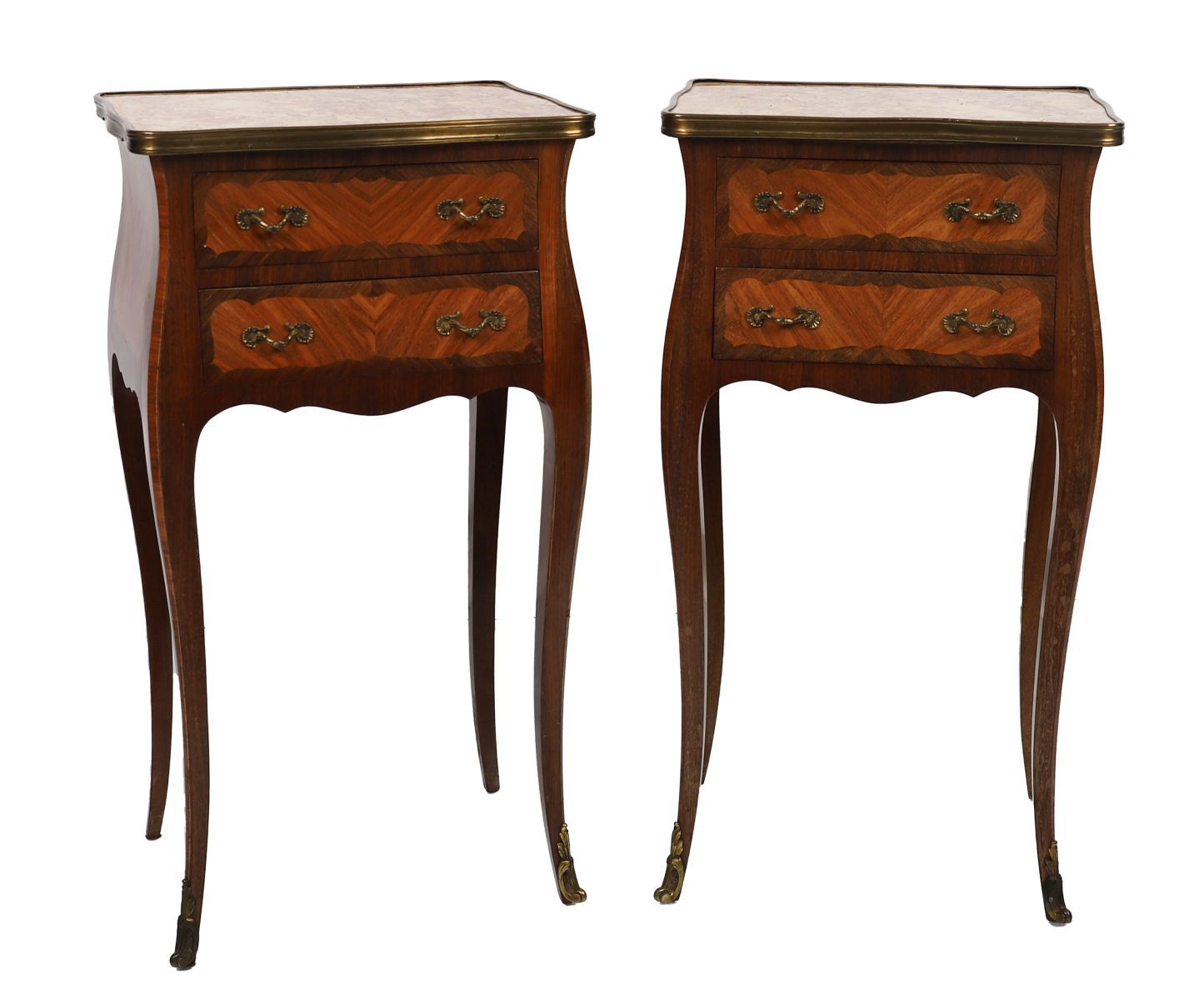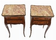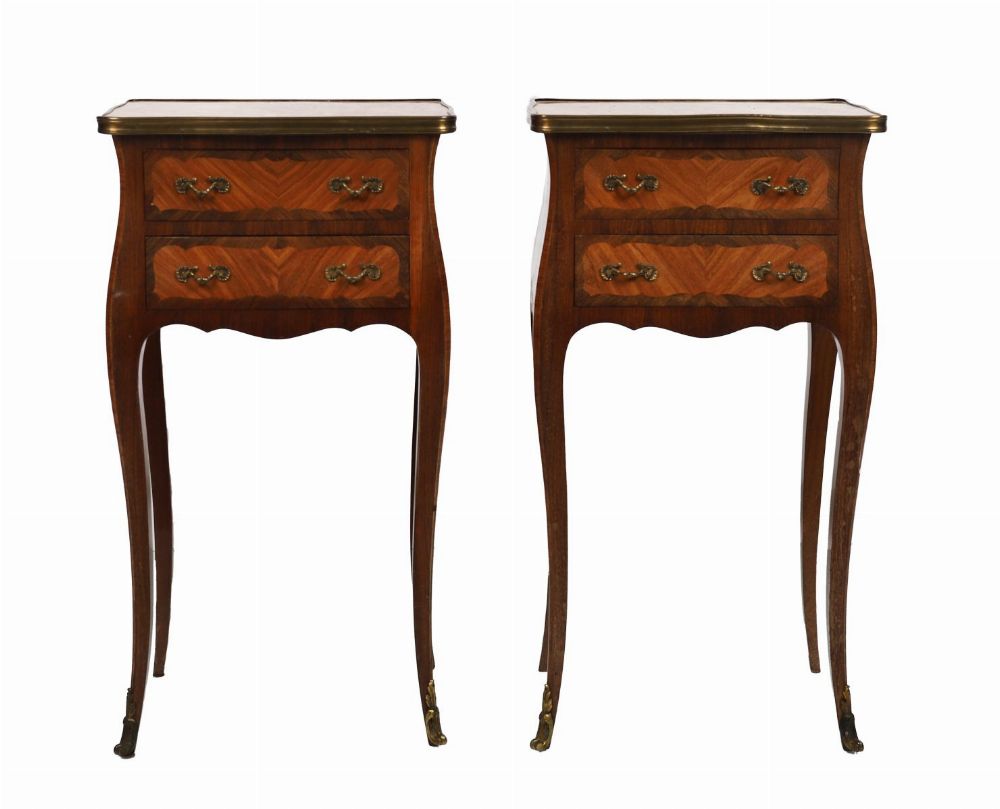 A pair of Louis XV style kingwood bedside chests, each of serpentine outline, fitted two drawers with gilt metal mounts, raised on cabriole legs and inset with shaped marble tops.