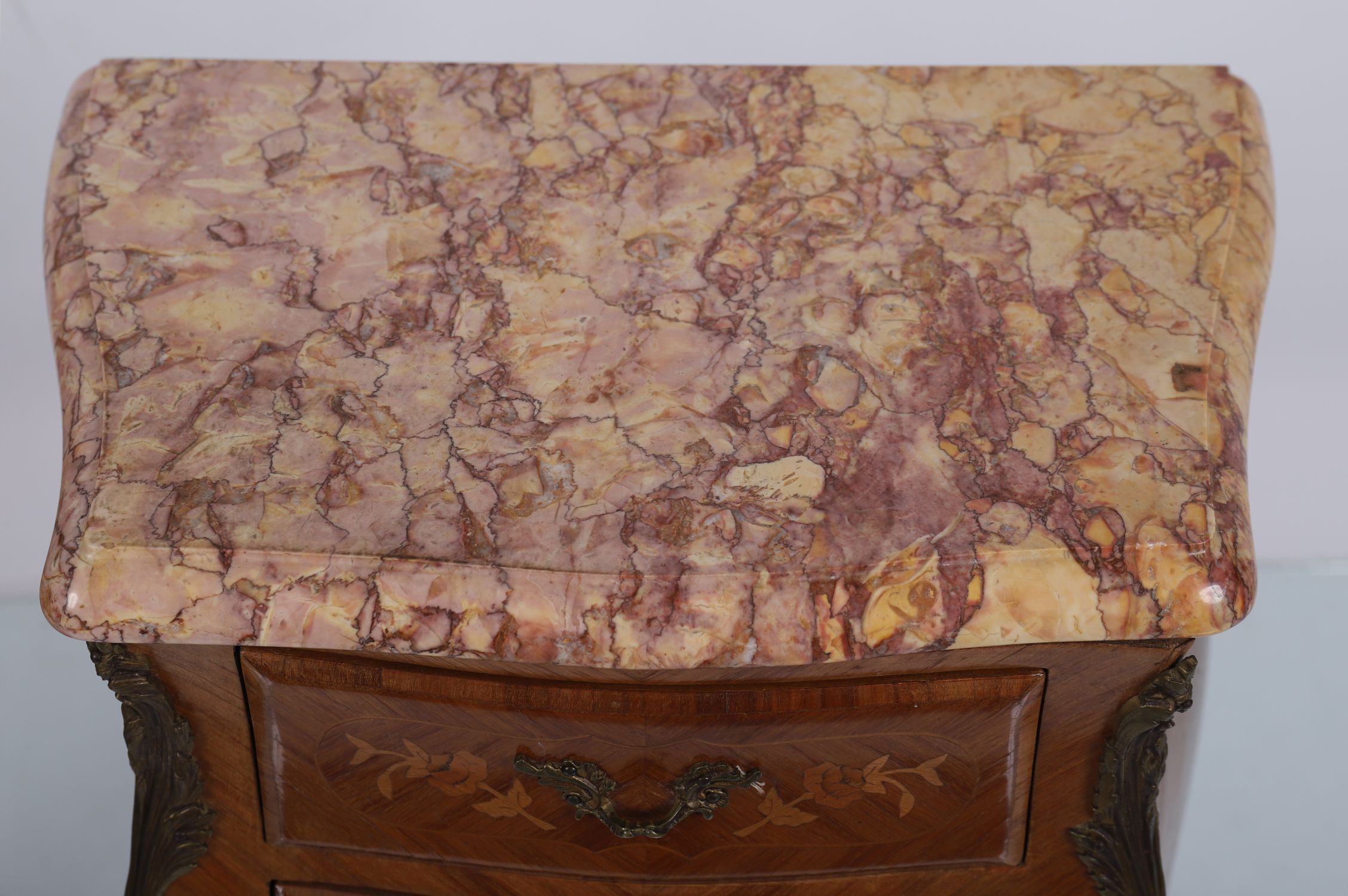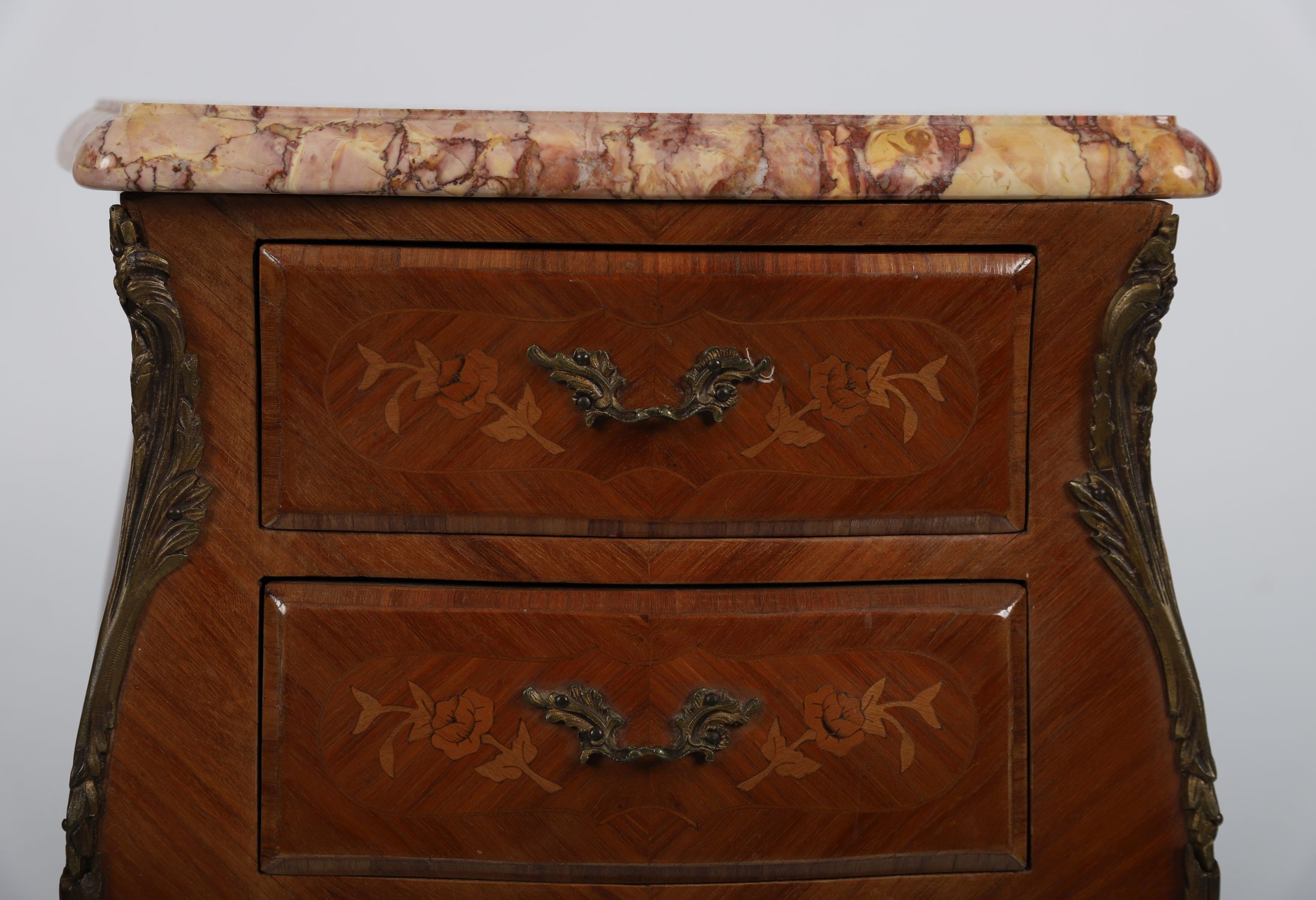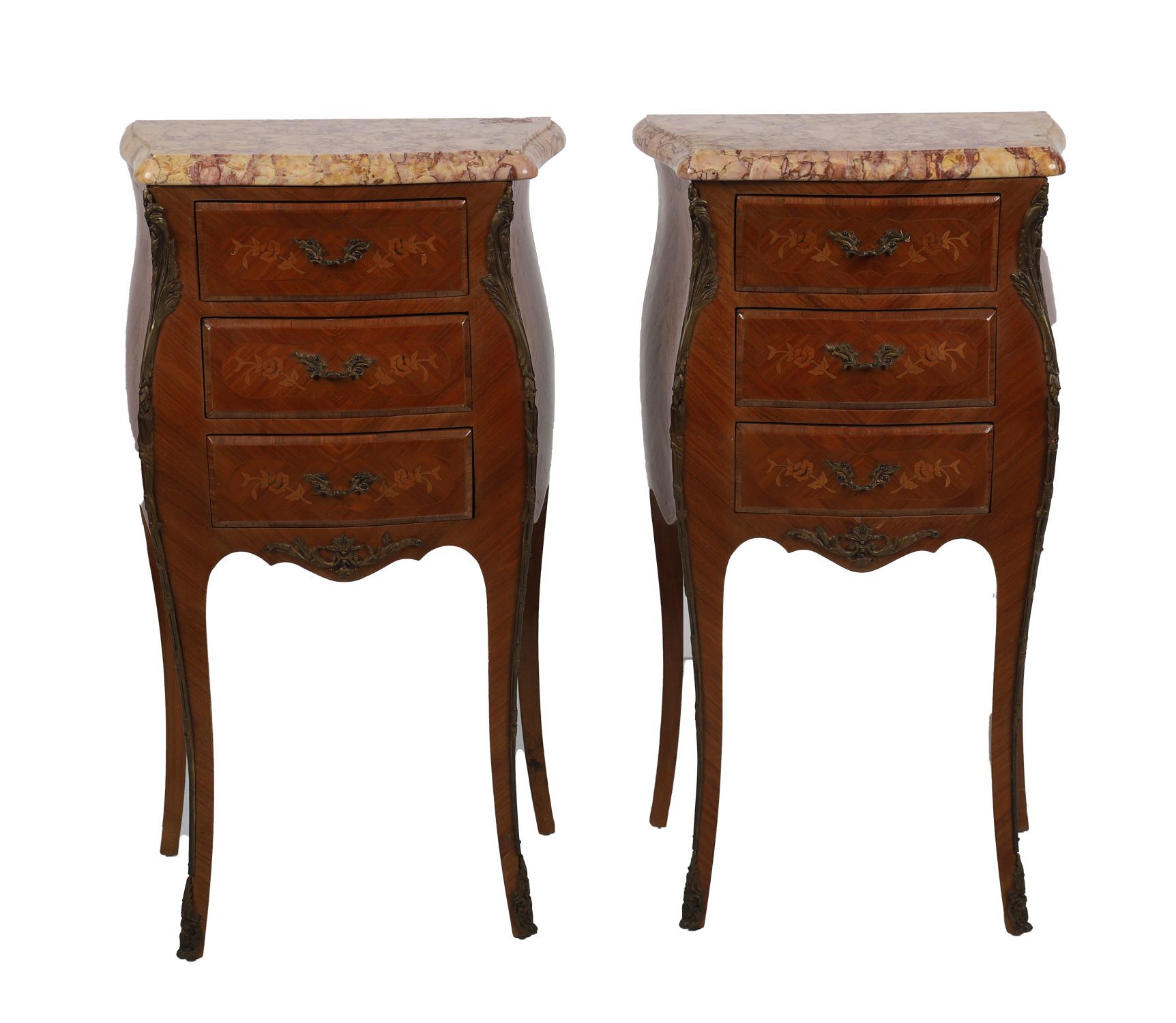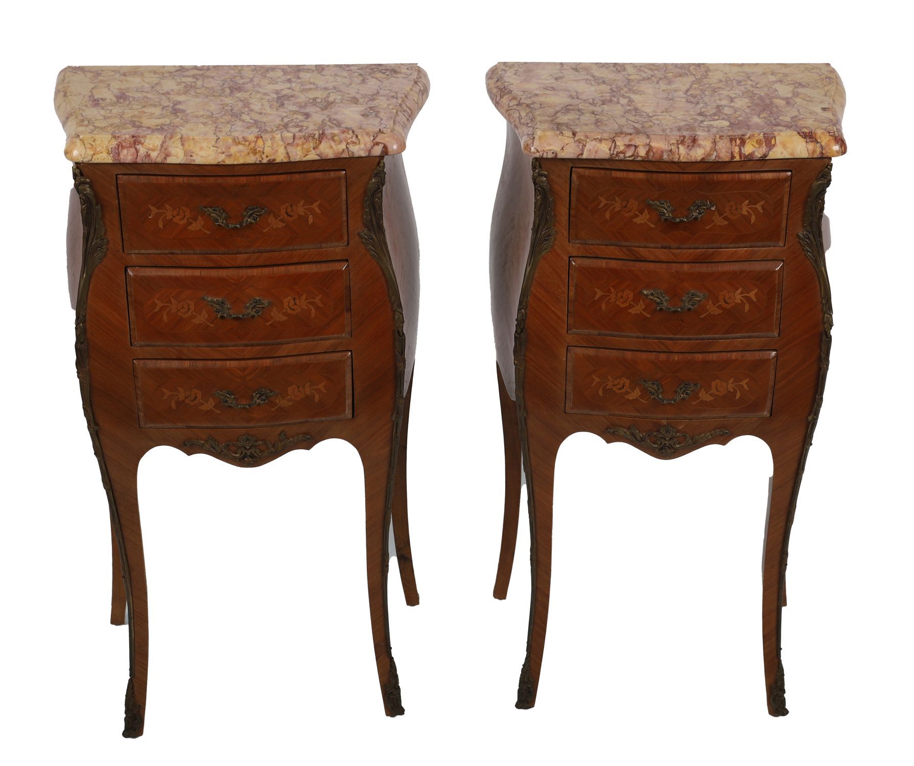 A pair of 20th-century kingwood bombe commodes in the Louis XV style, each with shaped marble top, floral marquetry drawer fronts, and gilt-bronze mounts to the corners and feet.