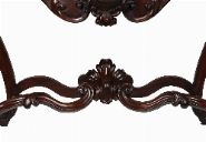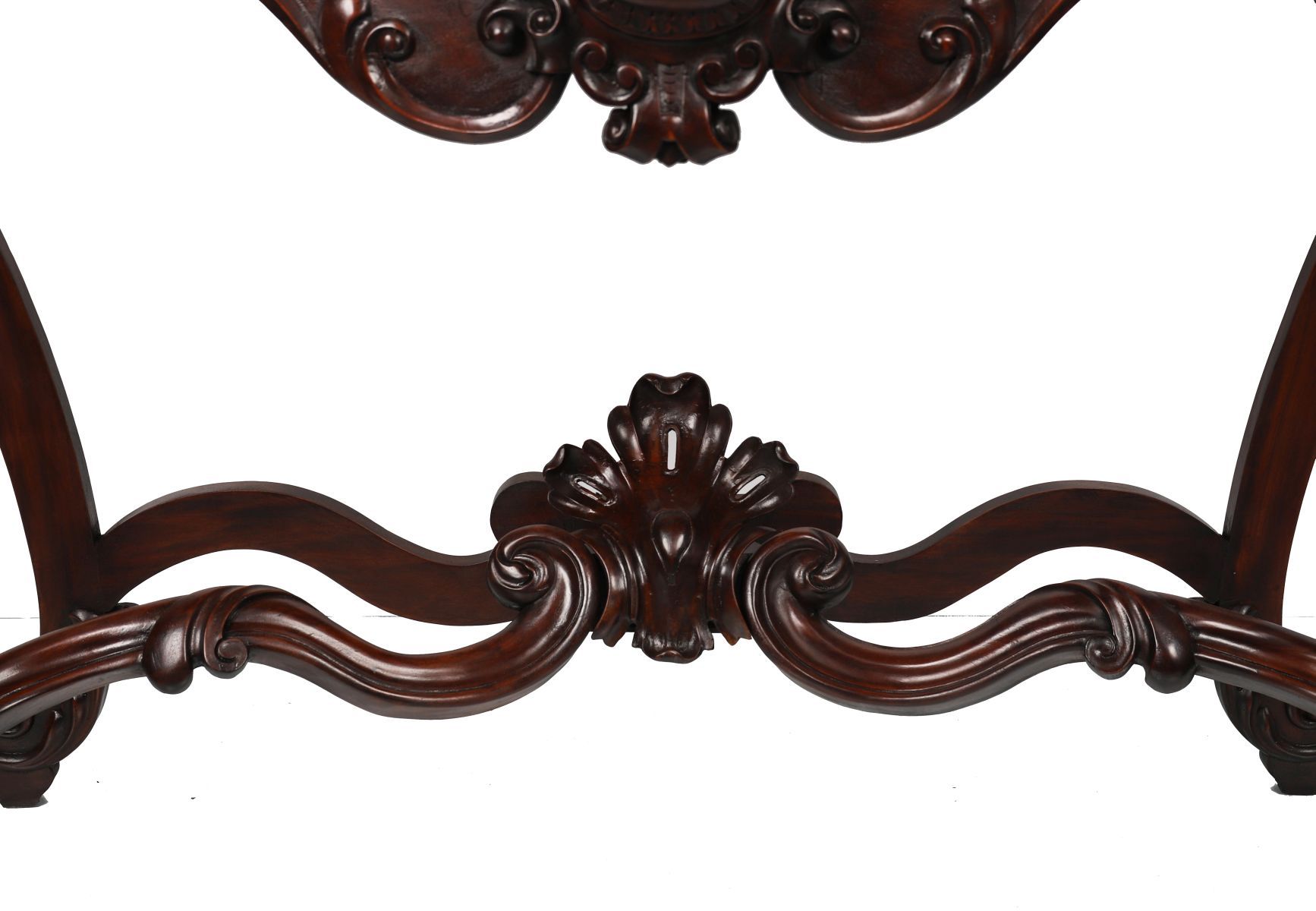 A fine pair of 19th-century mahogany console tables, each richly carved with scroll, shell, and floral motifs, raised on cabriole legs joined by ornate stretchers. Each table surmounted by a moulded white veined marble top.