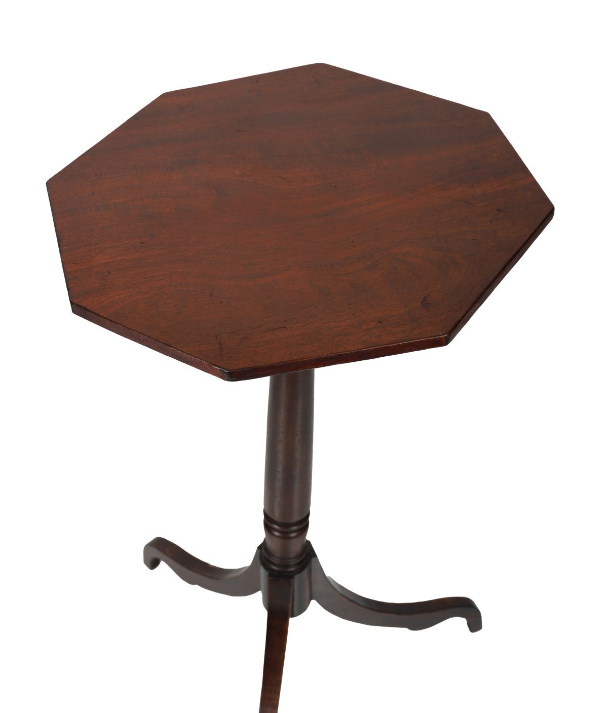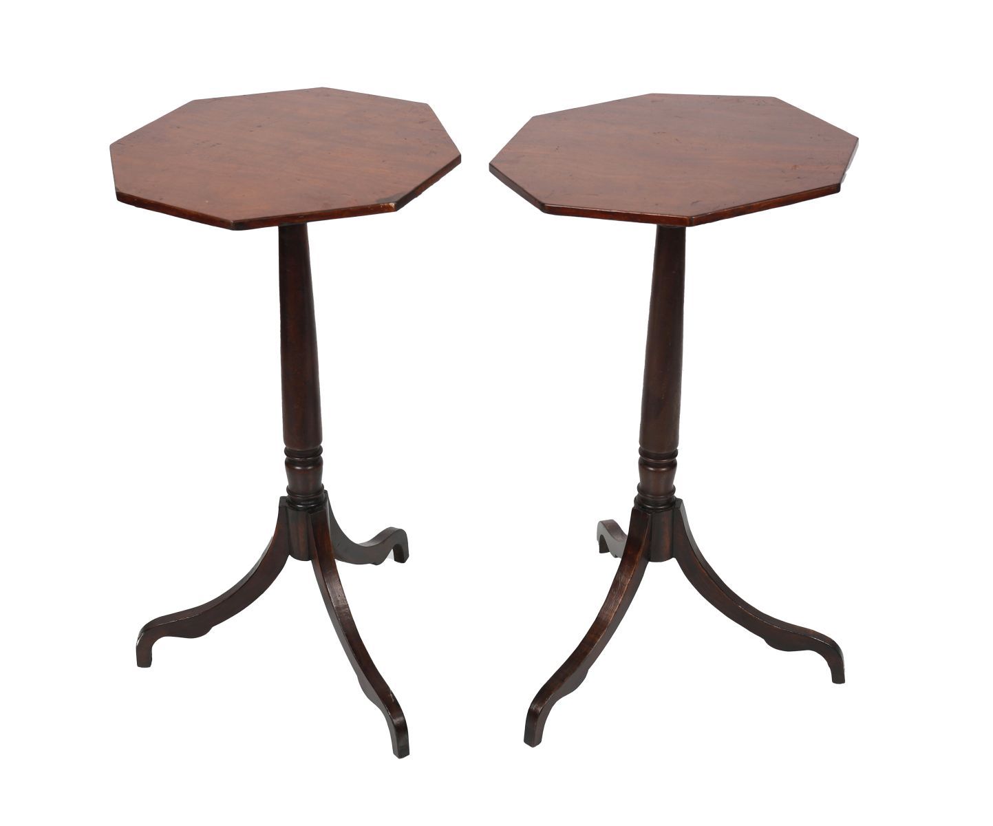 A pair of elegant mahogany wine tables, each with octagonal top raised on a turned column and tripod base terminating in splayed legs. The tops showing fine figuring and patination.