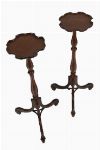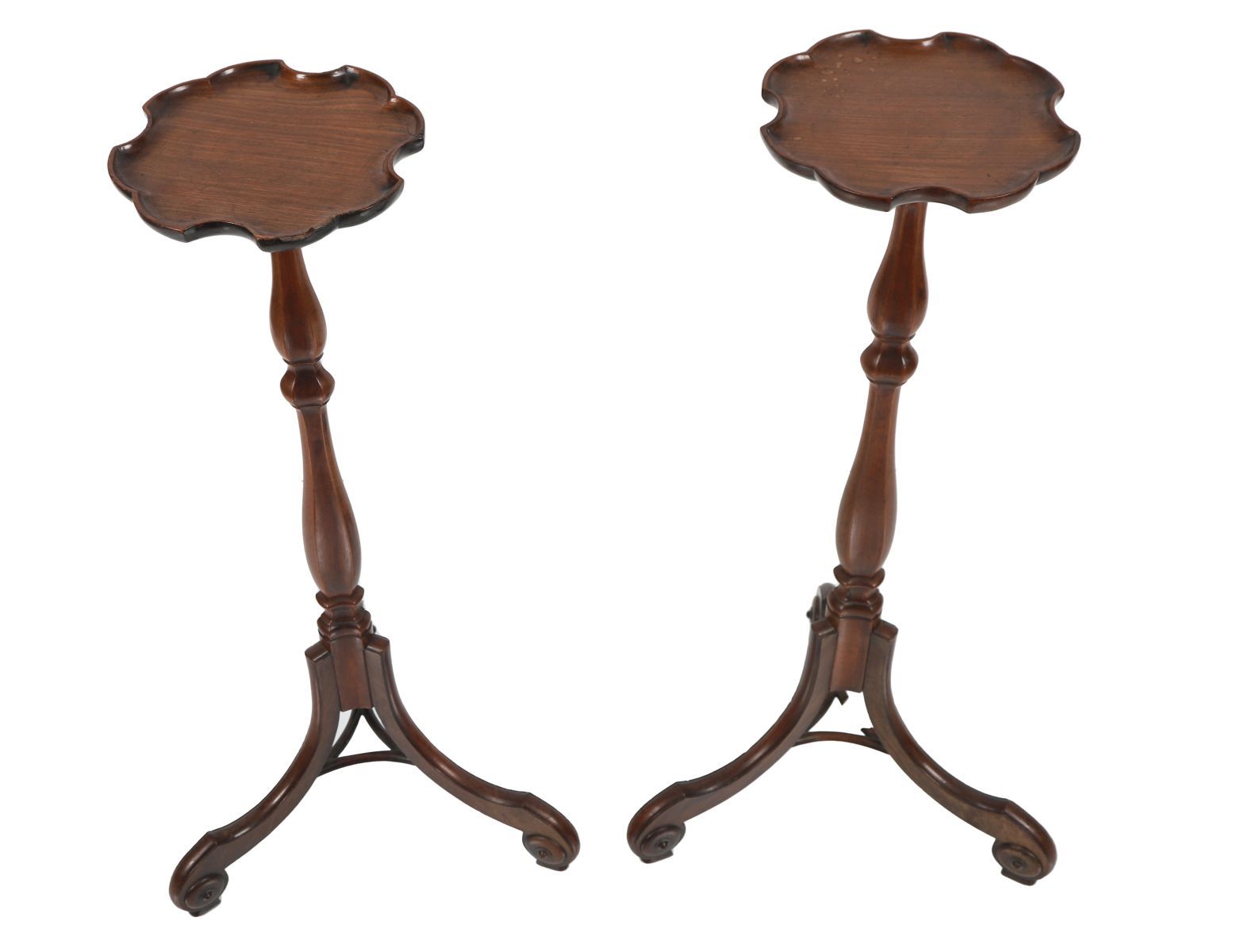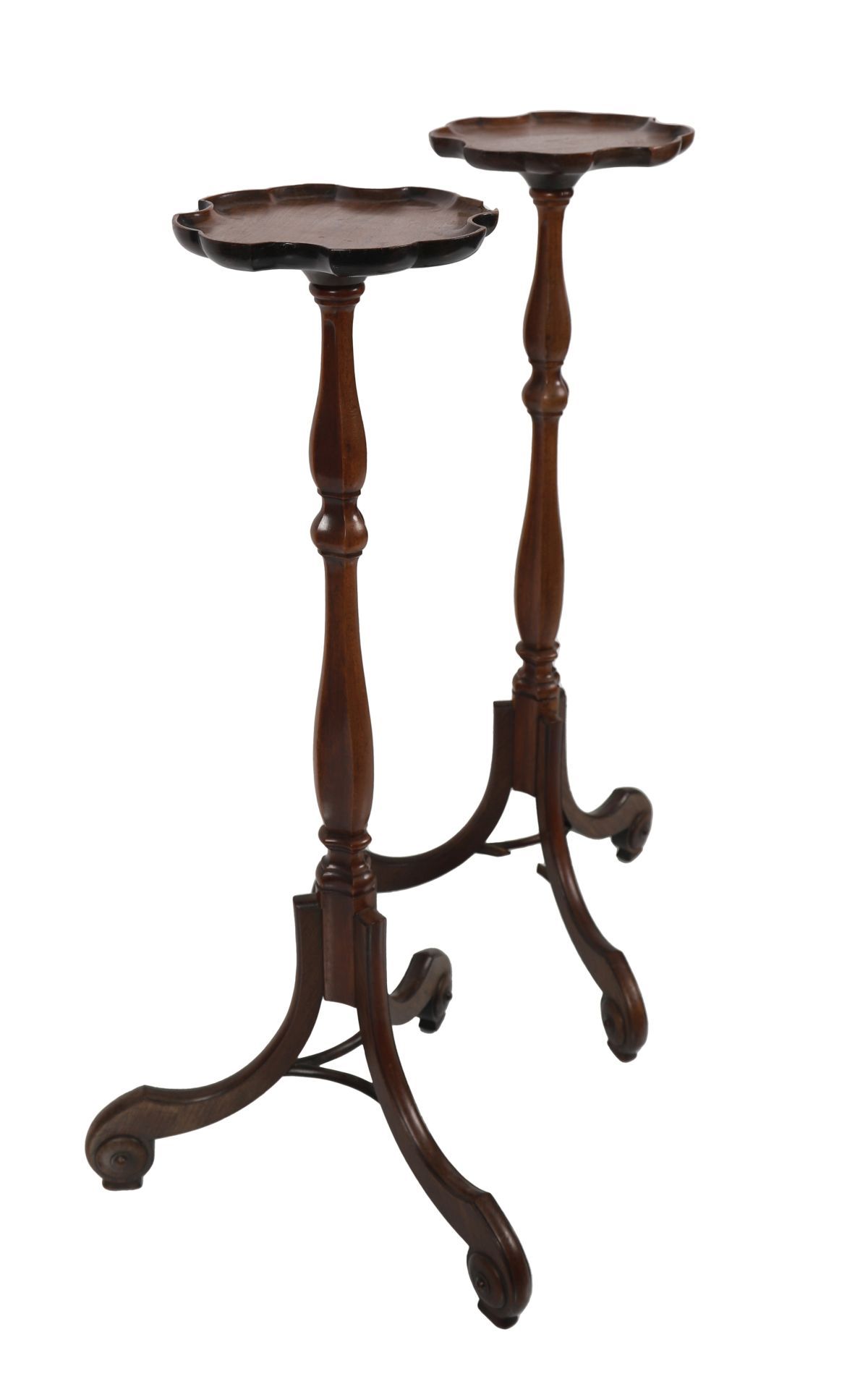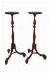 Pair of mahogany torchères, each with circular top above a reeded and turned column, raised on a carved tripod base.