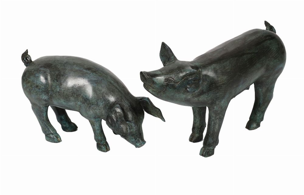 Two green patinated bronze piglets standing on all fours. One its head raised, the other looking downwards.