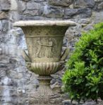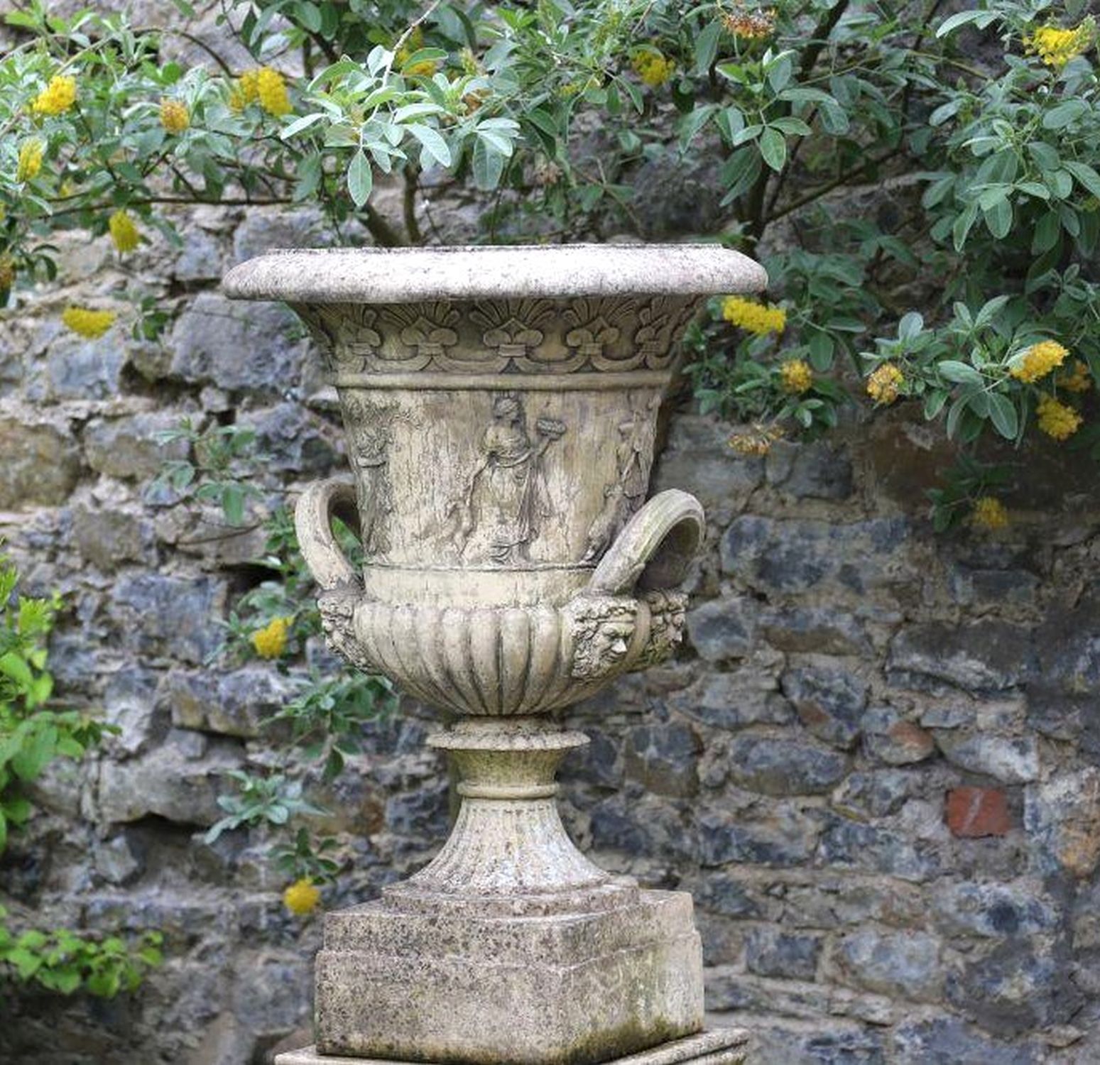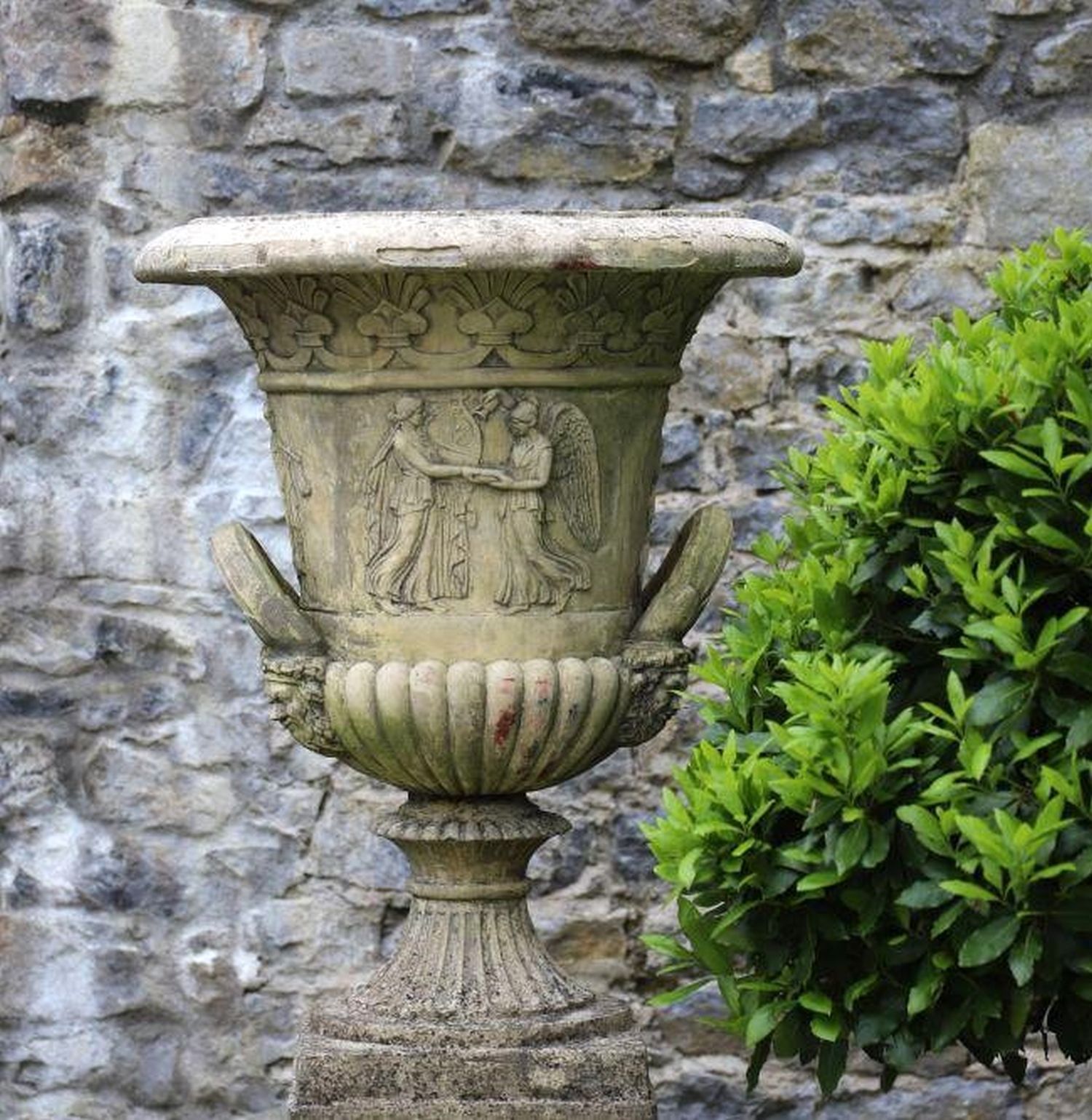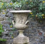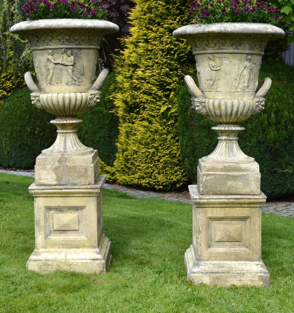 An imposing pair of sandstone garden urns after a design by Thomas Hope, each with flared rim, gadrooned lower body, and twin handles, relief-carved with classical figures. Each raised on a square section pedestal base.