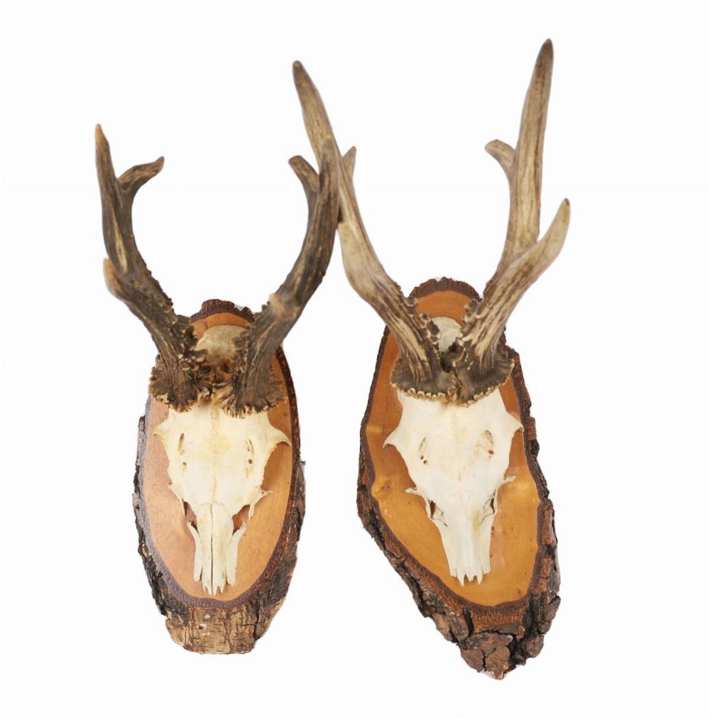 A pair of mounted roe deer antlers on shaped timber plaques with natural bark edges, each retaining full skull mounts.
