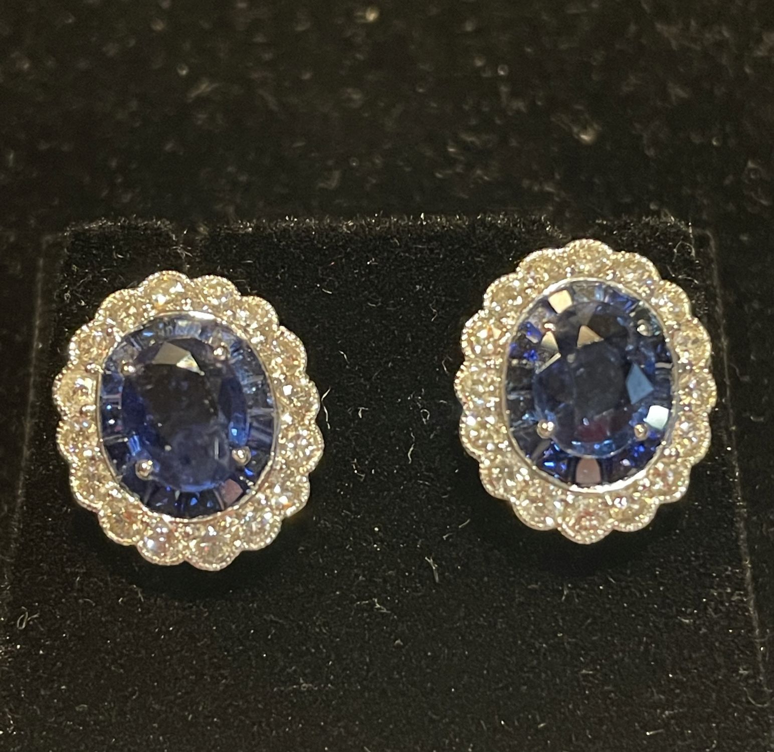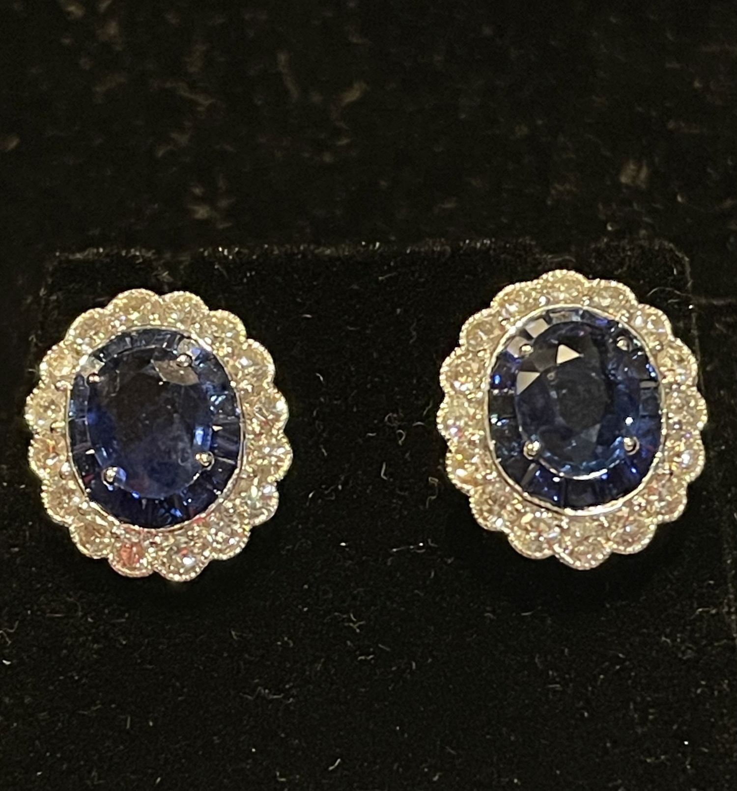 surrounded by brilliant cut diamonds in a millegrain setting, complete with safety backs. Sapphire weight: 5.50 ct.; diamond weight: 1.30 ct.; diamond colour: G; clarity: VS1.