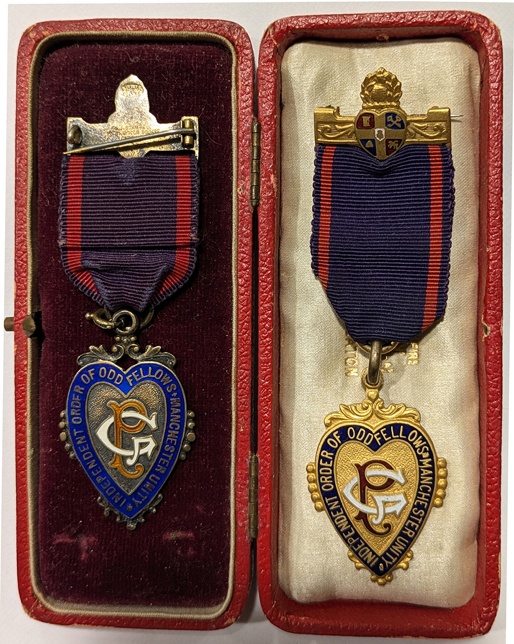Two gilt-metal and enamelled Independent Order of Odd Fellows Manchester Unity medals, monogrammed to front and engraved on reverse, presented to P.G. GE Lee (1912) and Bro. W. Cooper (1932). Both housed in vintage boxes by H. Slingsby & Son, Nuneaton.