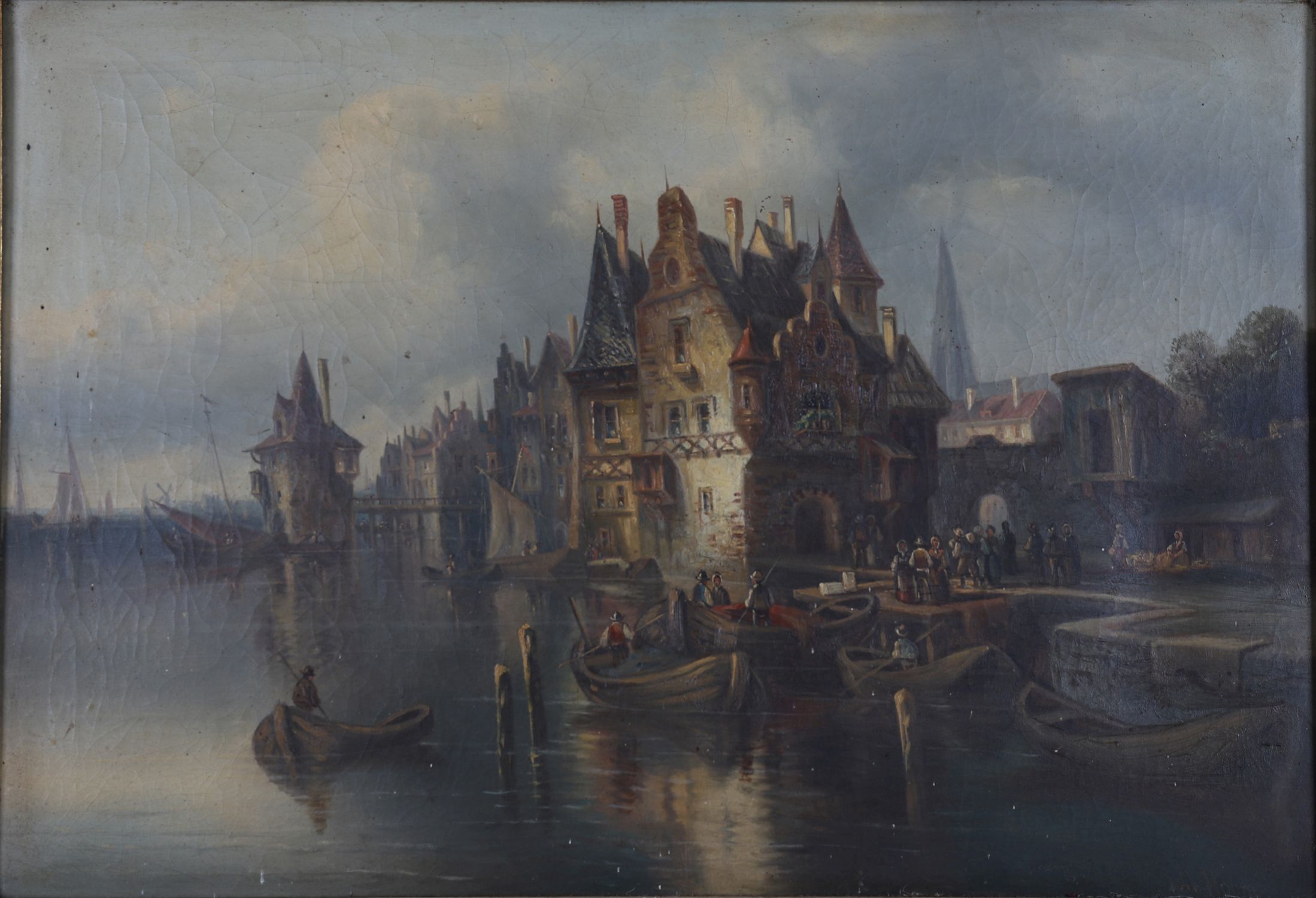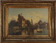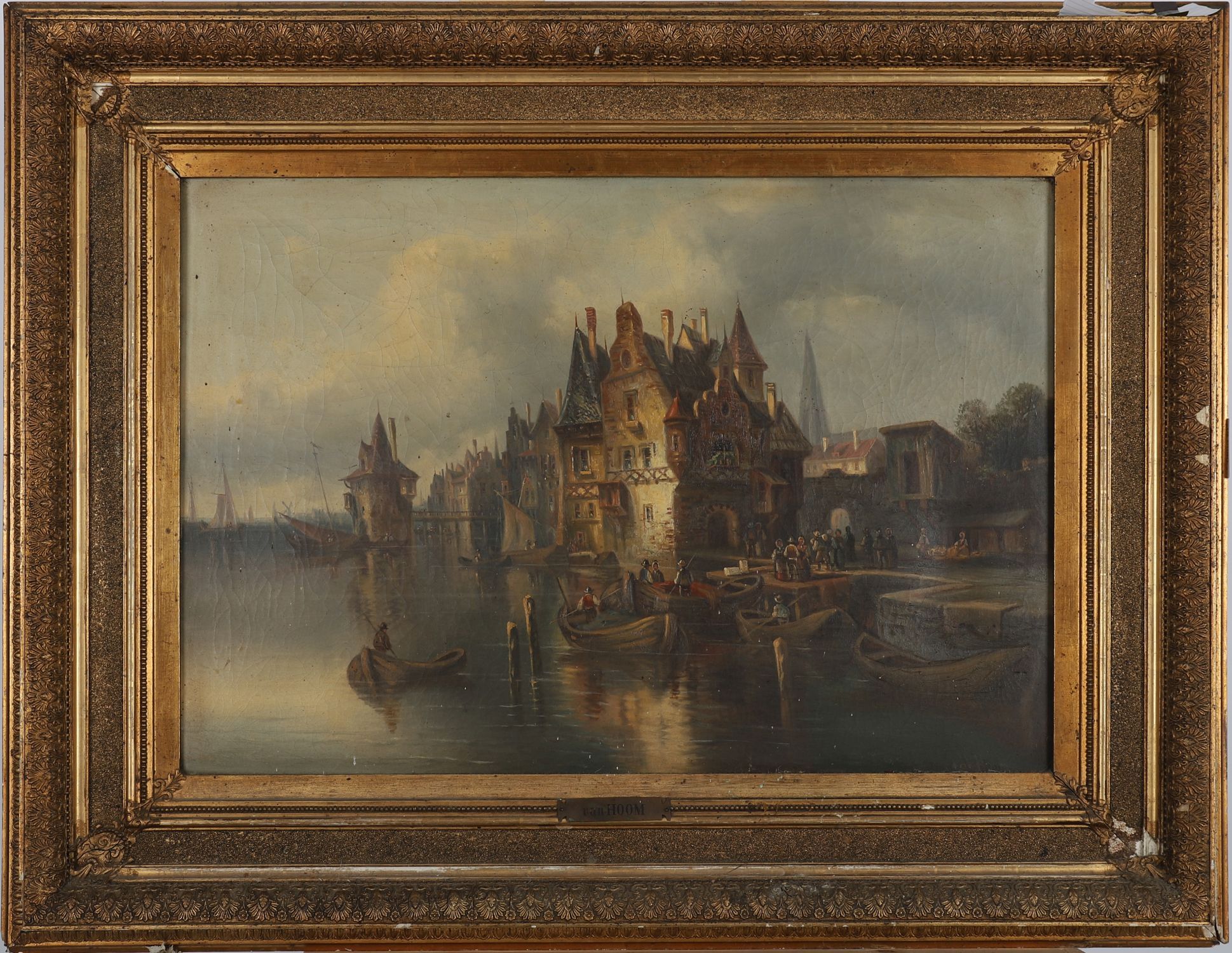 Two 19th-century oil on canvas paintings depicting bustling Dutch harbour scenes, each with moored sailing vessels, merchant buildings, and figures at work along the waterfront. Both works show fine handling of light and reflection on water, with warm tones suggesting late afternoon. Presented in matching ornate gilt frames.