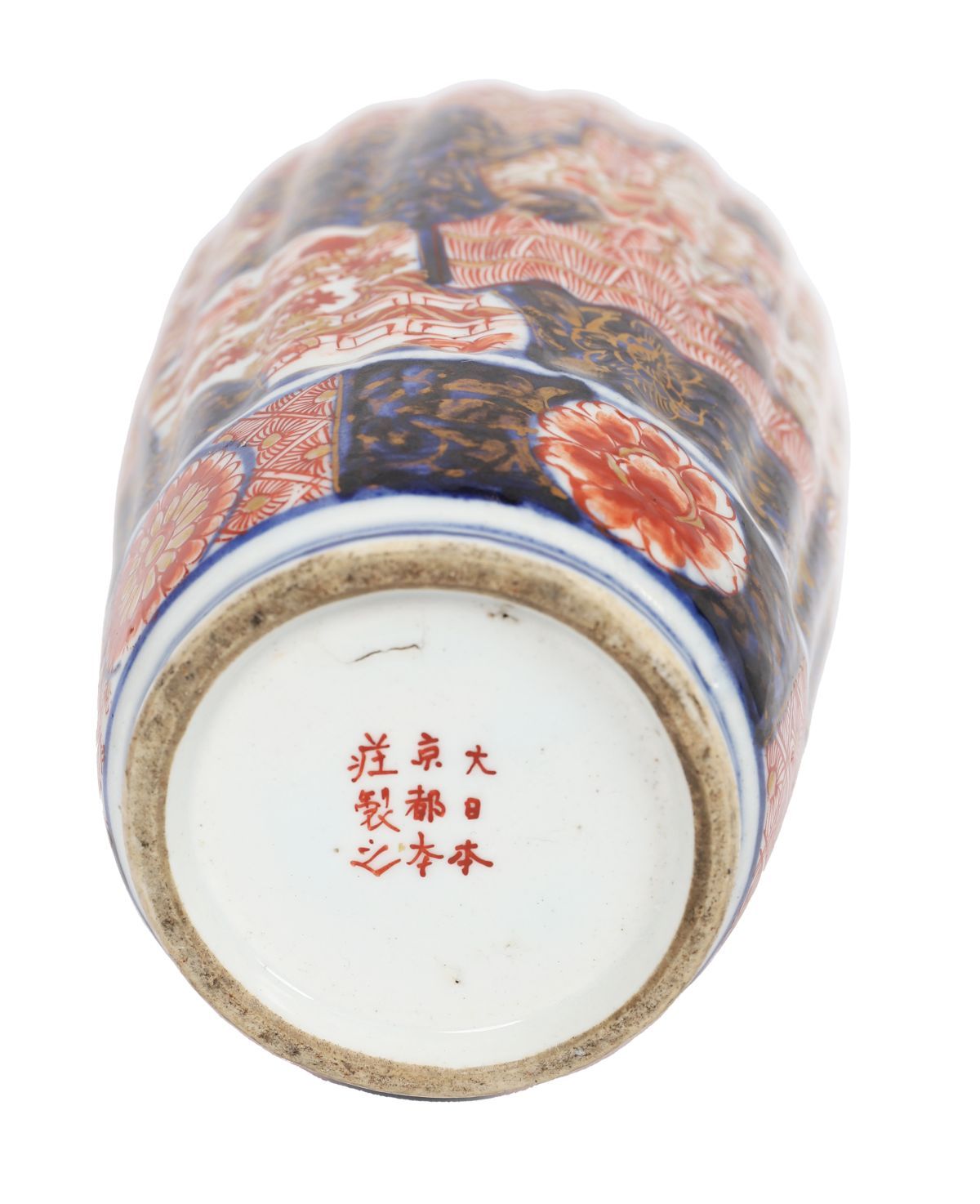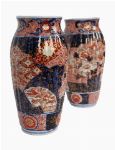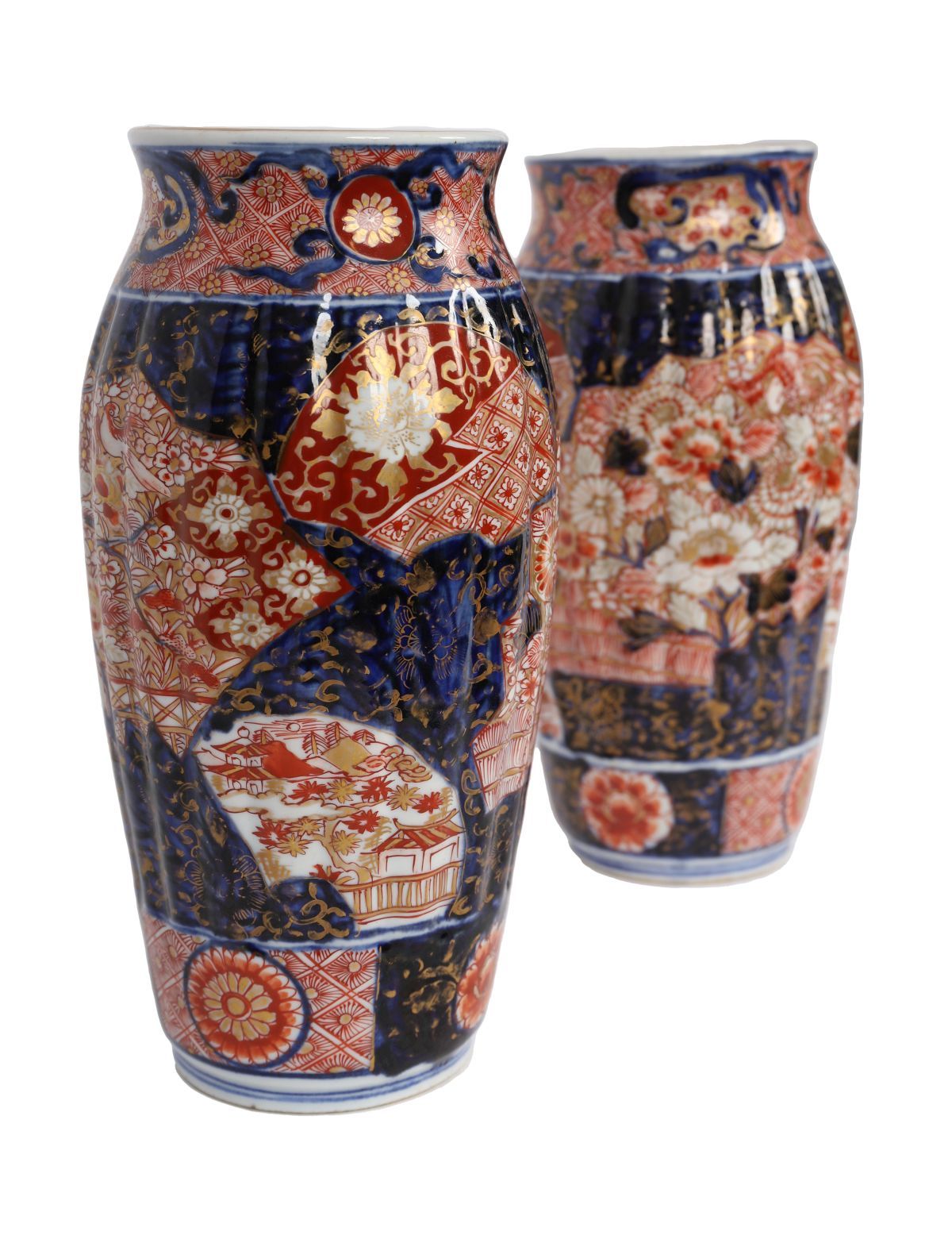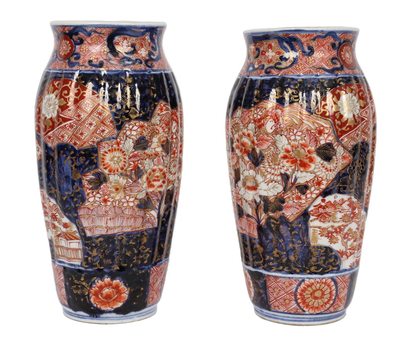 A pair of Oriental polychrome porcelain vases of baluster form, richly decorated in Imari palette with panels of floral sprays, diaper grounds and scrolling foliage in iron-red, cobalt blue and gilt.