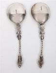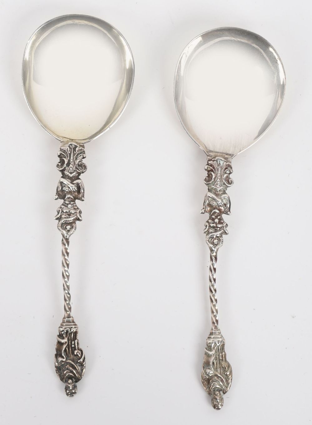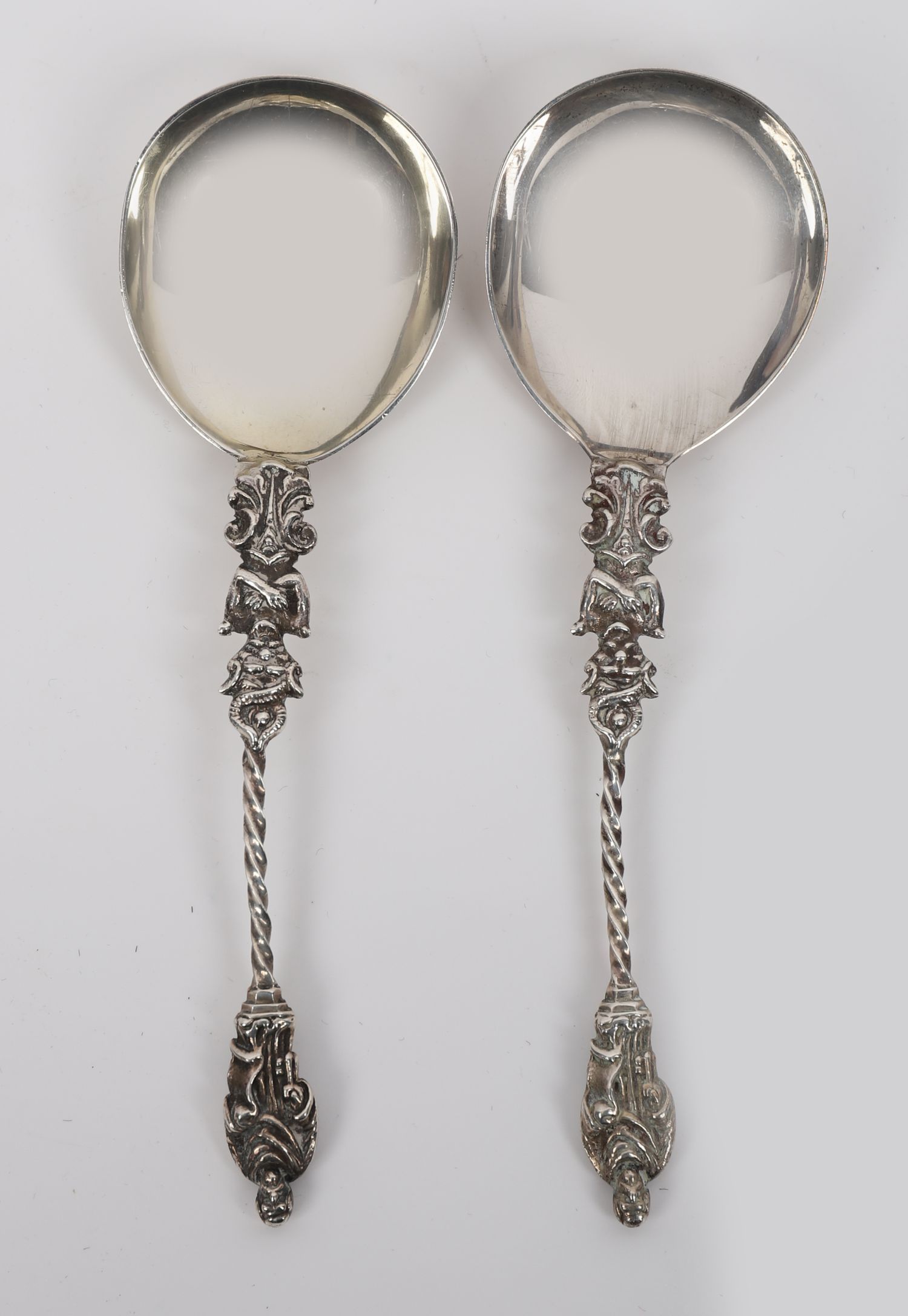 A pair of heavy silver Apostle spoons, each with cast figural terminal, twisted stem, and decorative stem masks above the bowl.
