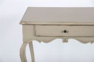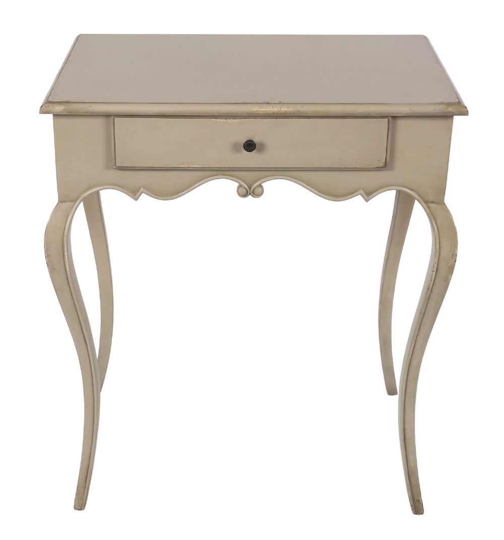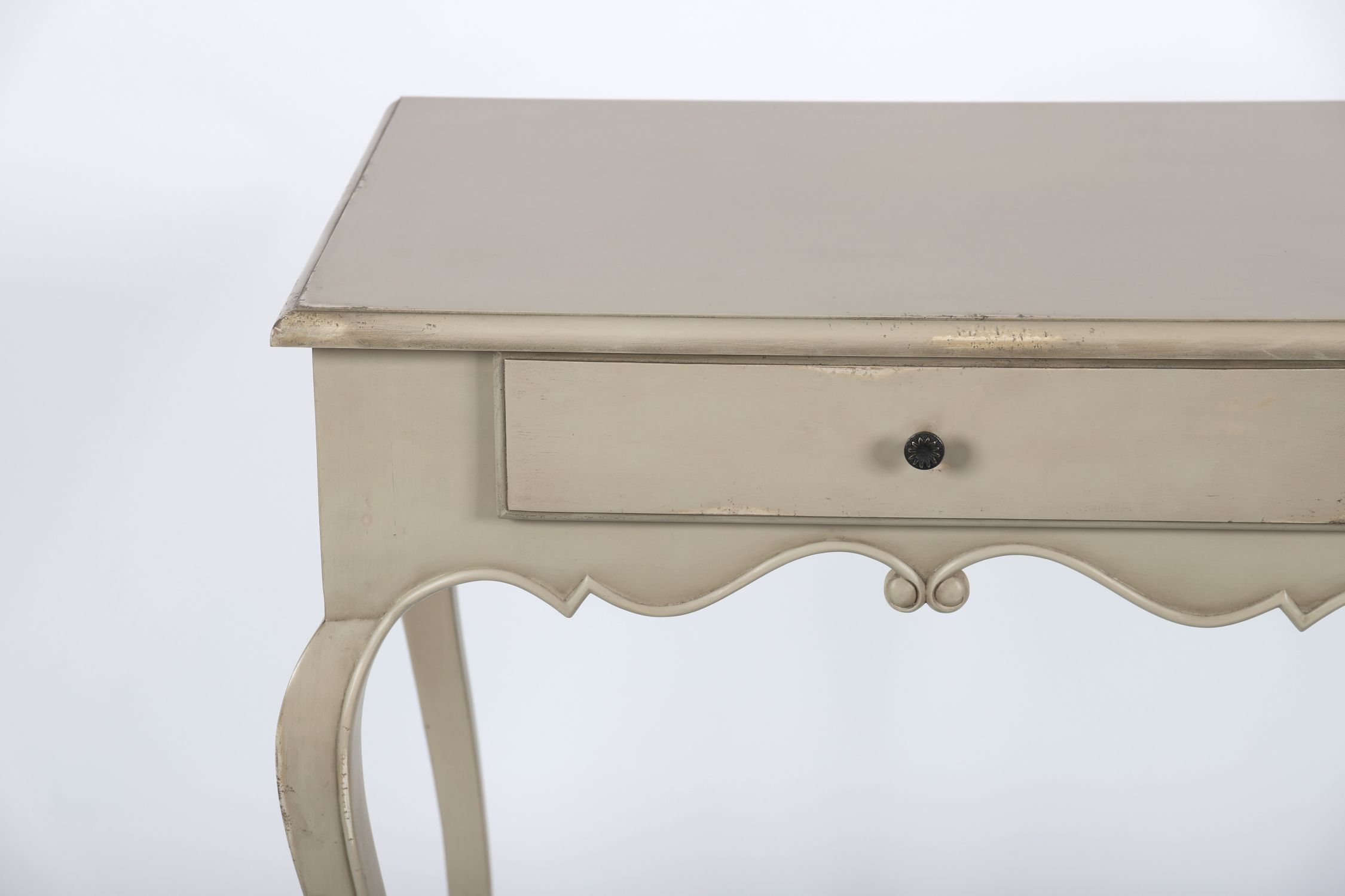 A pair of painted side tables in Louis XV style, each with a serpentine front, shaped cabriole legs, and single drawer. Finished in a pale grey tone with lightly distressed edges.