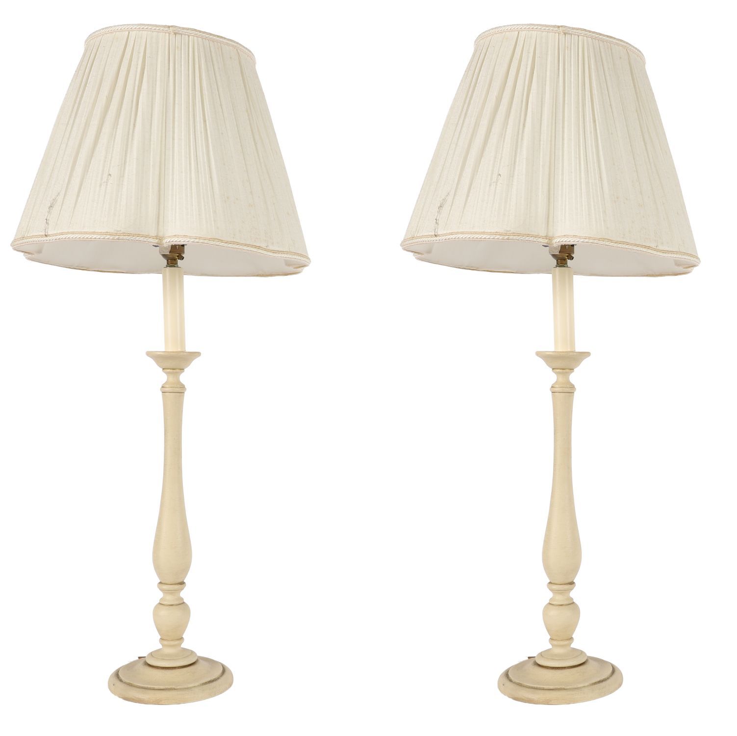 A pair of turned wood stemmed table lamps with cream painted finish and pleated fabric shades.