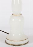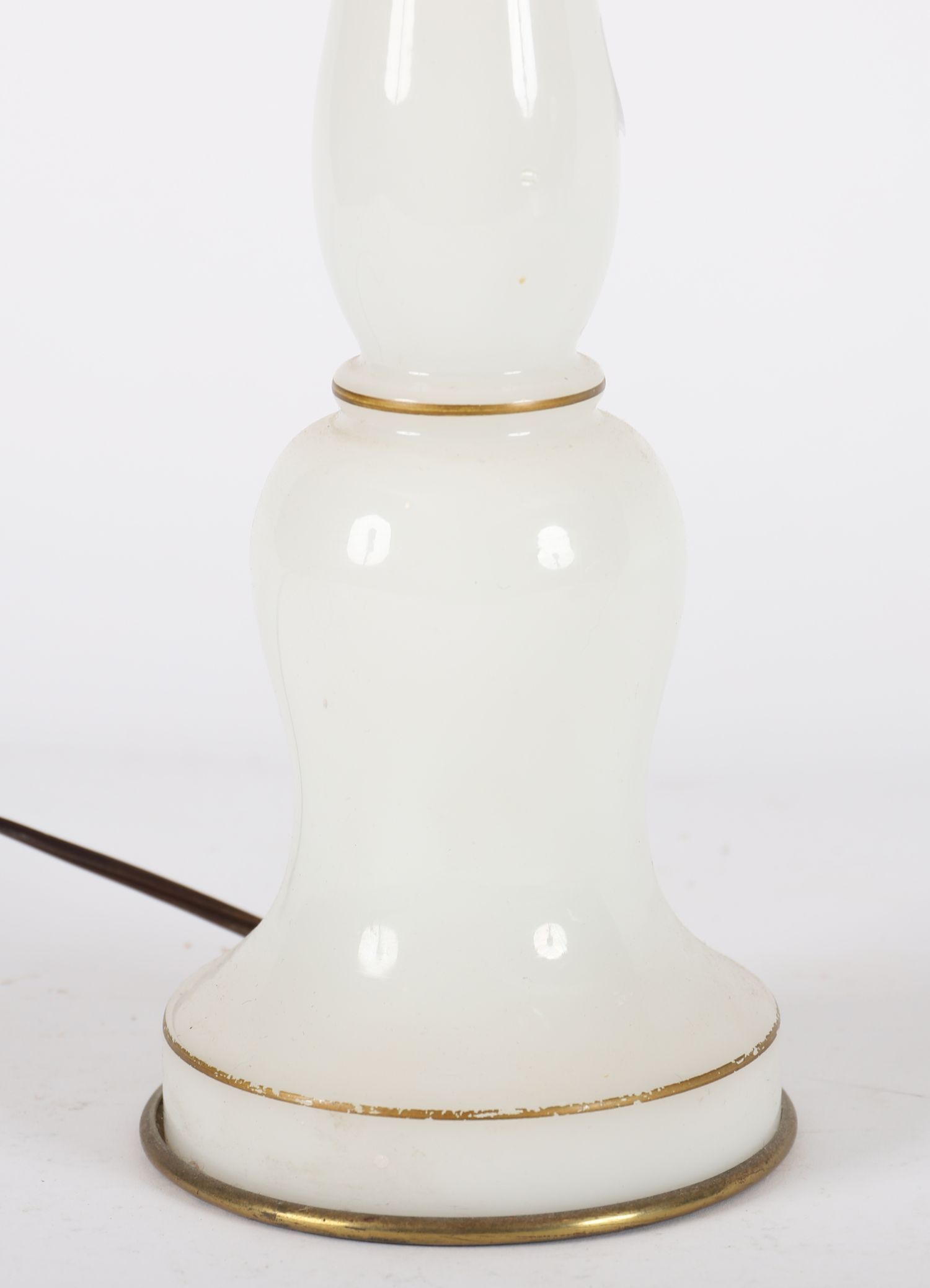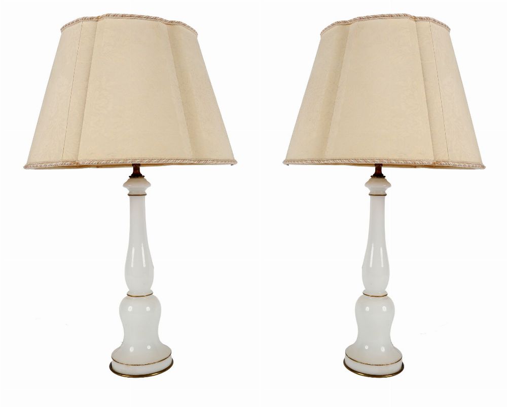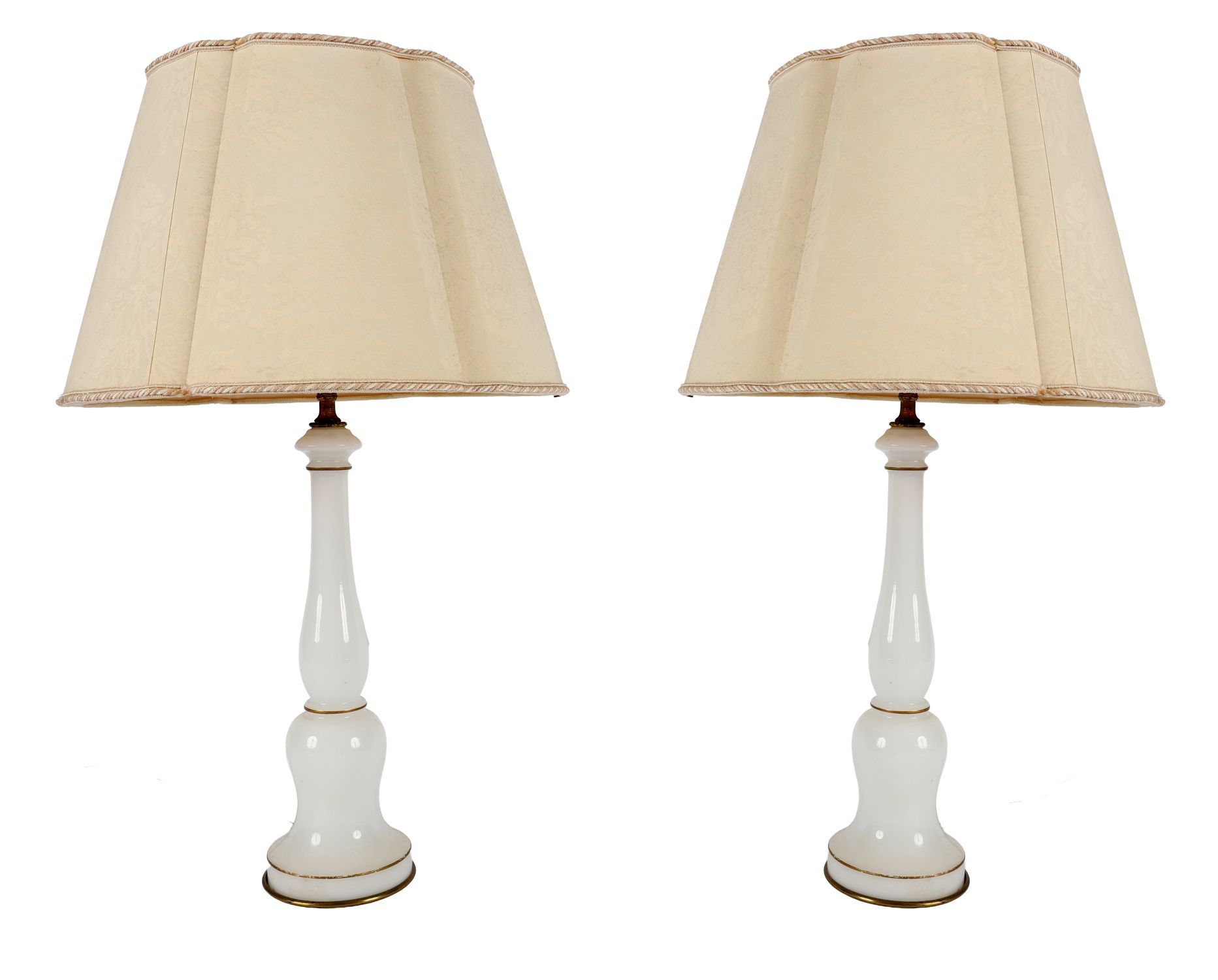 A pair of mid-20th-century pale opaline-style glass table lamps with gently shaped baluster forms, each with shaped fabric shade.