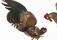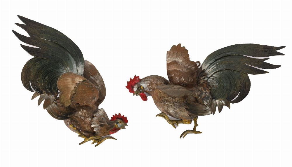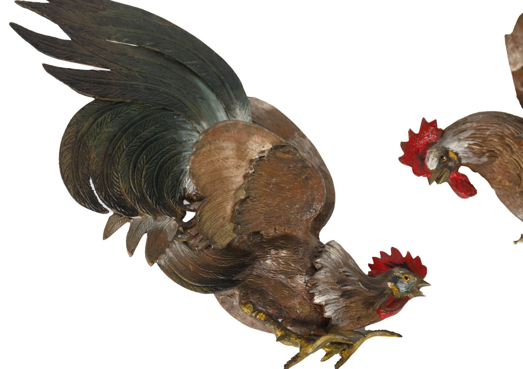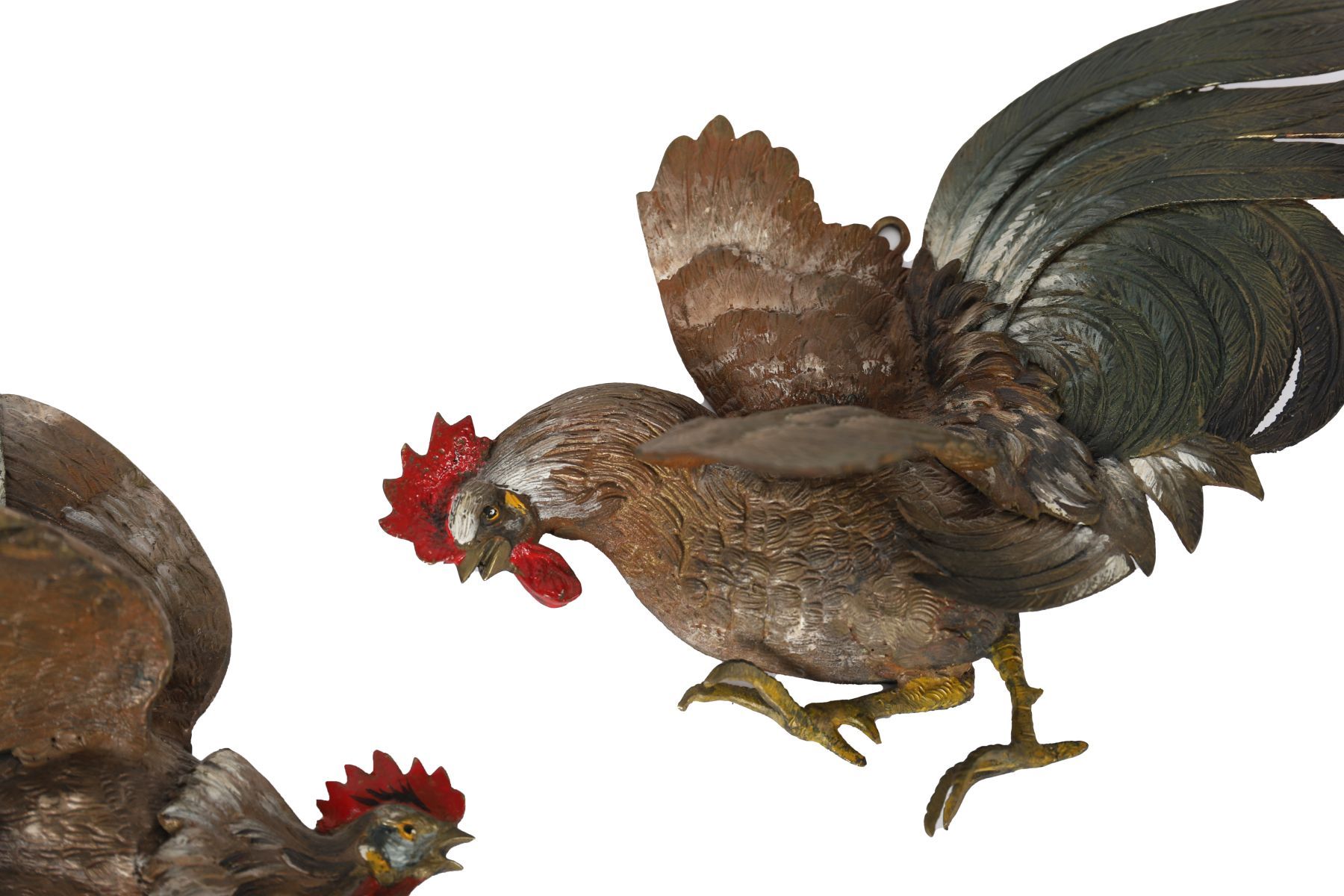 A pair of painted metal wall plaques in relief depicting cockerels, hand-painted in naturalistic tones with detailed plumage.