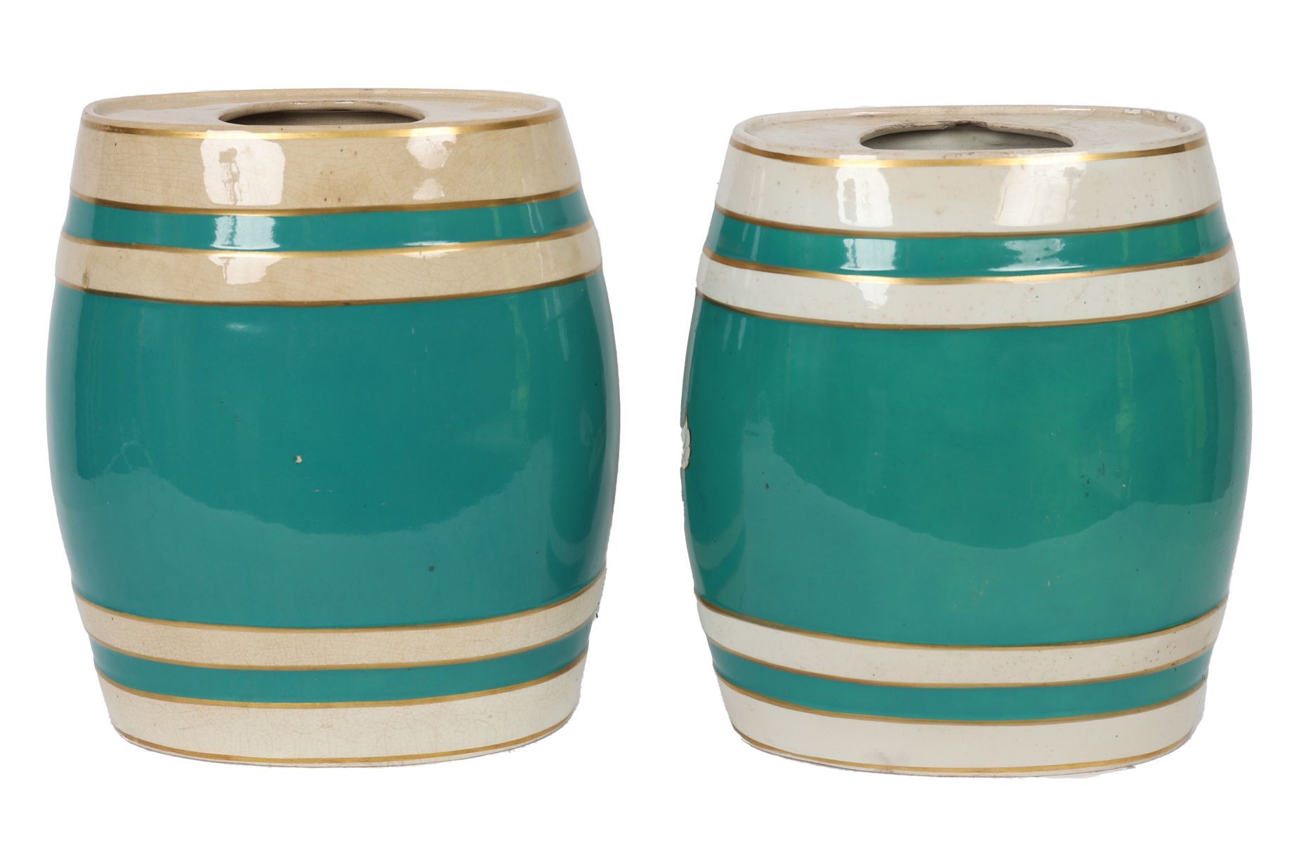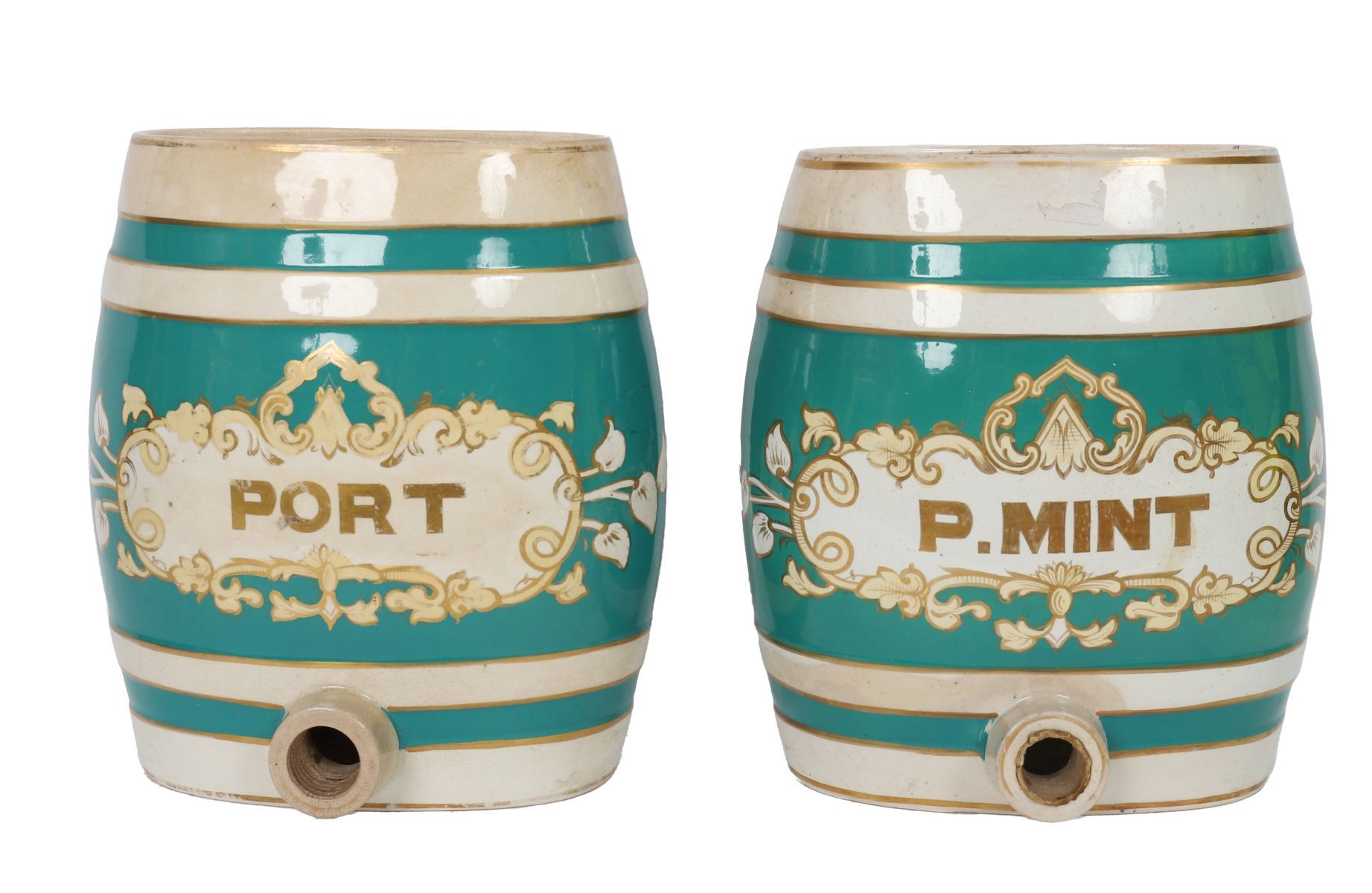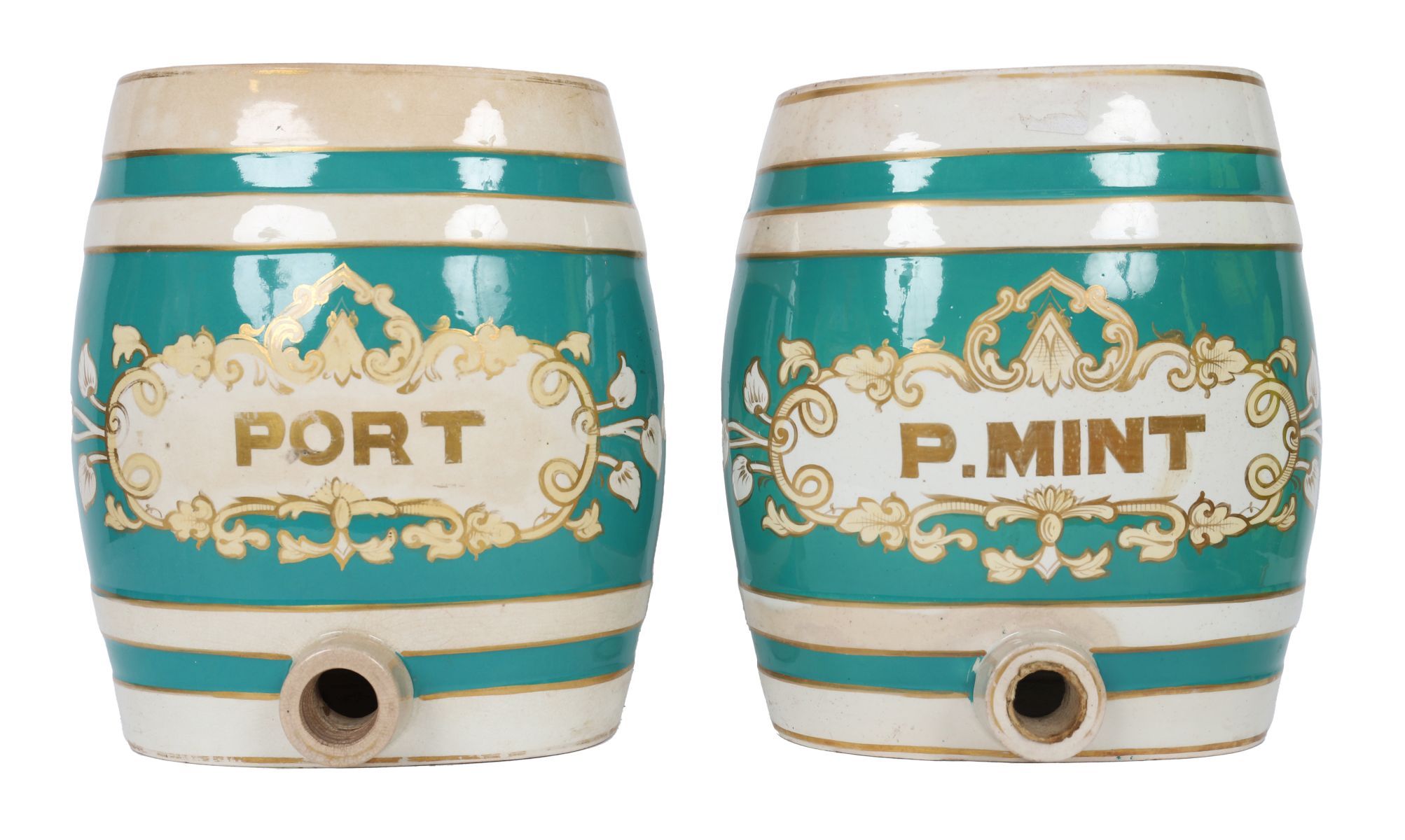 A pair of porcelain spirit barrels, decorated in green and gilt with rococo cartouches inscribed “PORT†and “P. MINT,†each of coopered form with spigot aperture.