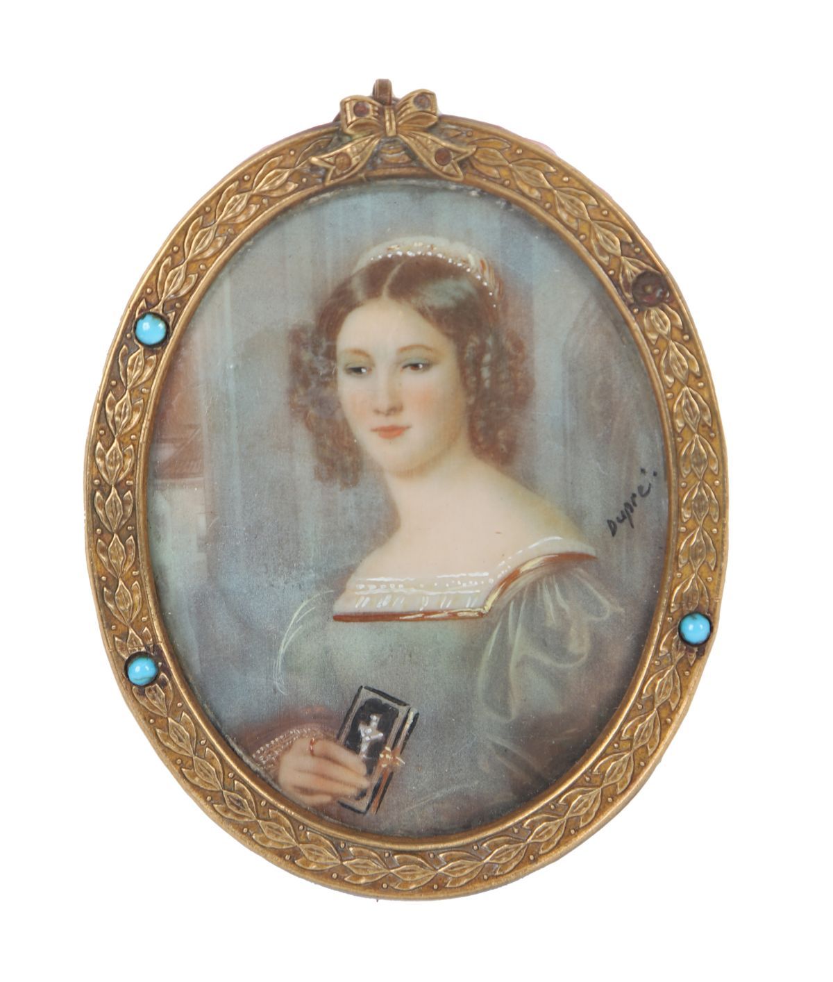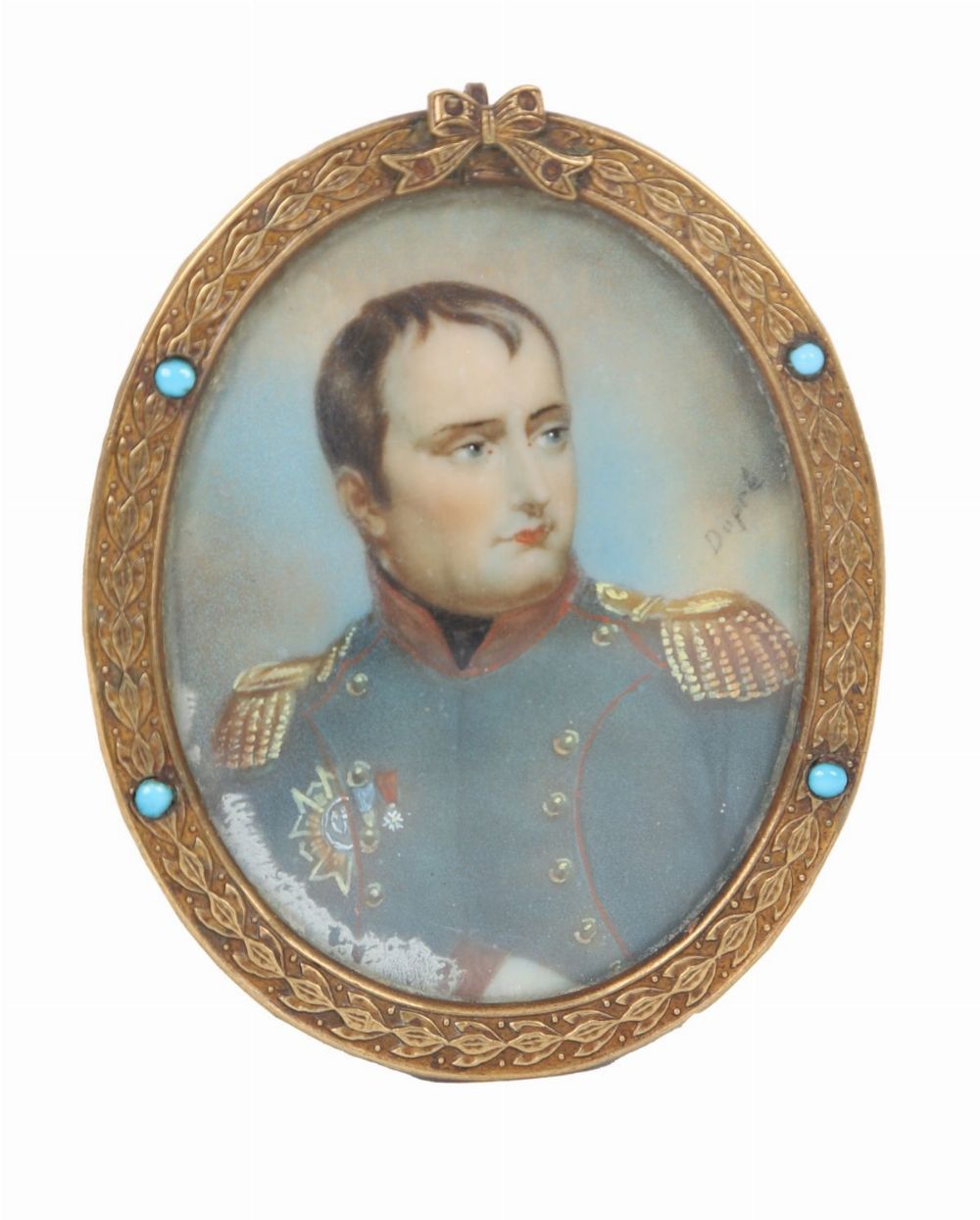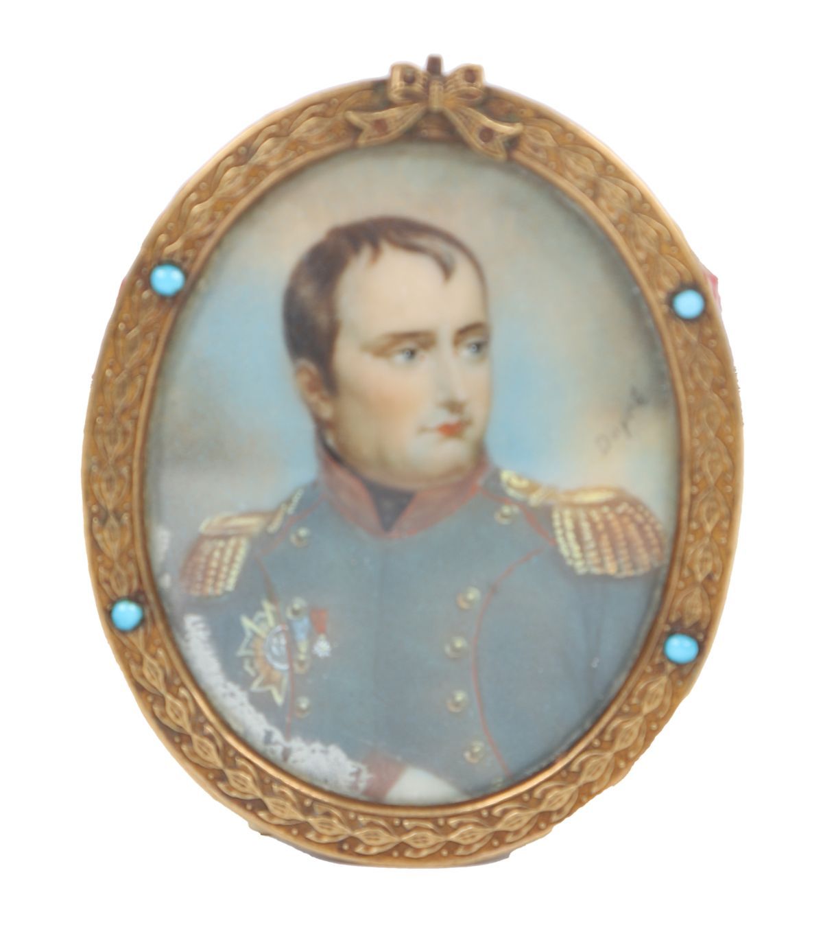 Oval portrait miniatures depicting Napoleon Bonaparte and Joséphine de Beauharnais, each finely painted on ivory or similar substrate and housed in matching gilt metal oval frames, the bezels set with turquoise cabochons. Late 19th to early 20th century, in the Empire revival taste.