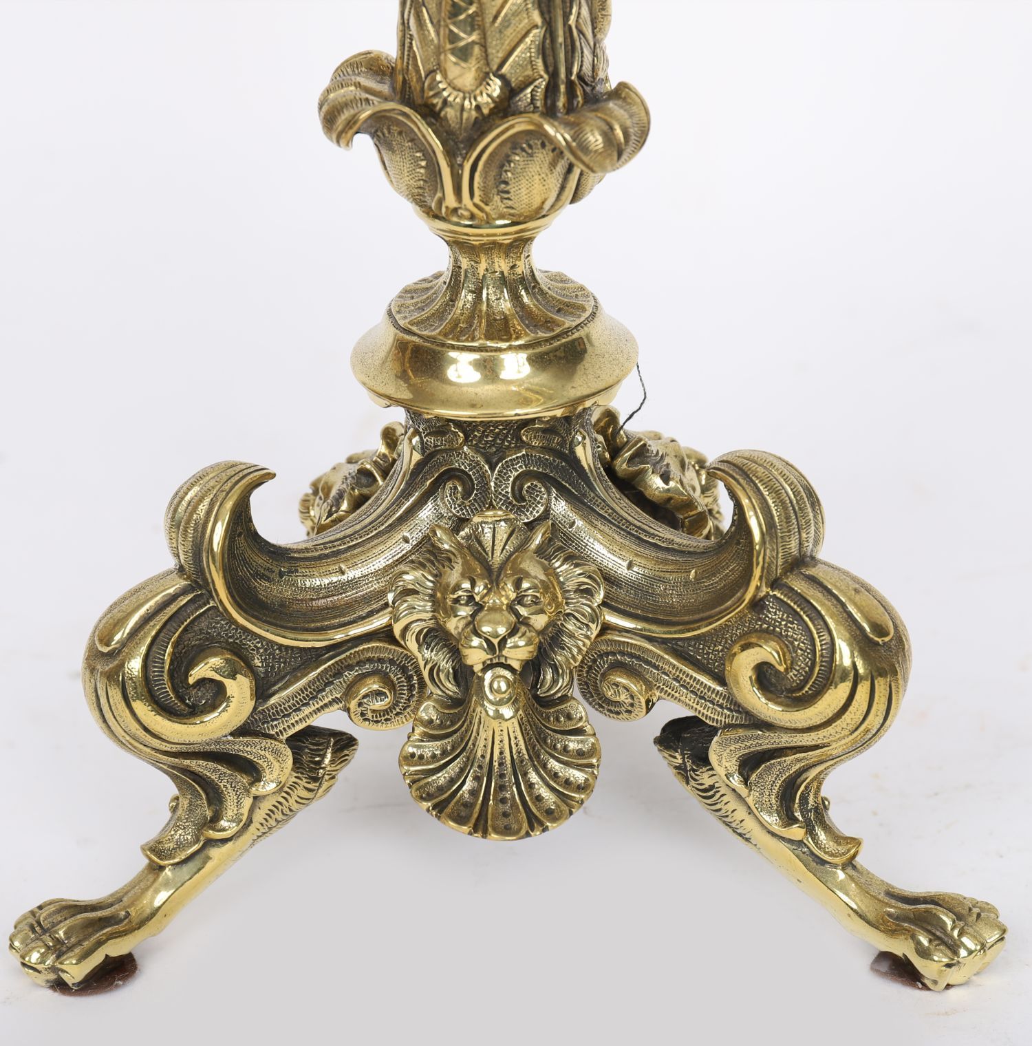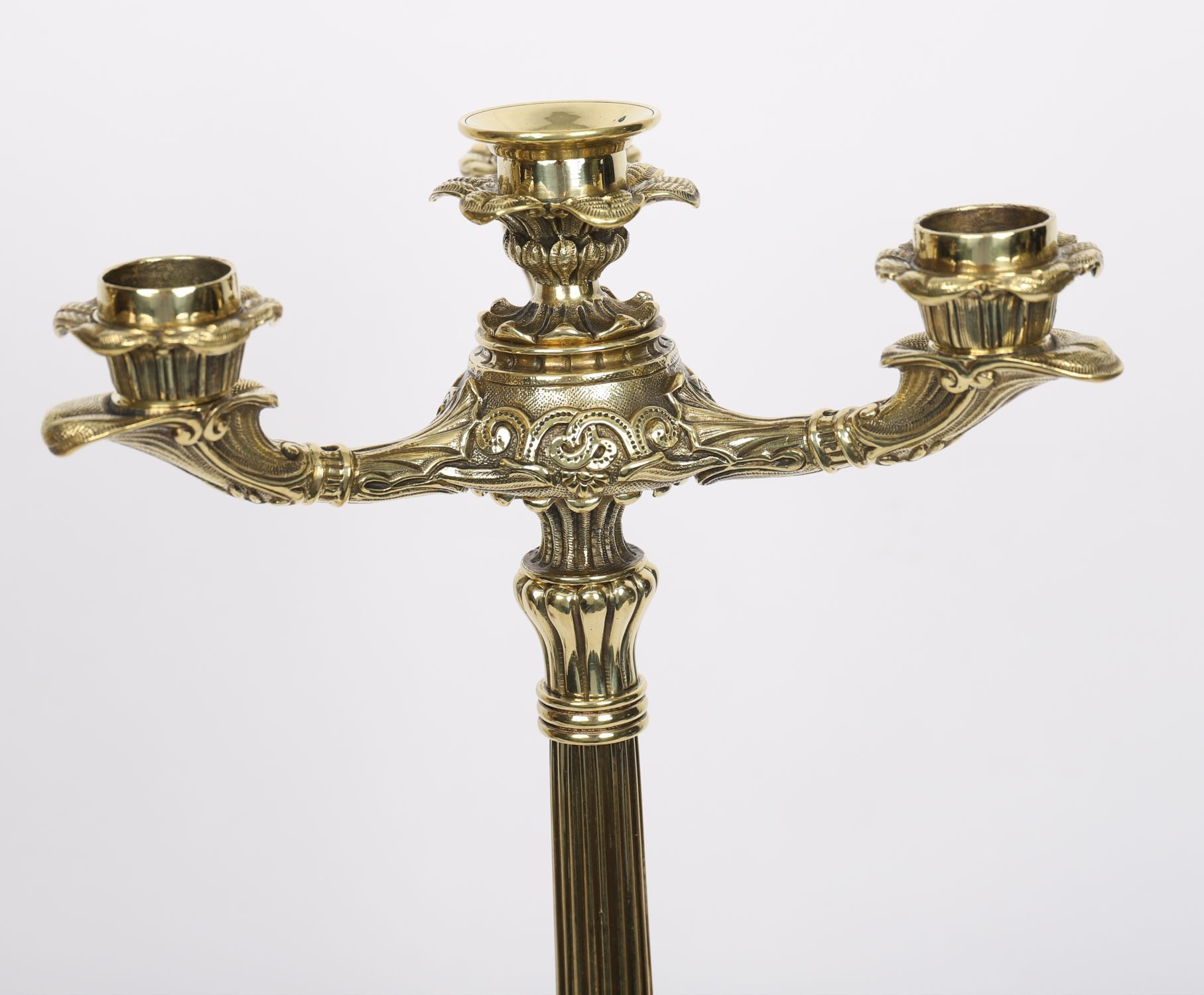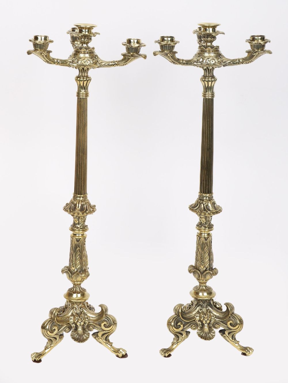 A fine pair of Regency period brass candelabra, each with four scrolling candle arms centred by a raised nozzle, supported on reeded stems with elaborate foliate capitals and bases. The tripartite bases are richly cast with lion masks, shells, and scrollwork, raised on paw feet.