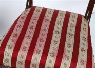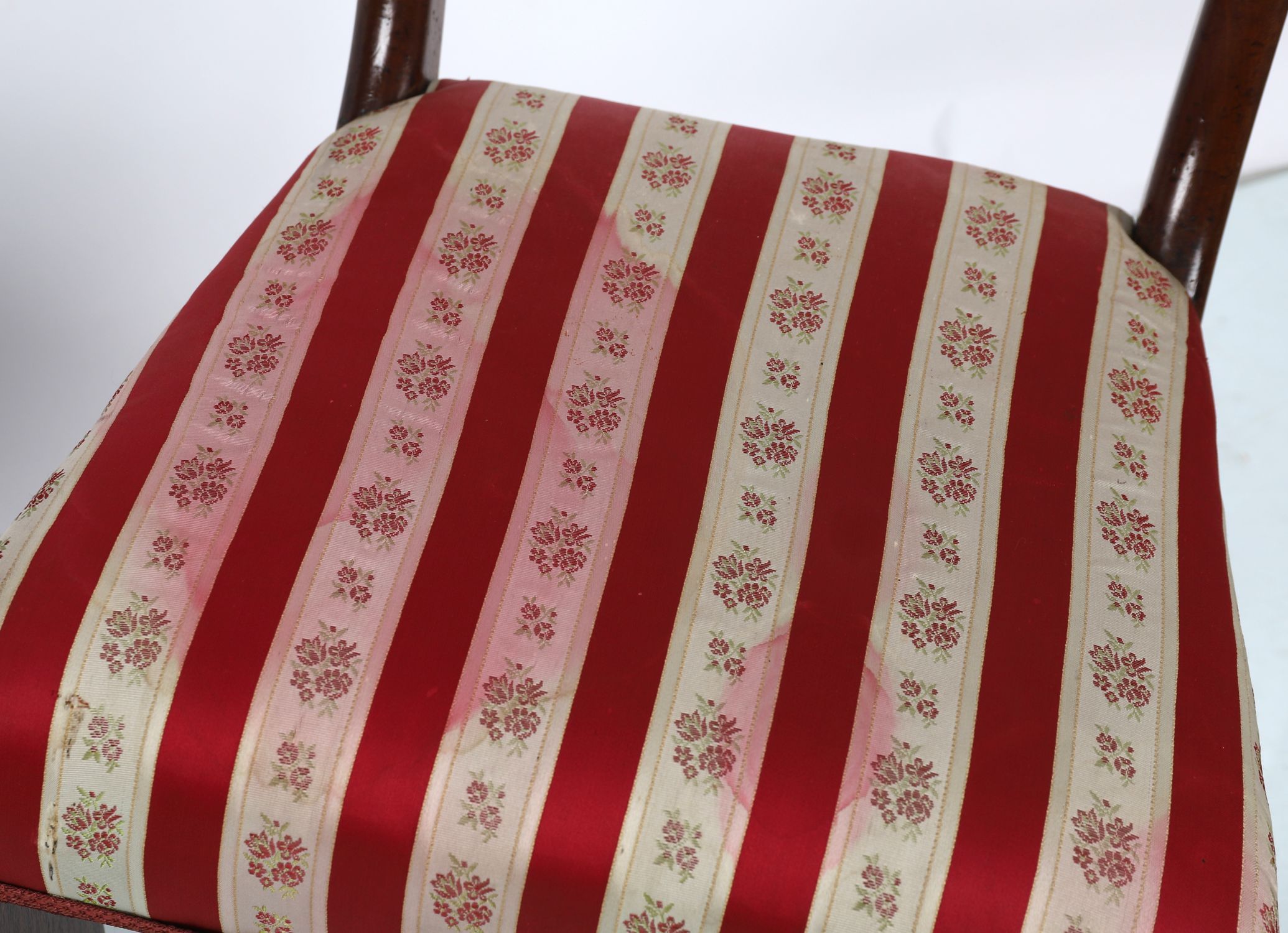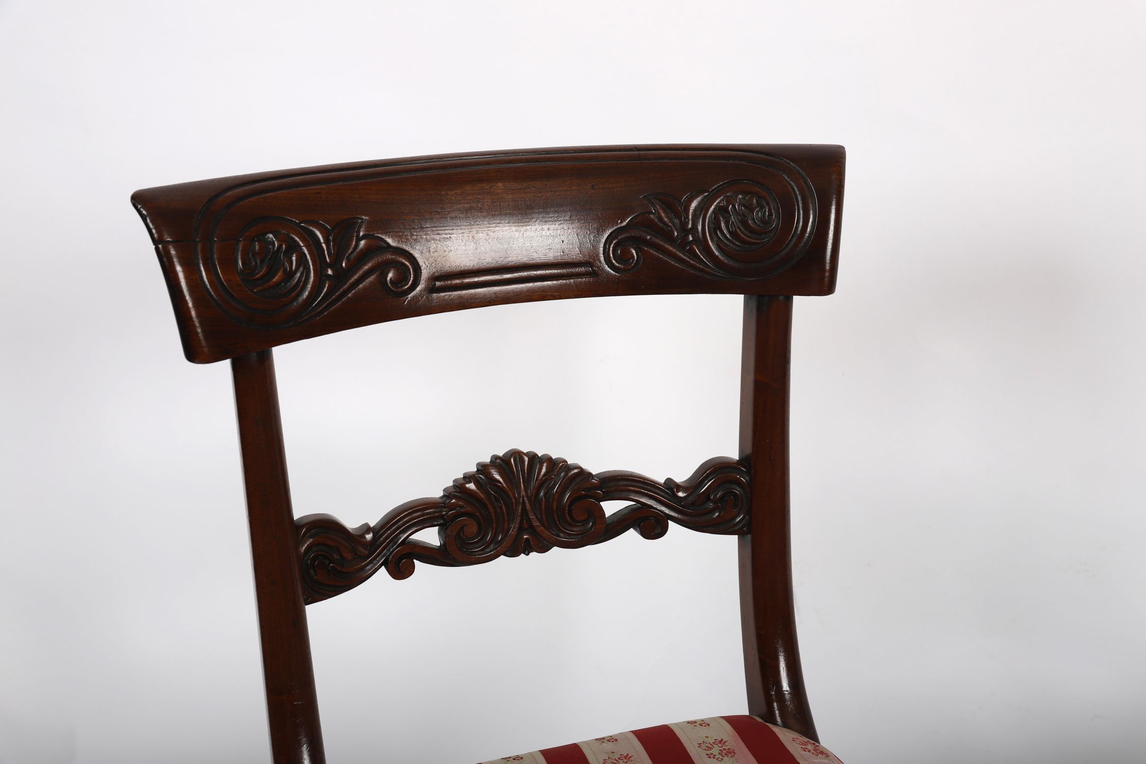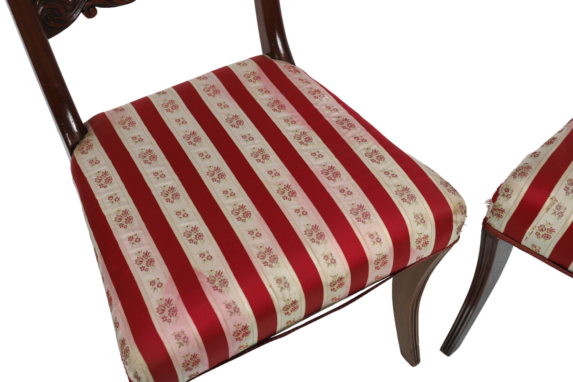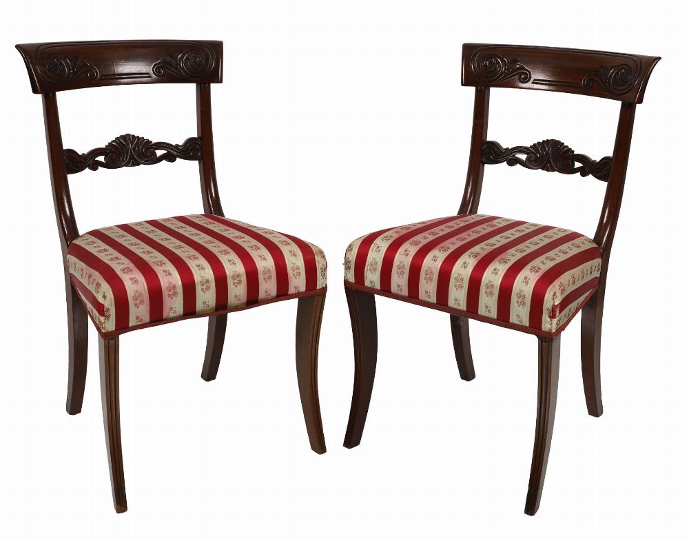 A fine pair of Regency period mahogany side chairs, each with a curved top rail carved with scrolling detail above a pierced and carved foliate horizontal splat. The drop-in seats are upholstered in later striped red and cream floral fabric. Raised on elegant sabre front legs and outswept back legs.