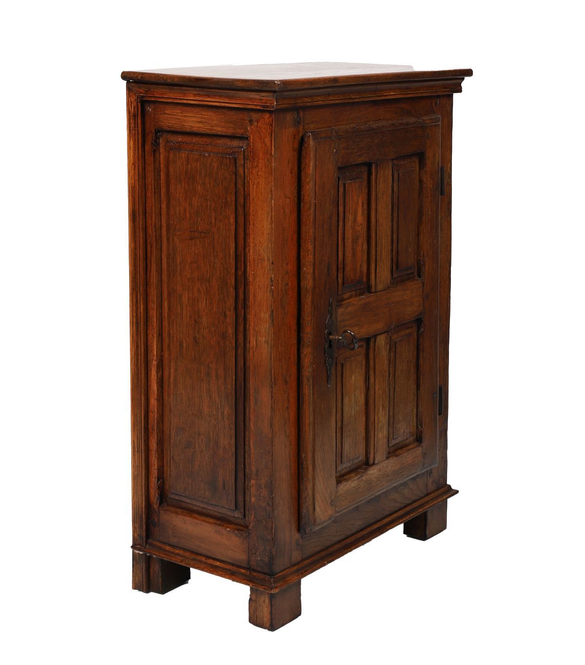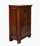 A pair of remodelled oak bedside cabinets, each with moulded panel door and iron latch, constructed using 18th-century timber panels, with pegged joints and period-style hardware.