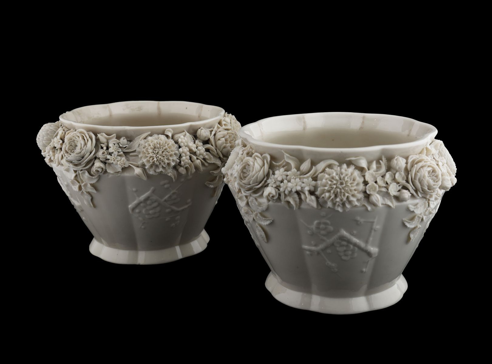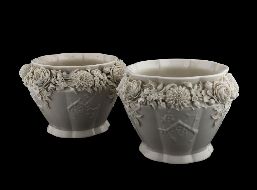 Matched pair of cream-coloured Belleek porcelain jardinieres with applied floral garlands and moulded panels, impressed marks to base.