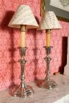 Each with octagonal base, baluster stem and removable candle nozzle, together with fitted metal and glass shades. Late 19th century.