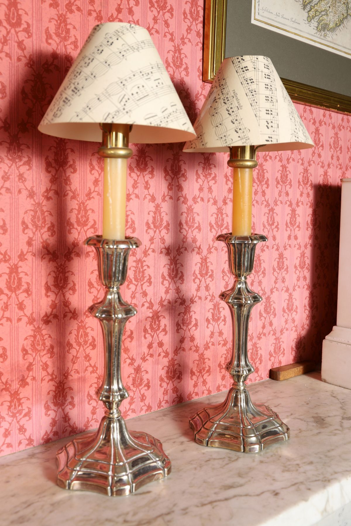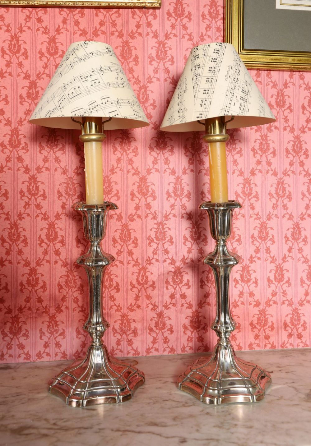 Lot 460 PAIR OF SHEFFIELD-PLATED CANDLESTICKS AND SHADES