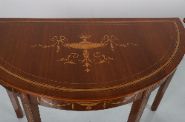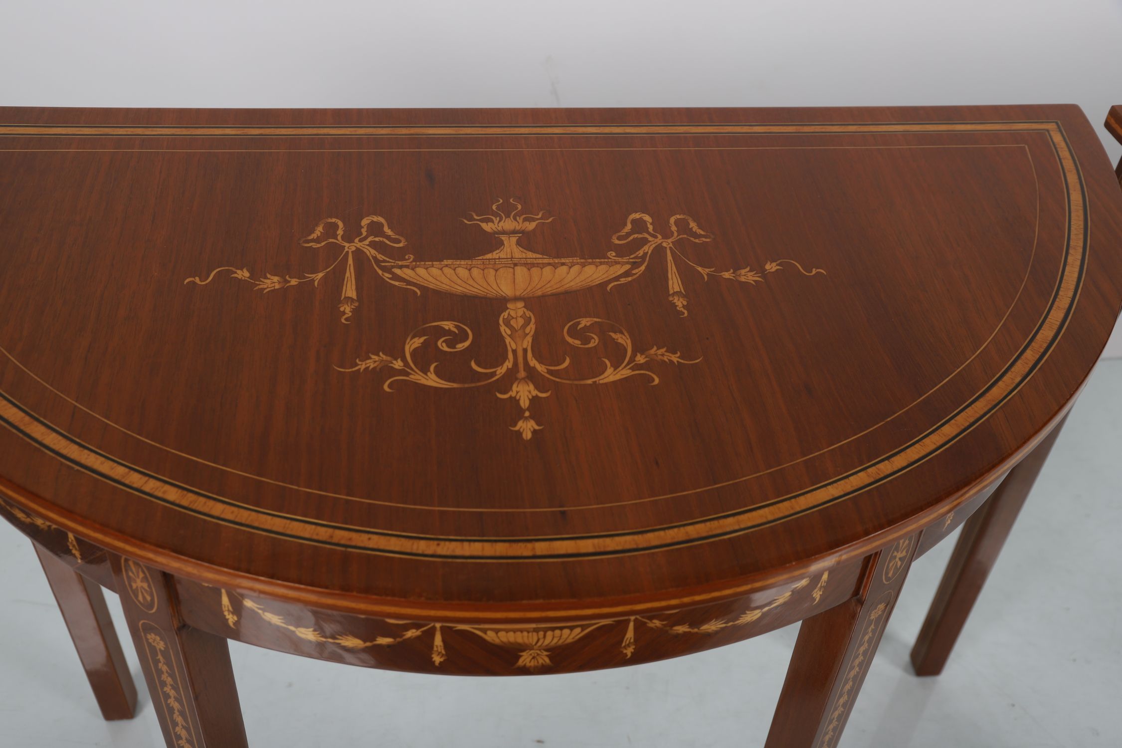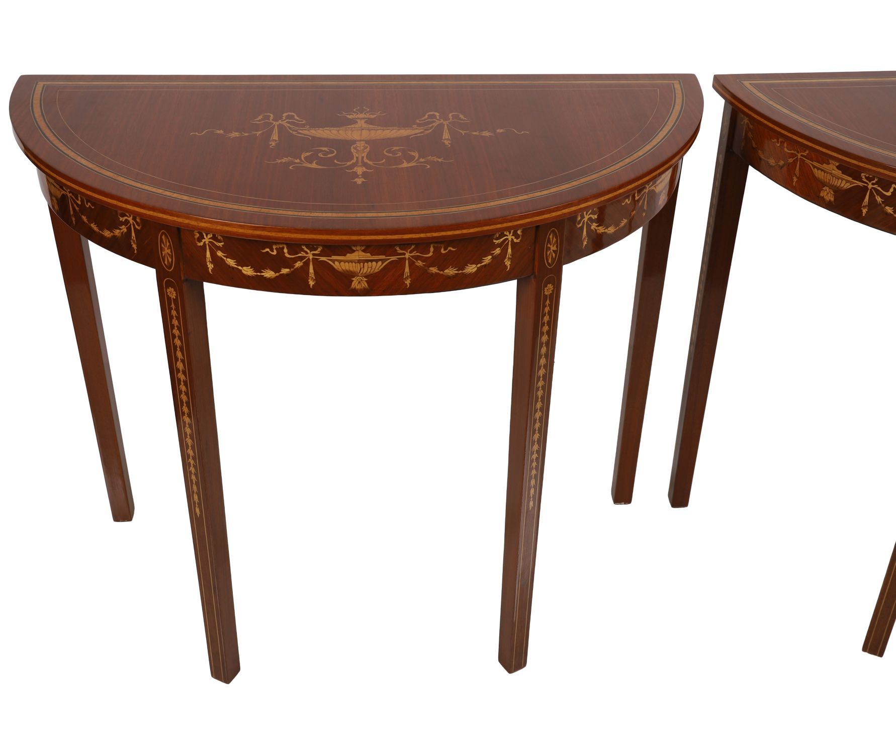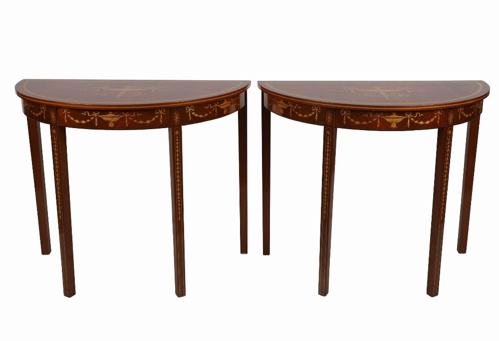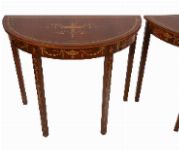 A pair of late 19th-century mahogany side tables, each with demi-lune top inlaid with urns, husks, and banding, raised on square tapering legs.