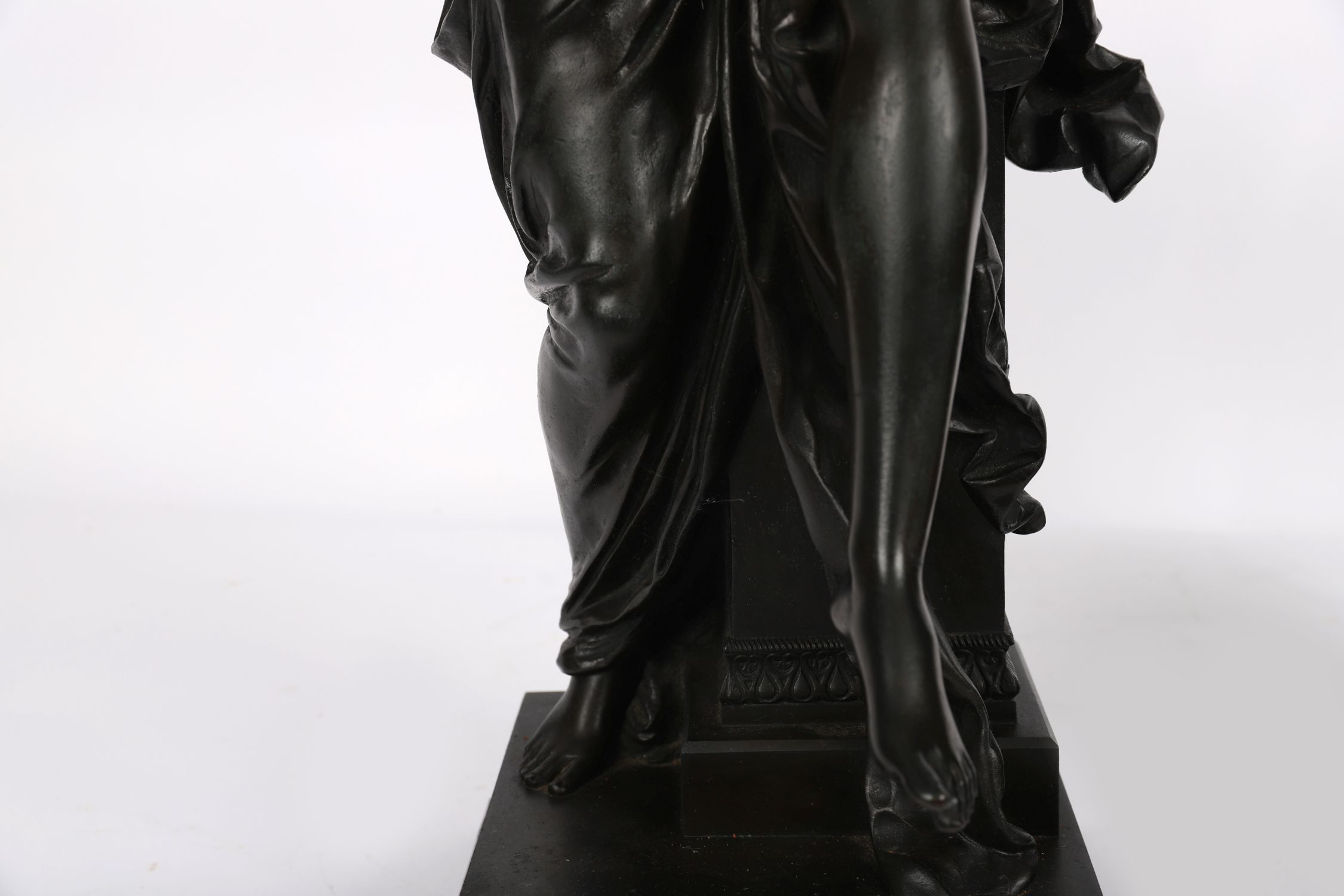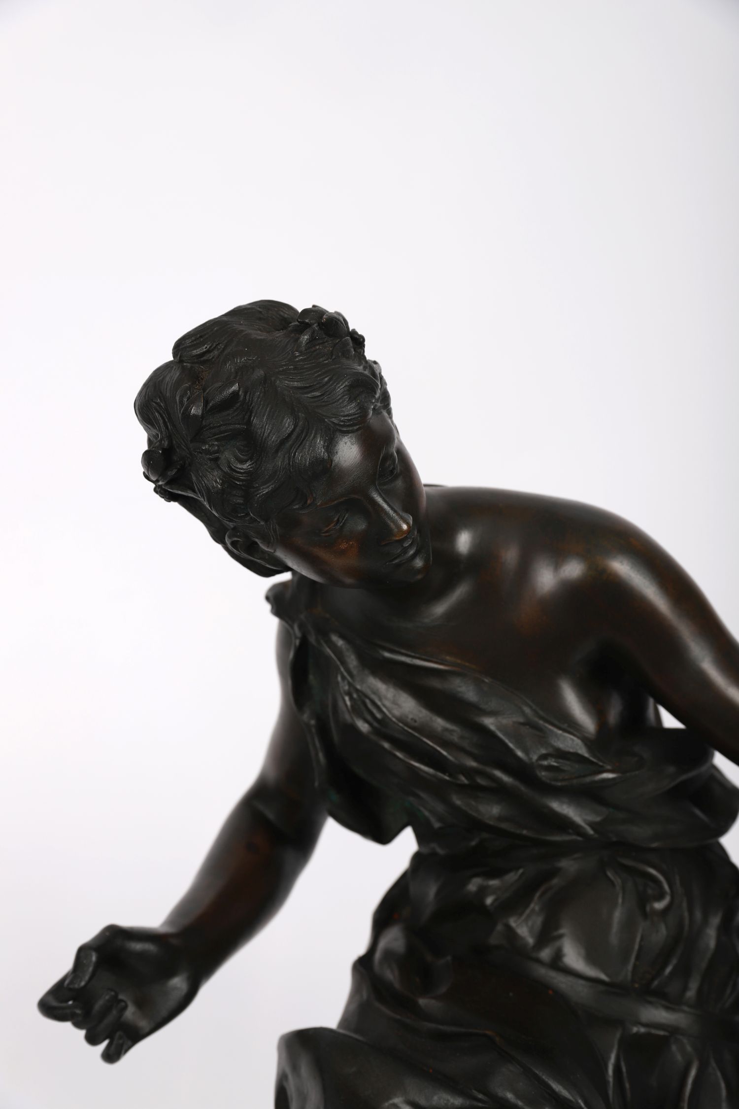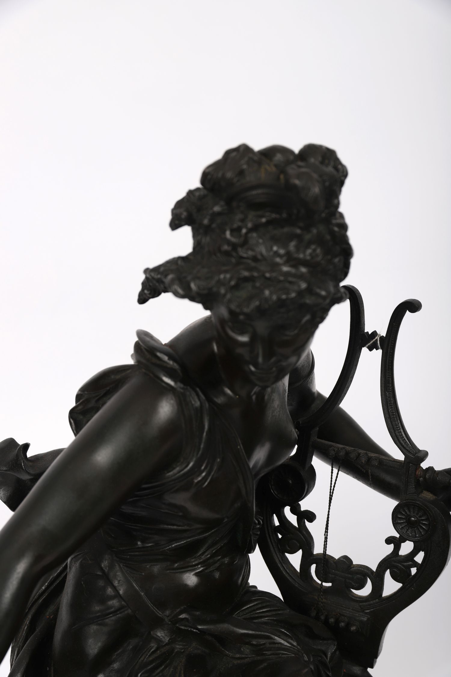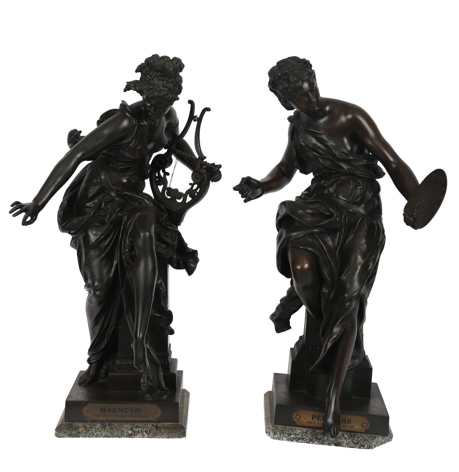 A fine pair of 19th-century patinated bronze sculptures by Albert-Ernest Carrier-Belleuse (French, 1824-1887), titled Harmonie and Péitho. Each figure is cast in dynamic pose, draped in classical attire, and raised on stepped rectangular bases with inset titles and green marble plinths. Harmonie is shown holding a lyre, representing the spirit of music, while Péitho (the Greek goddess of persuasion and seduction) gestures gracefully with a disc. Both works are crisply cast with excellent attention to anatomical detail and hair texture, bearing the artist's signature.