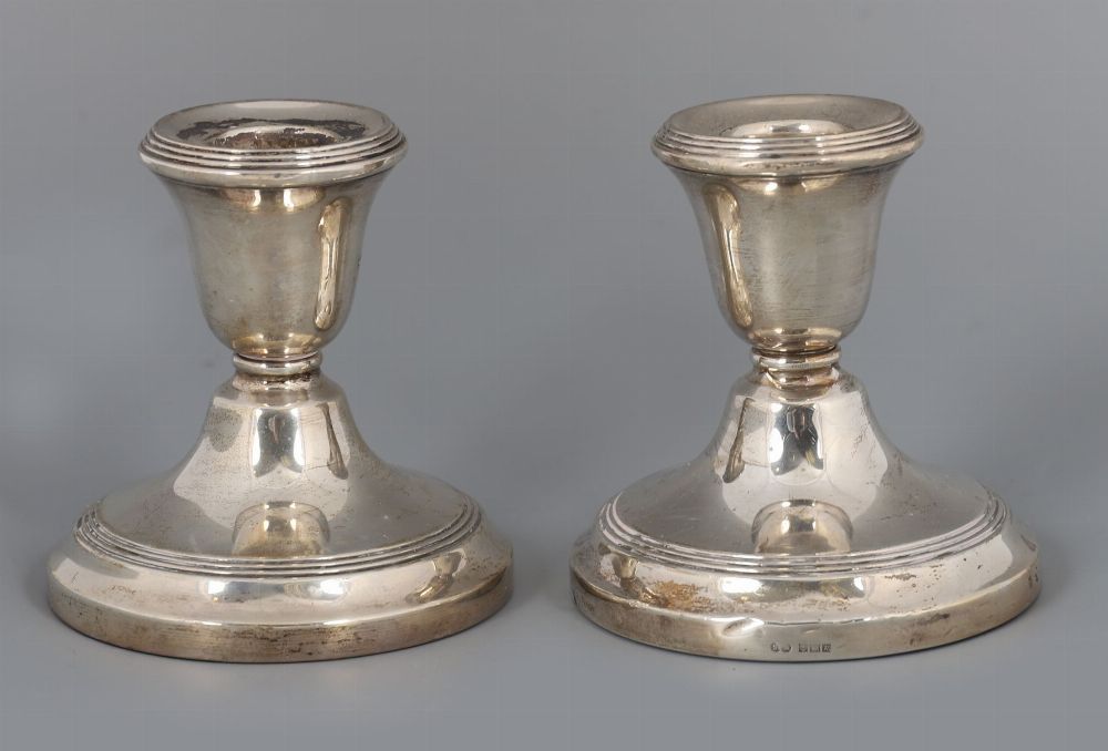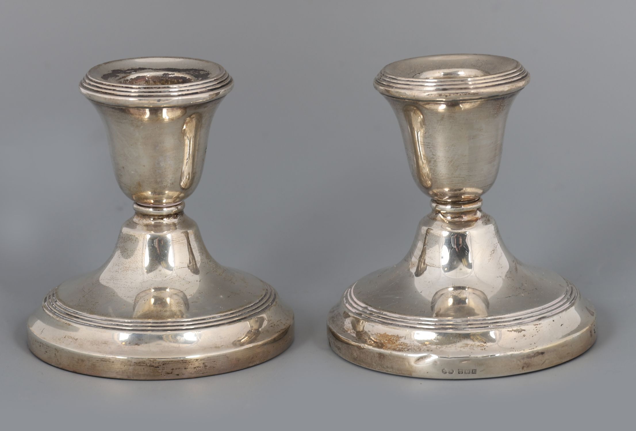 A pair of silver candlesticks of plain circular form with reeded rims, hallmarked Birmingham. Weighted bases.