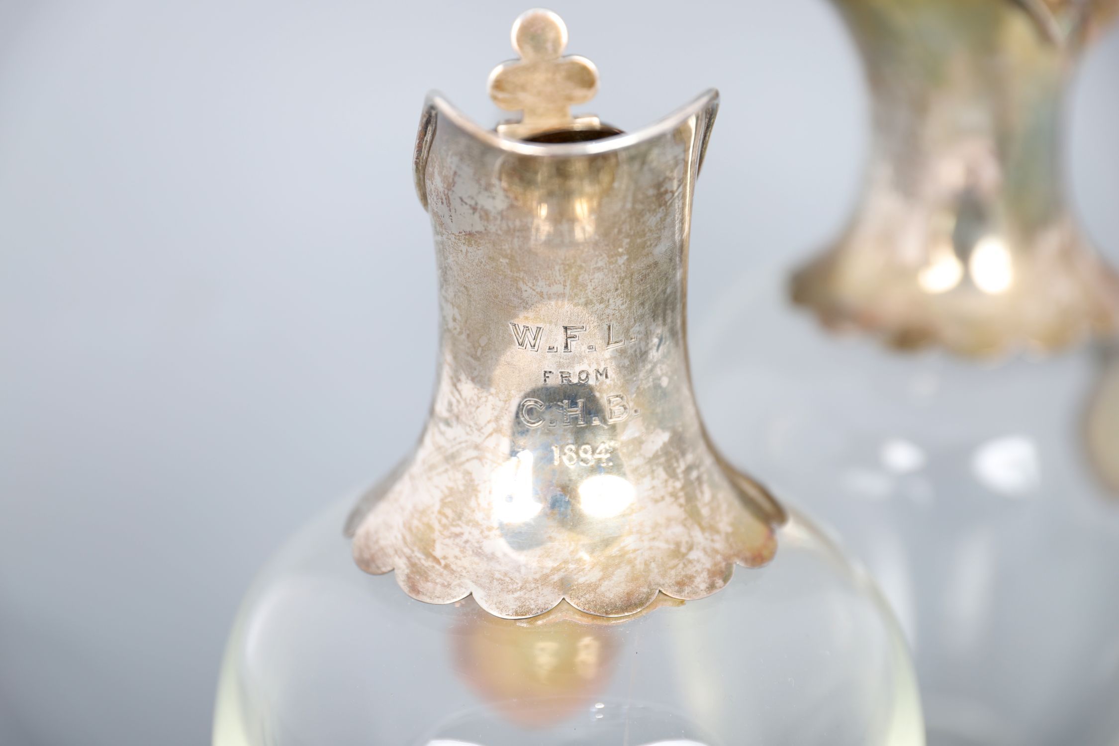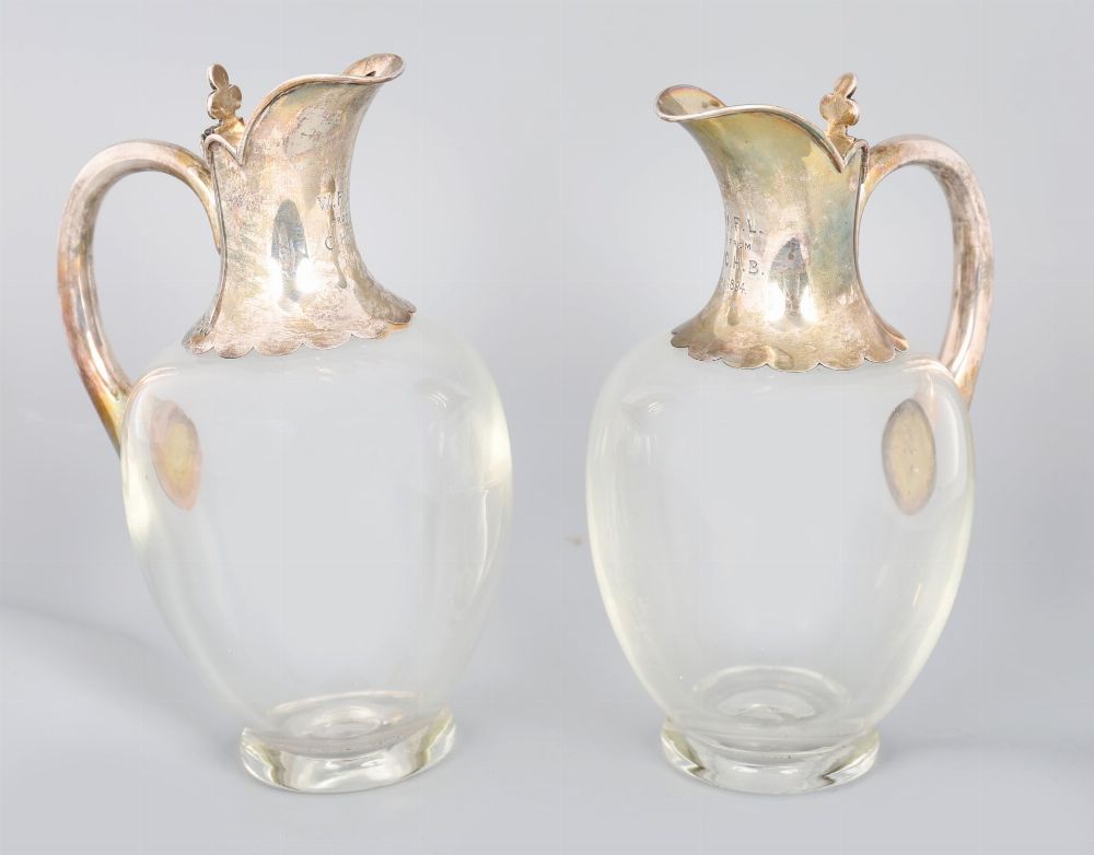 A fine pair of late Victorian glass claret jugs with silver mounts, hallmarked London 1894. Each with ovoid clear glass body, spreading foot, and elegant silver mounts with scroll handles and shaped spouts, the mounts engraved with a scalloped border.