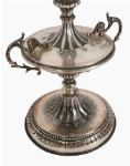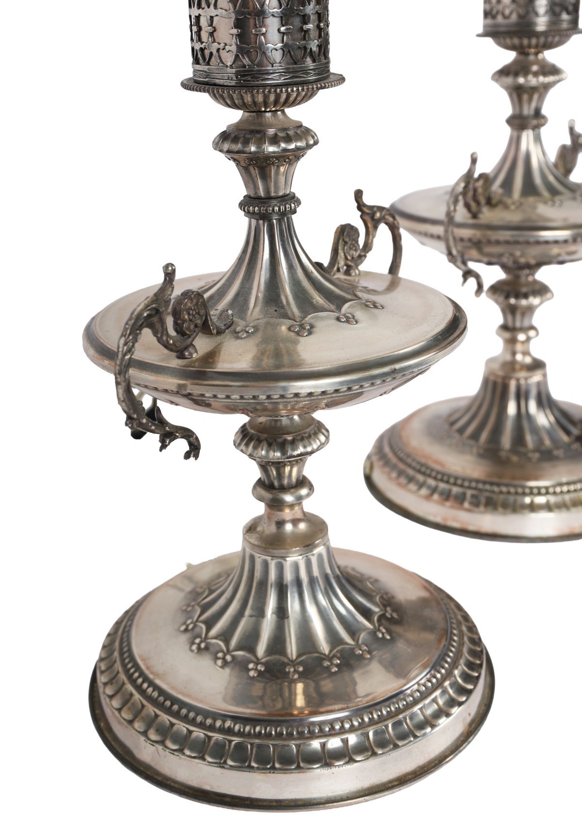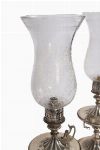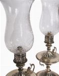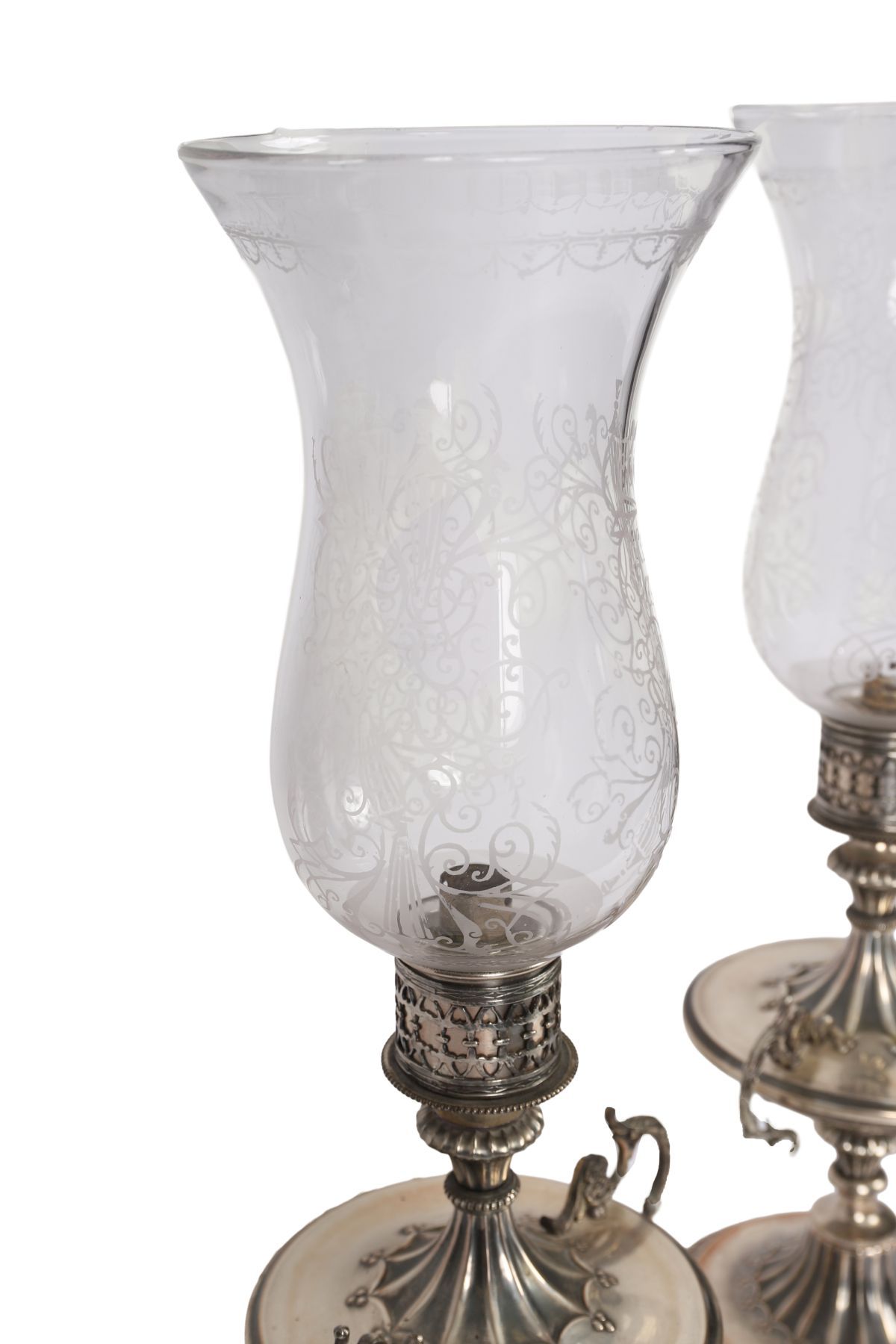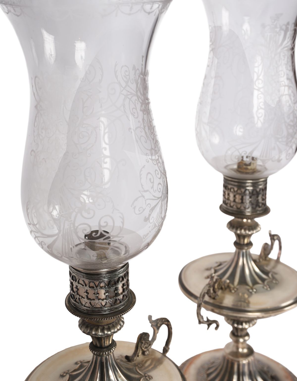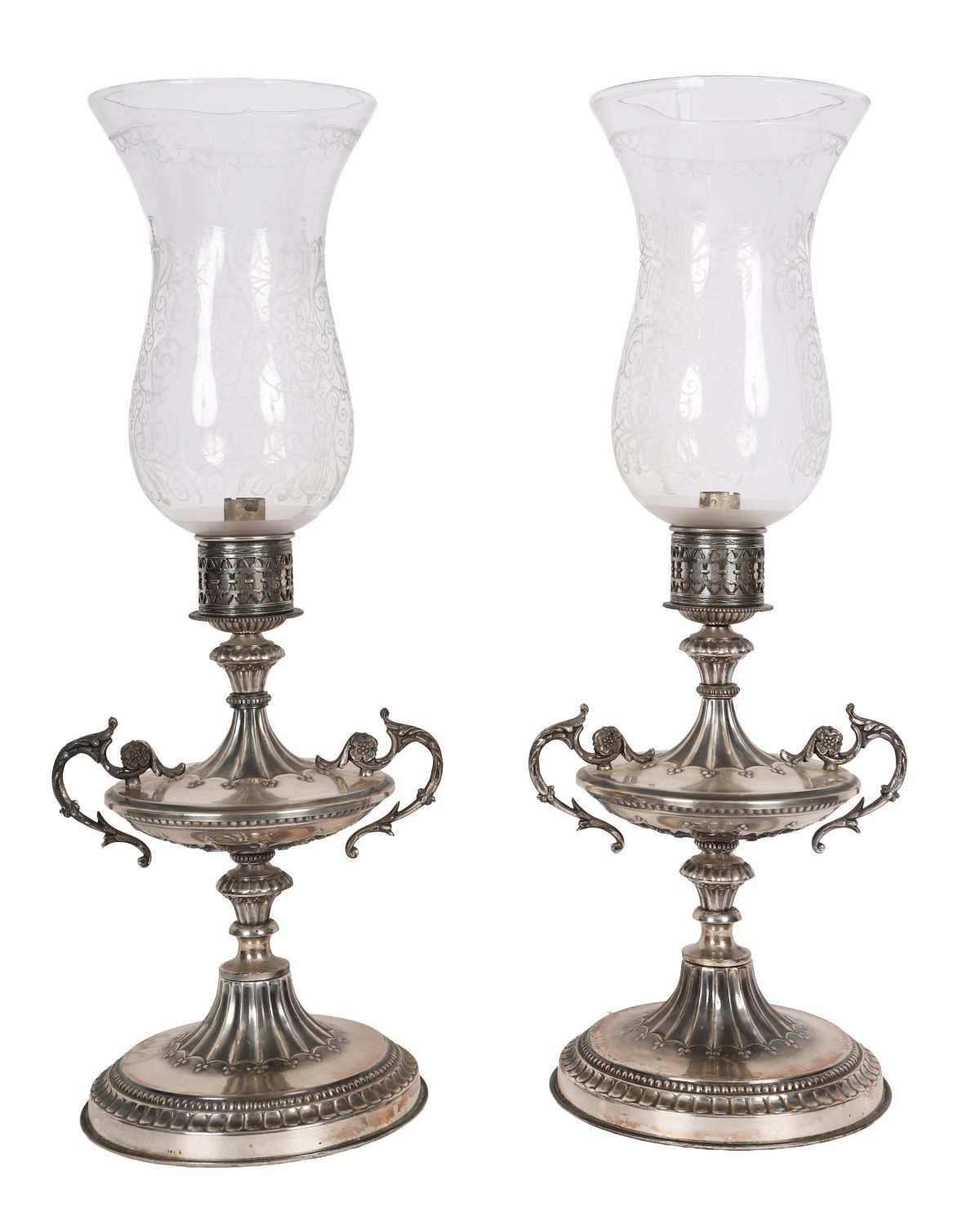 A pair of silver-plated table lamps with etched glass hurricane shades, the reeded bases with twin handles and beaded rims, converted for electricity.