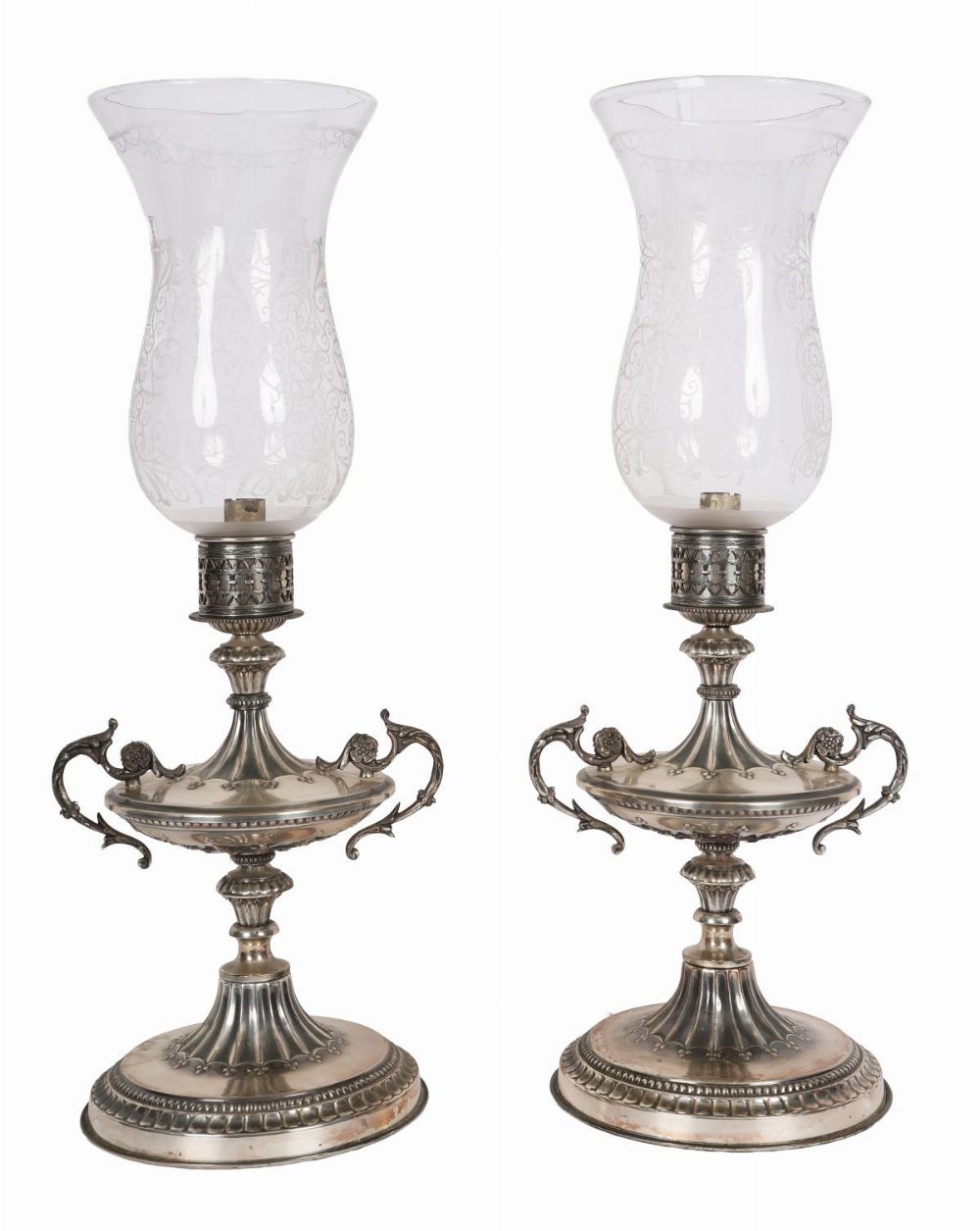 Lot 353 PAIR OF SILVER-PLATED AND GLASS TABLE LAMPS, EARLY 20TH CENTURY