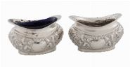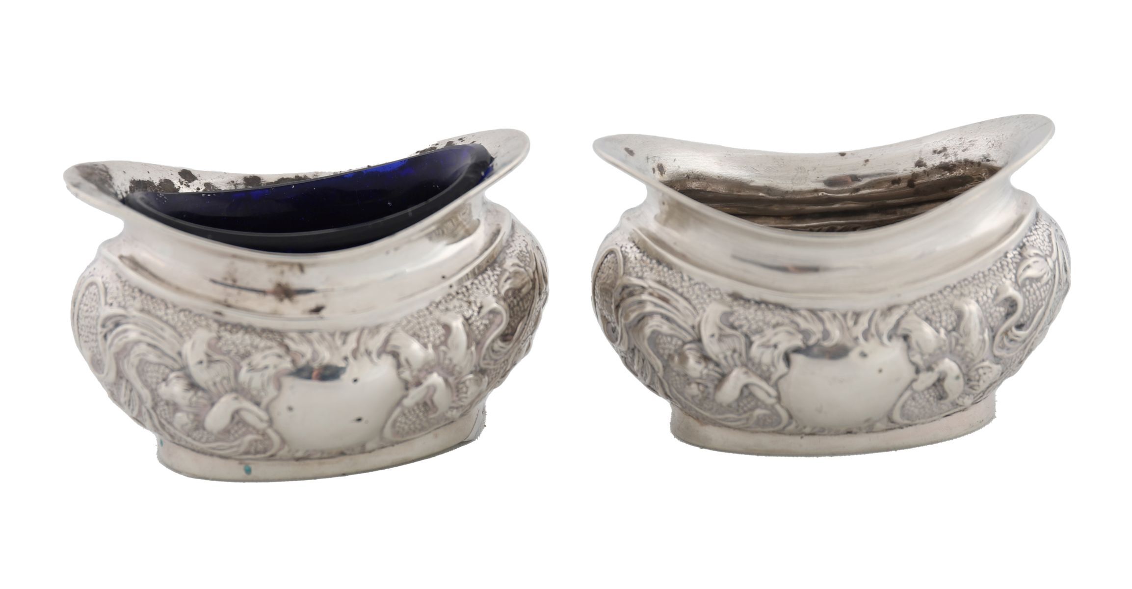 Lot 599 PAIR OF SILVER SALT CELLARS WITH BLUE GLASS LINERS