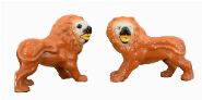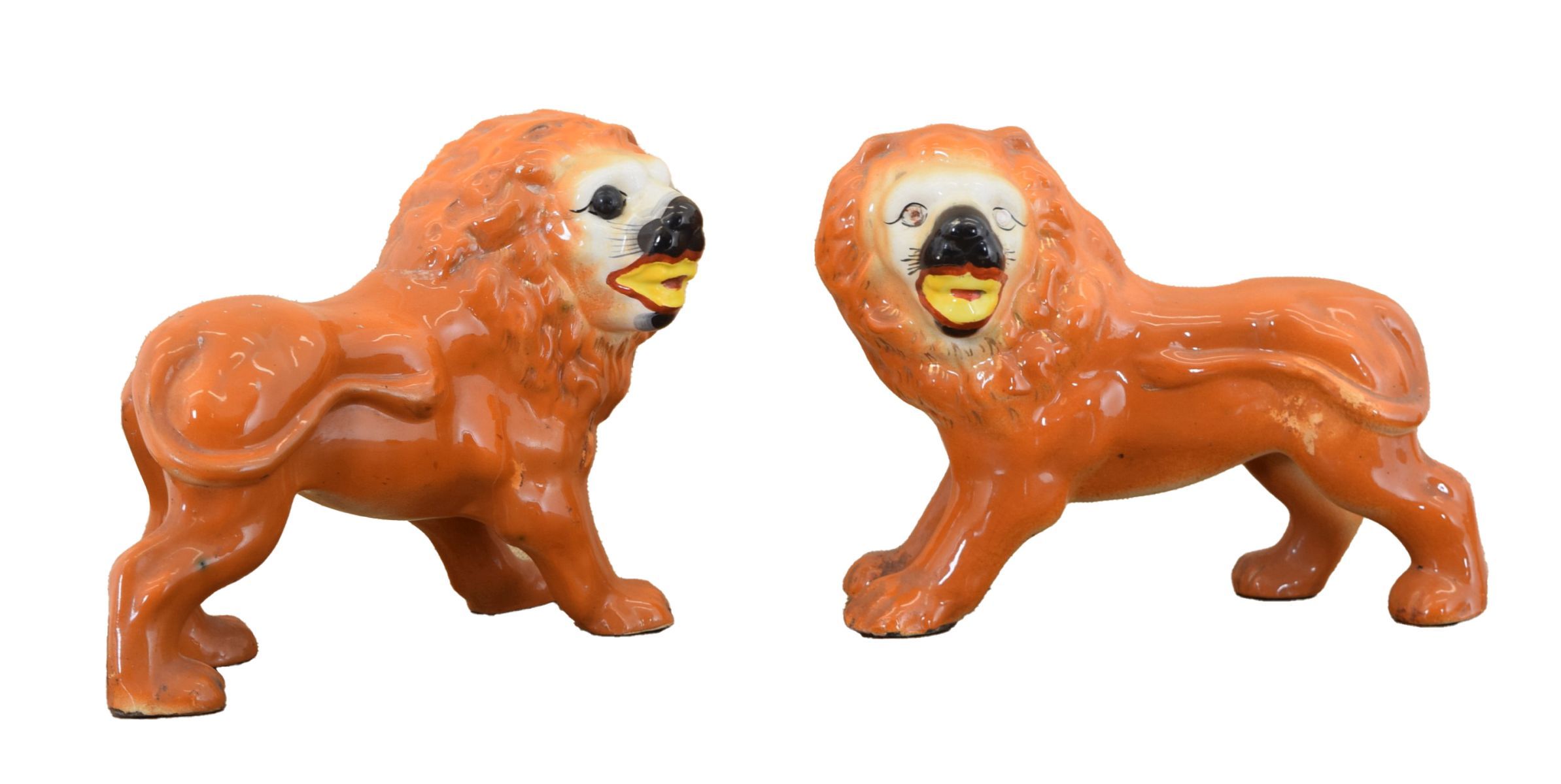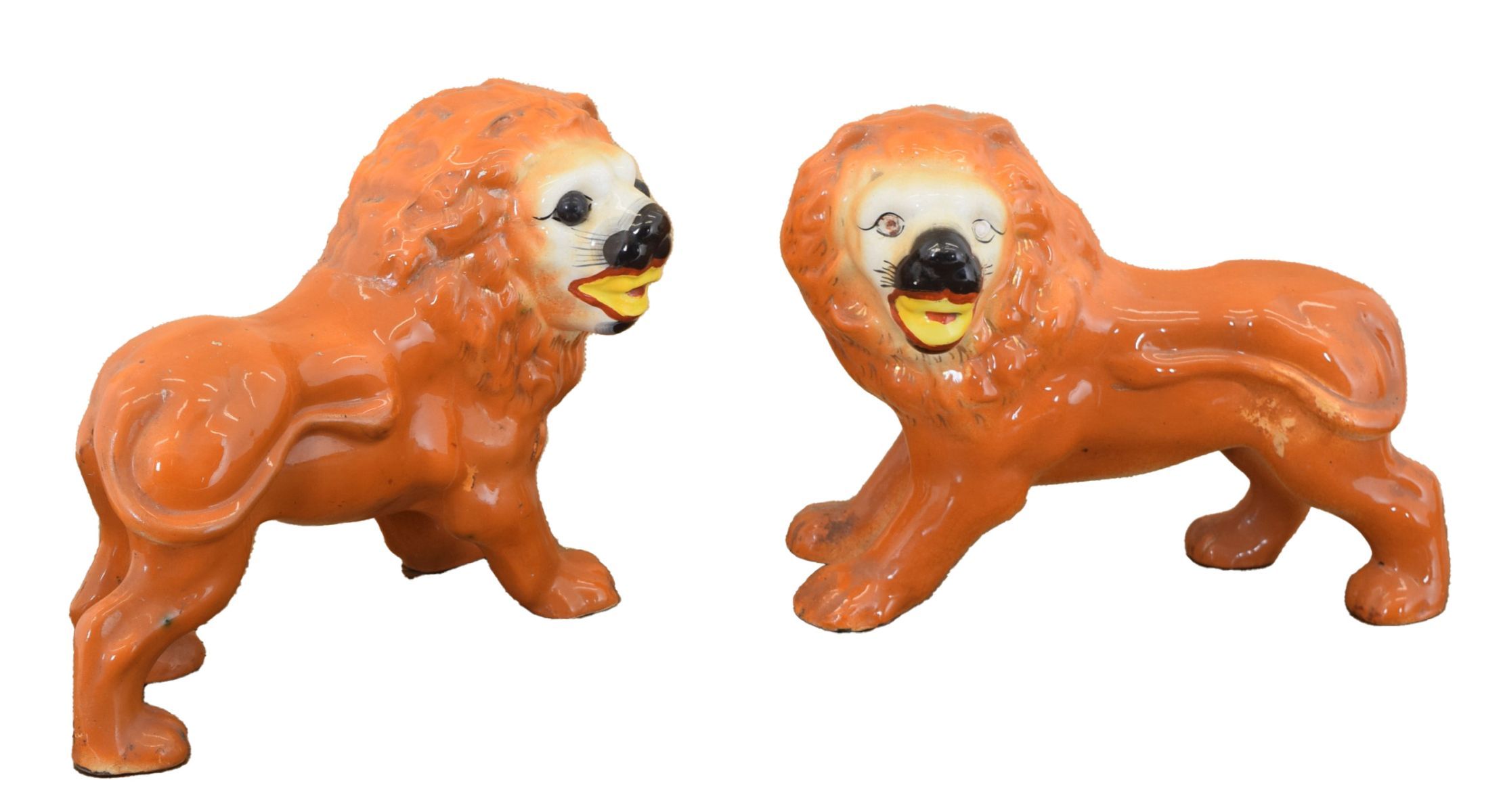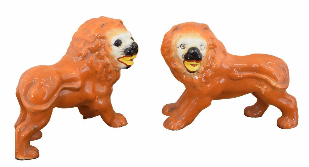 each depicting a lion with inset glass eyes; a decorative Victorian mantelpiece pair.