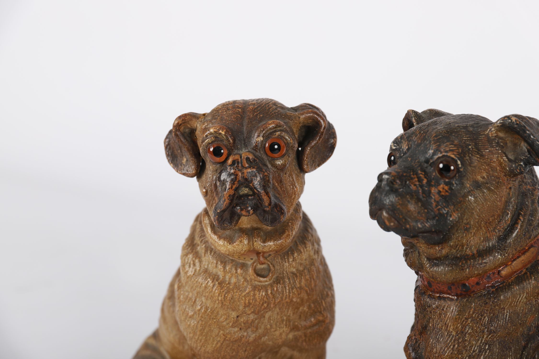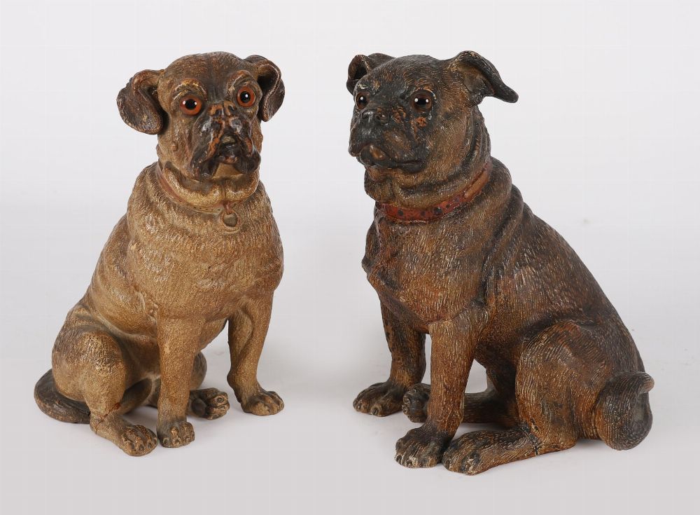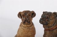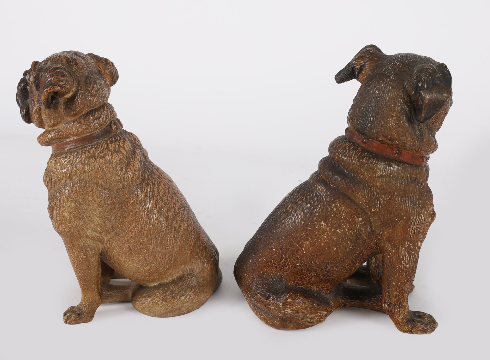 A charming pair of late 19th to early 20th-century terracotta pug dogs, naturalistically modelled with expressive features and painted details, seated in attentive poses. Each with painted eyes and dark collars, retaining a fine patina and minor age-related wear.